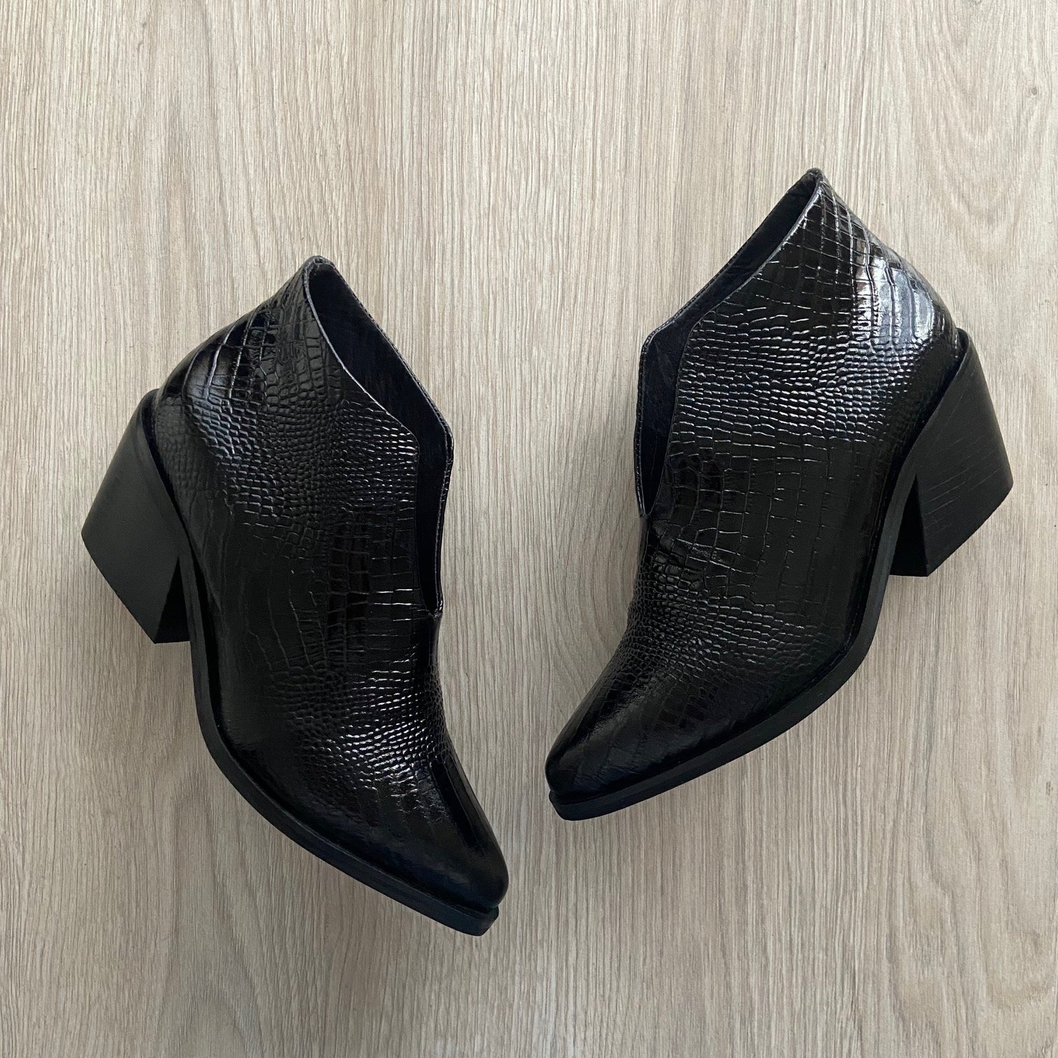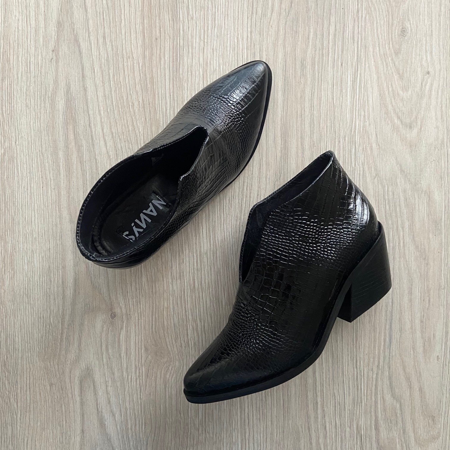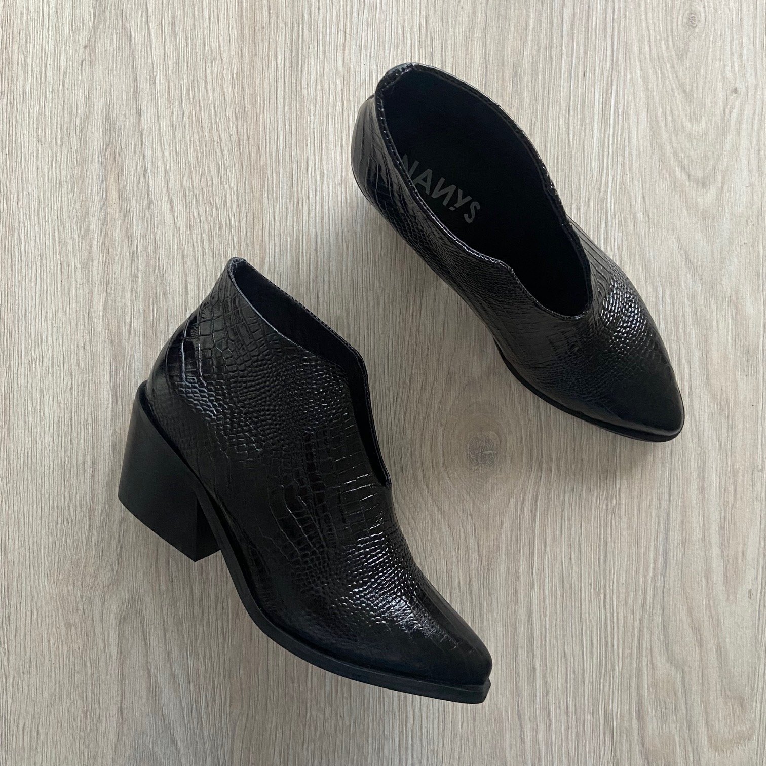 Botines negro en cuero con abertura. Tacón 5.5 cm. Forradas en cuero. Hechas en Colombia.