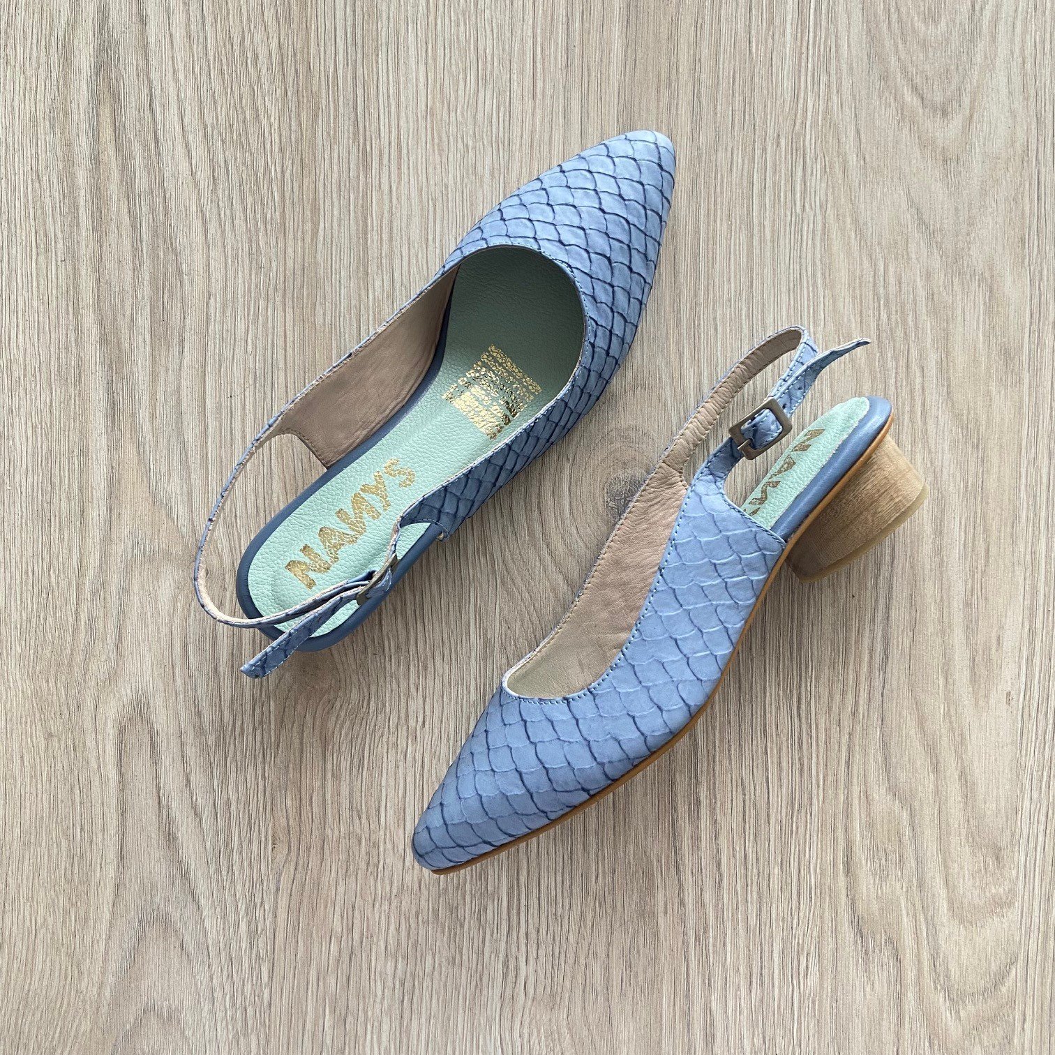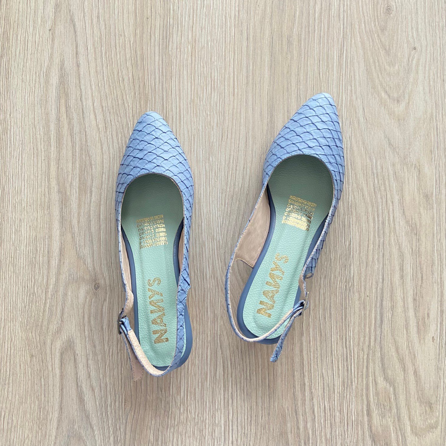 Baleta azul hortensia en cuero. Tacón 2.5 cm. Hebilla para graduar. Forrados en cuero. Hecho en Colombia.