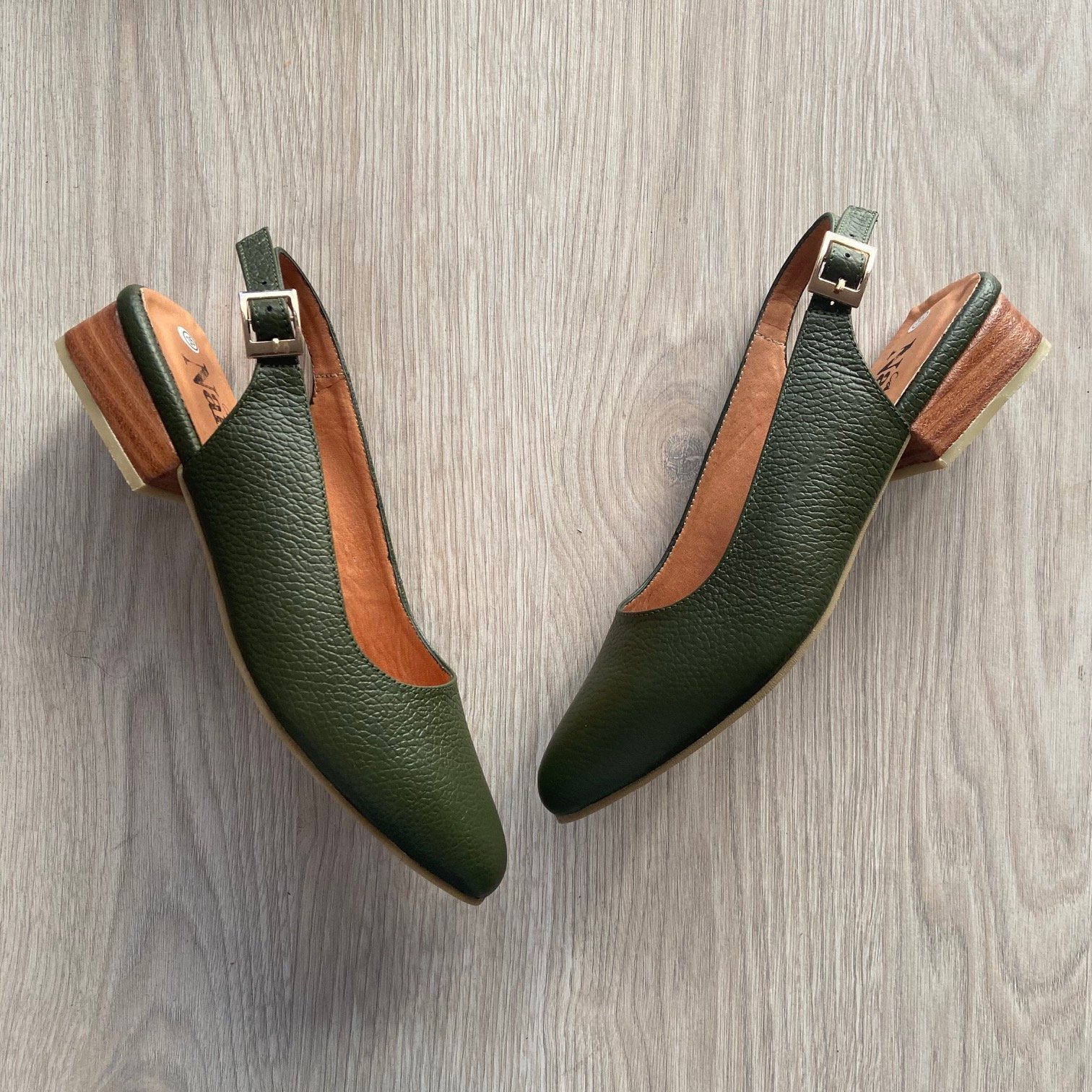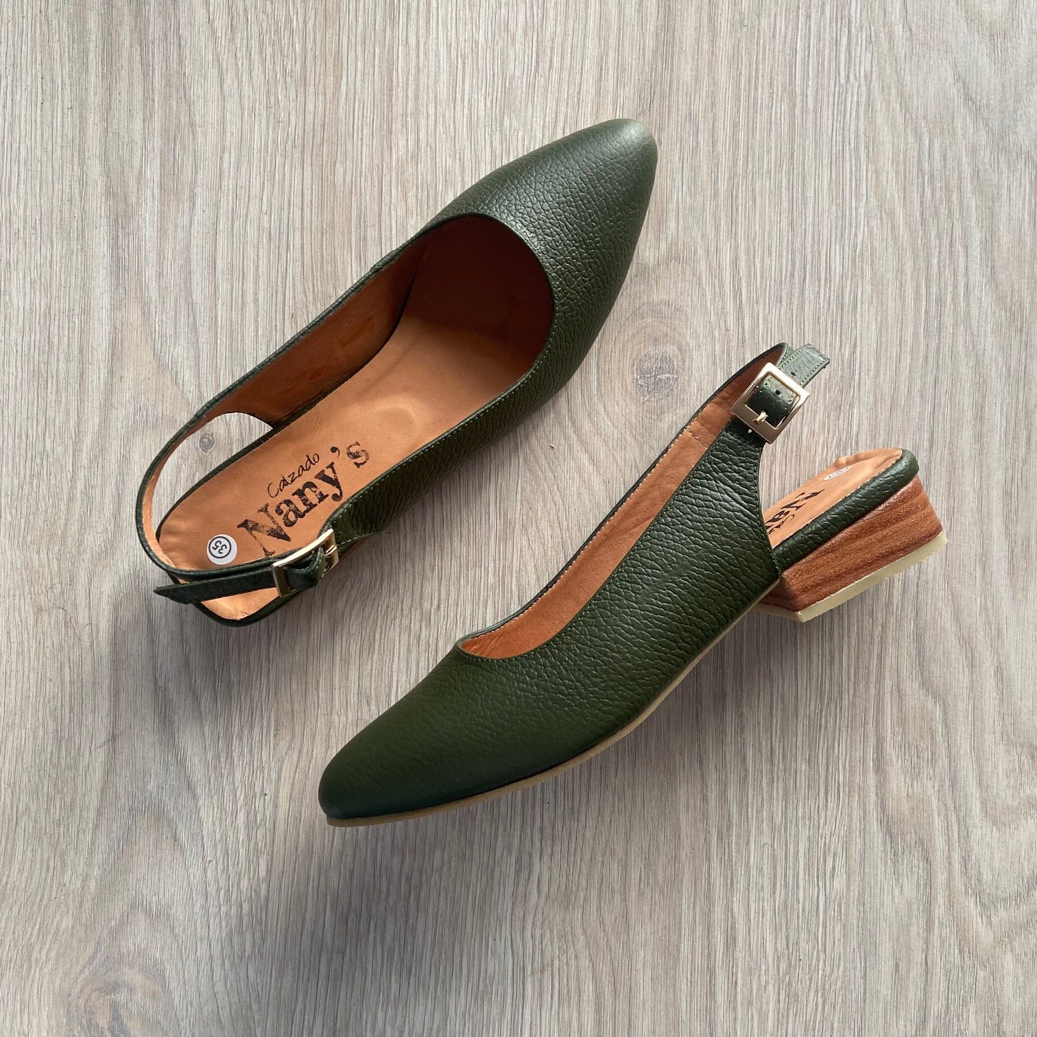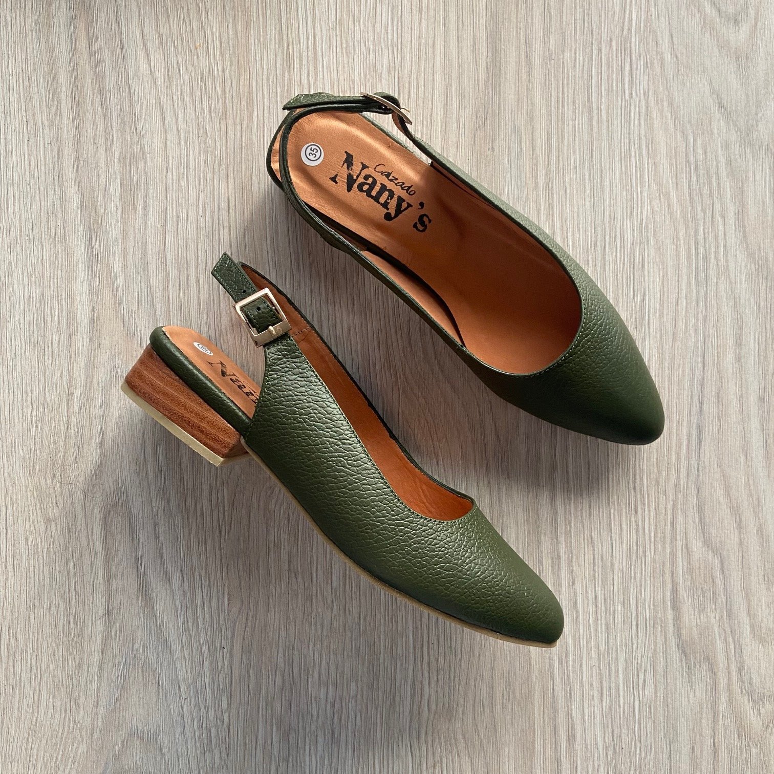 Baleta verde militar en cuero. Forradas en cuero. Con hebilla. Suela en Goma. Tacón 2.5, forrado en vira. Hechas en Colombia.