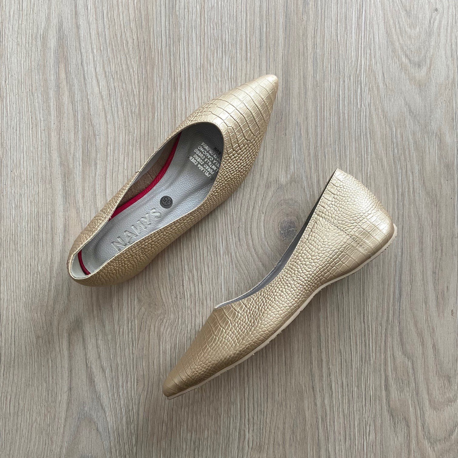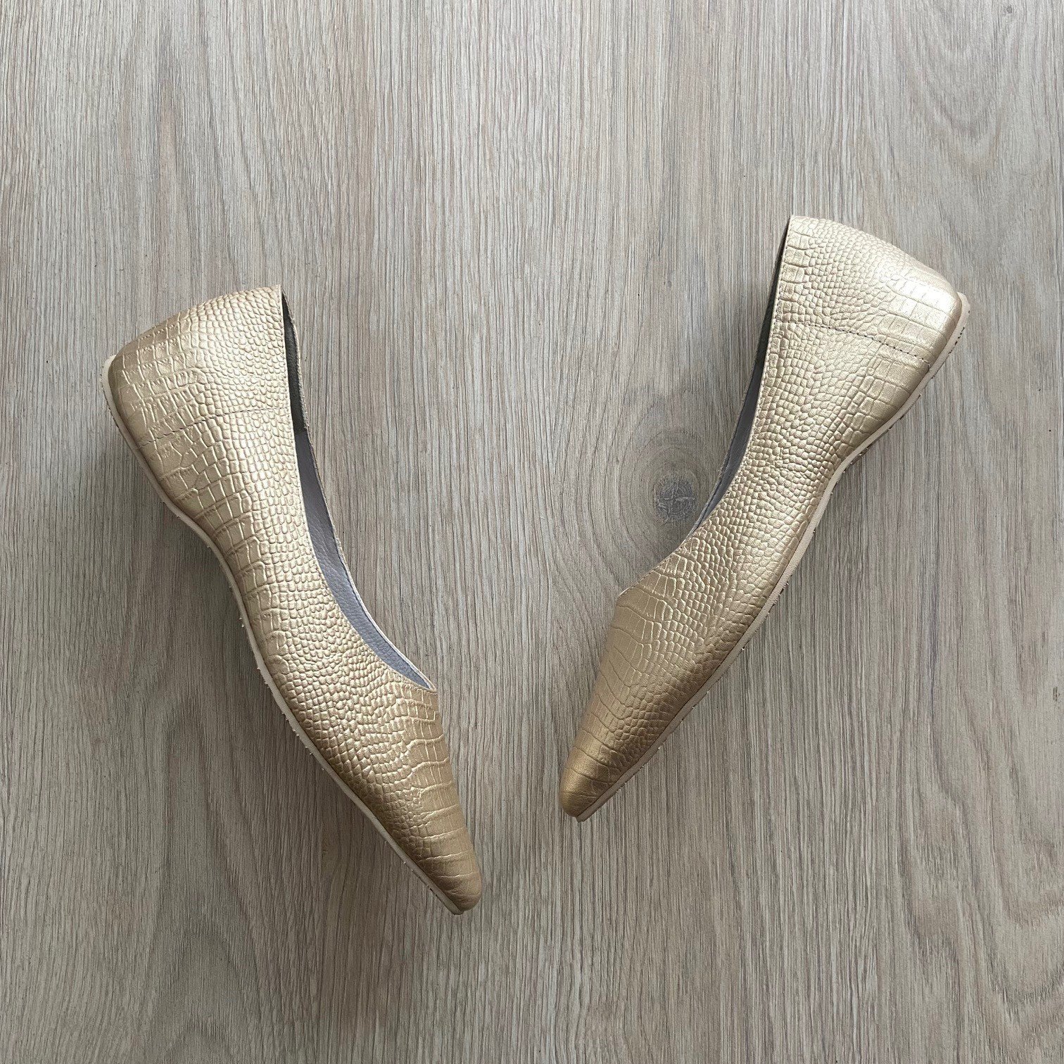 Baletas doradas en cuero con tacón interno 1.5. Suela en goma. Forradas en cuero. Hechas en Colombia.