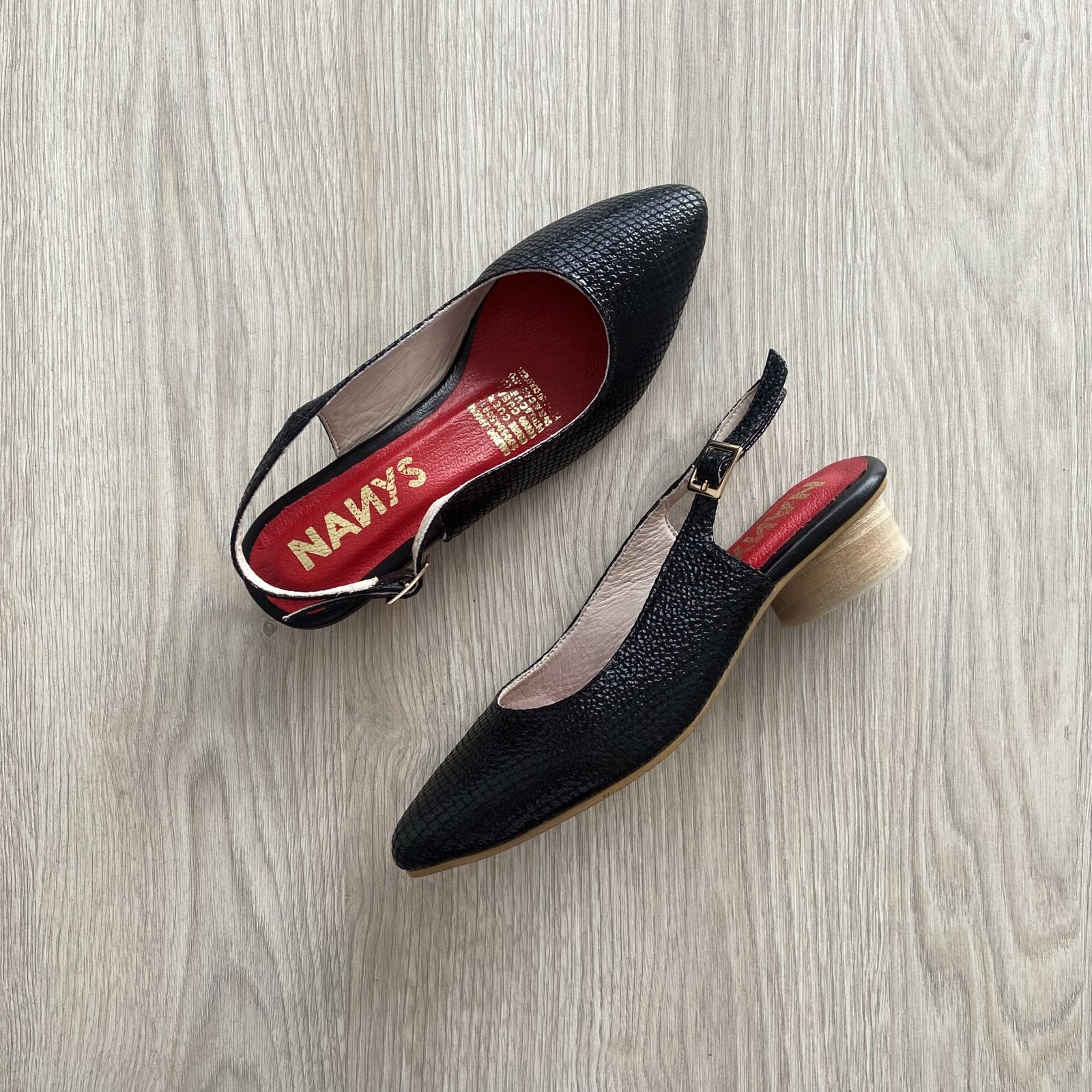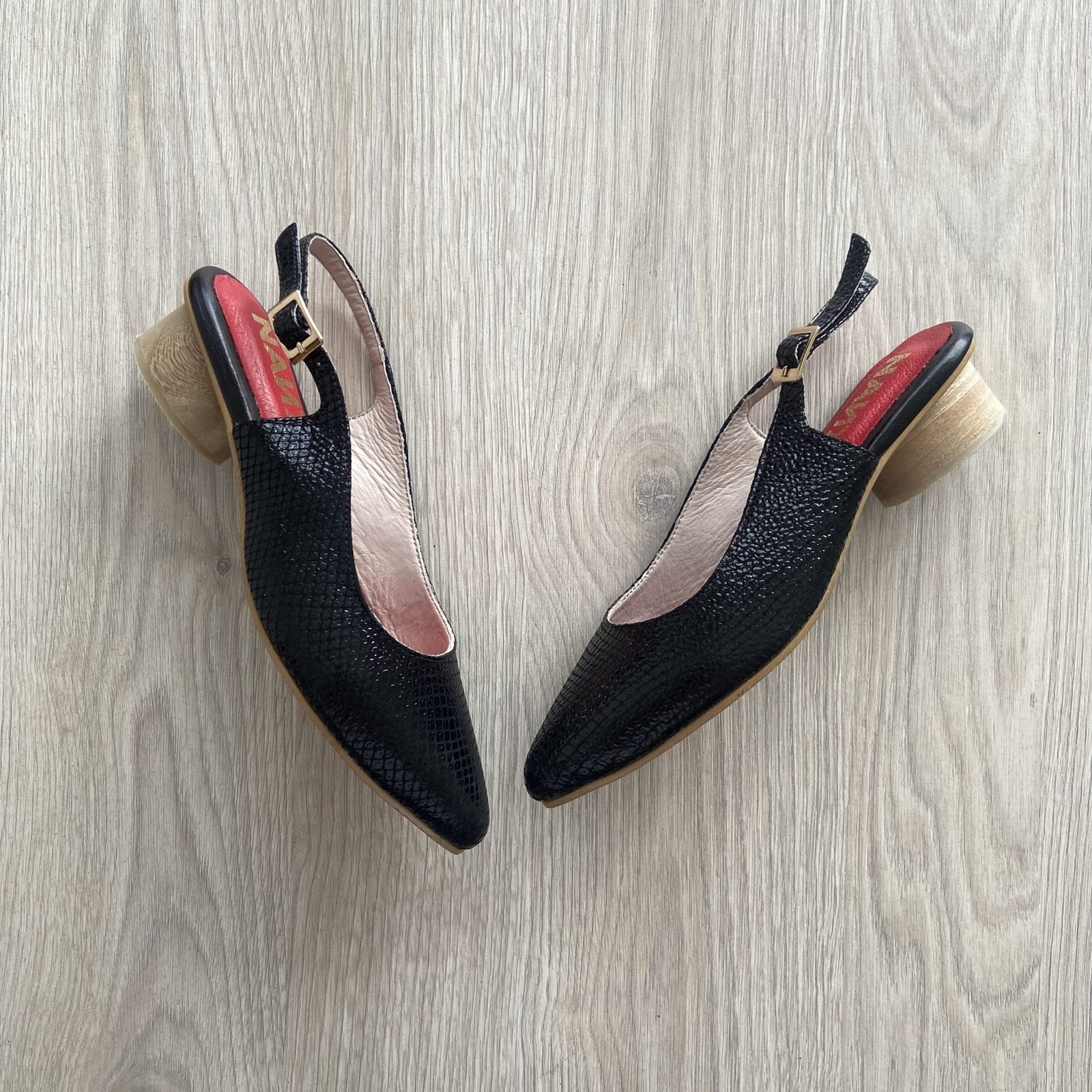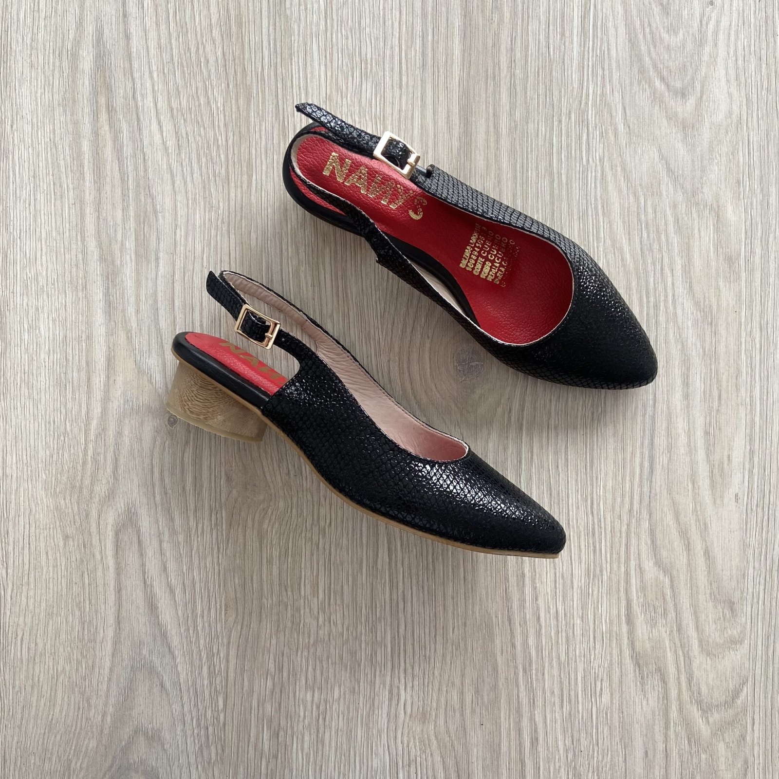 Baletas negras en cuero con hebilla. Tacón 2.5 cm en madera y tapa en goma. Forrados en cuero. Hechos en Colombia.