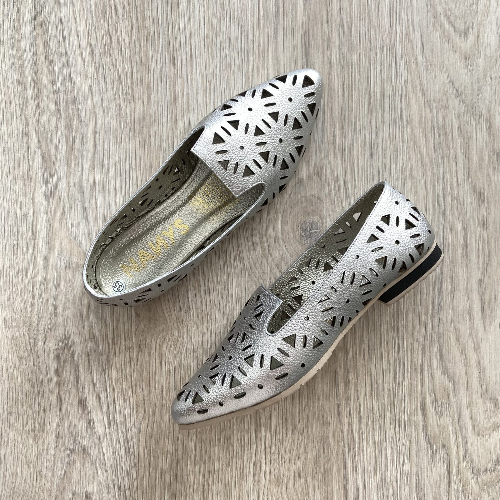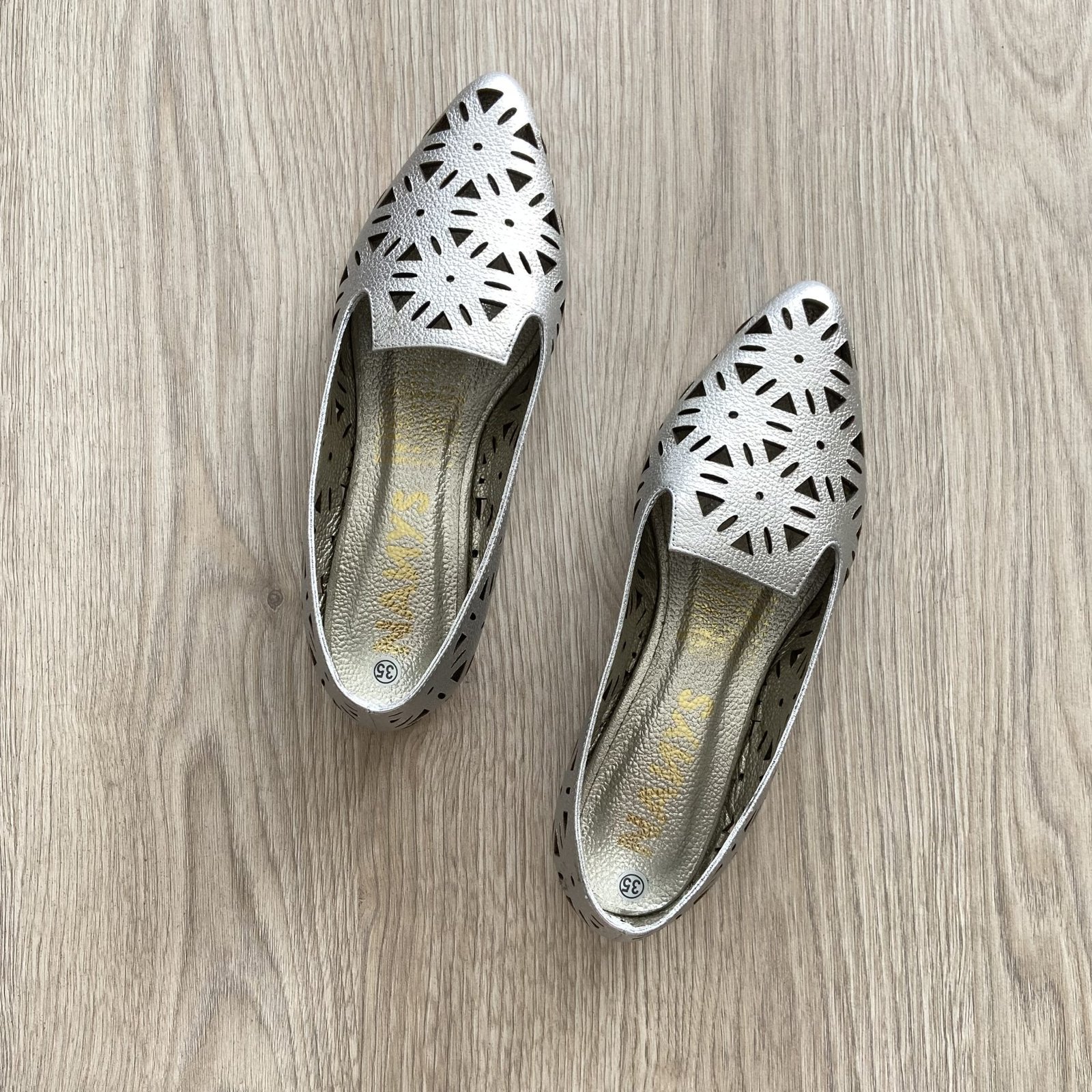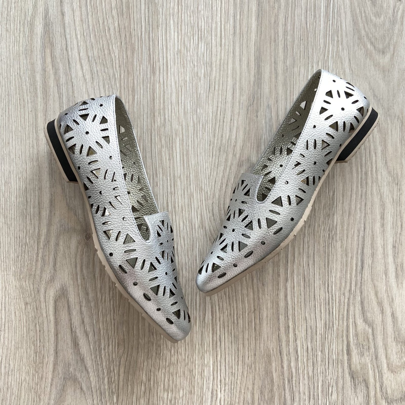 Baletas plateadas en cuero con laser. Forrados en cuero. Tacón 1.5 cm. Suela en goma antideslizante. Hechos en Colombia.