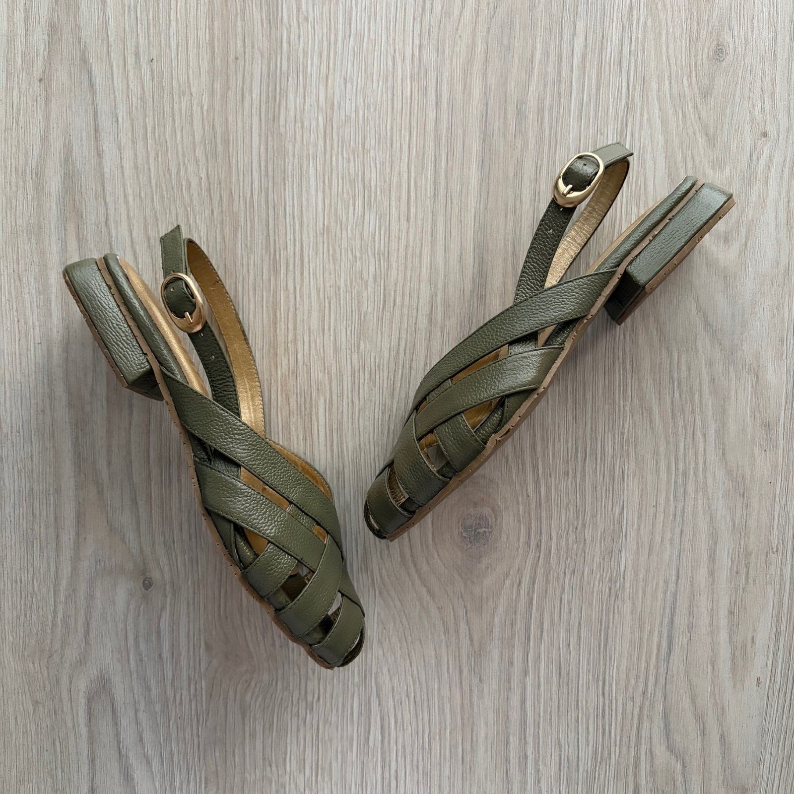 Baletas verde en cuero tipo canasta. Tacón 1.5. Con hebilla. Forradas en cuero. Hechas en Colombia.