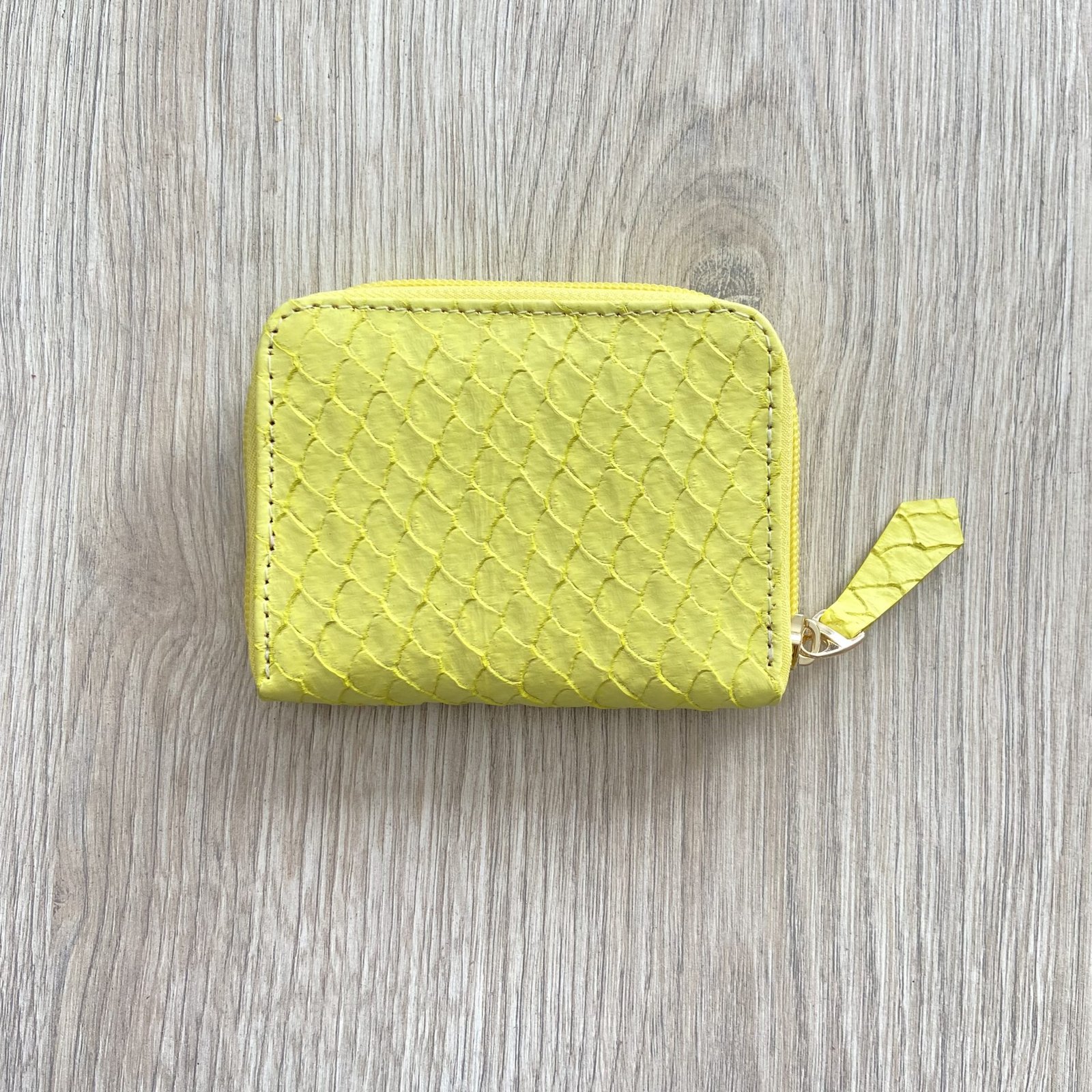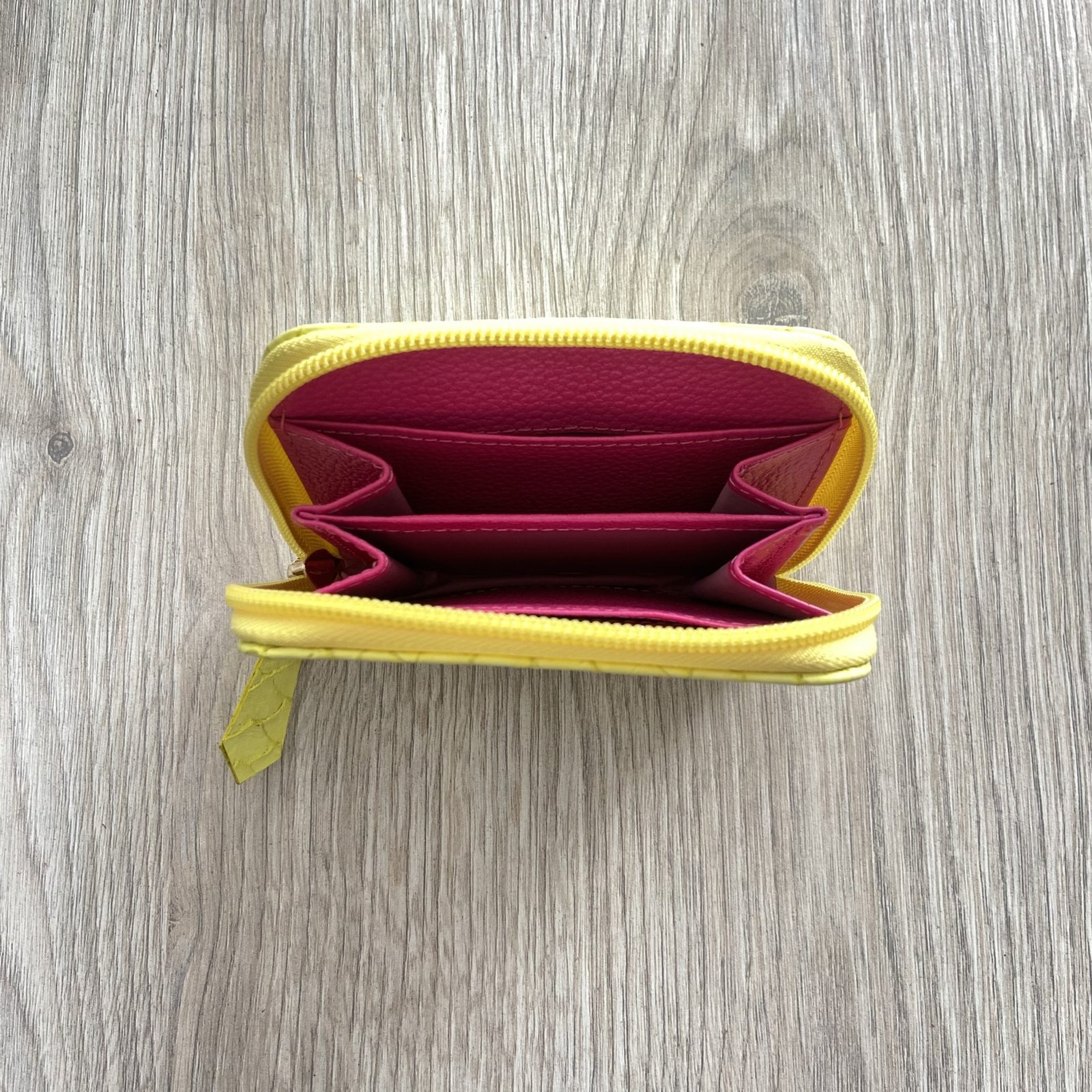 Billetera amarilla con cremallera en cuero tipo folia. Cuero interno color fucsia. Con varios compartimientos para documentos y cremallera. Medidas: 11.5 cm largo x 9 cm alto x 2 cm fondo. Hechas en Colombia.