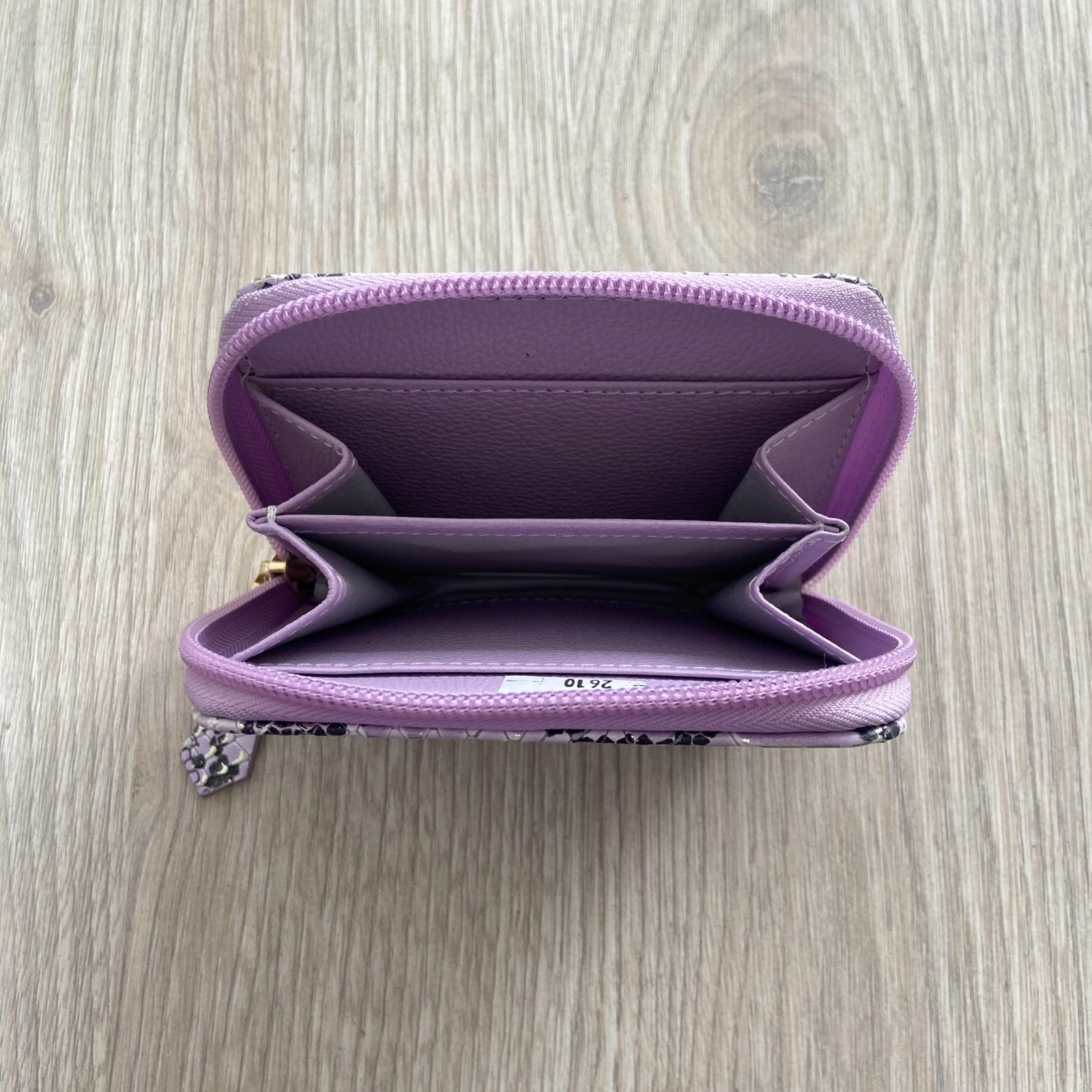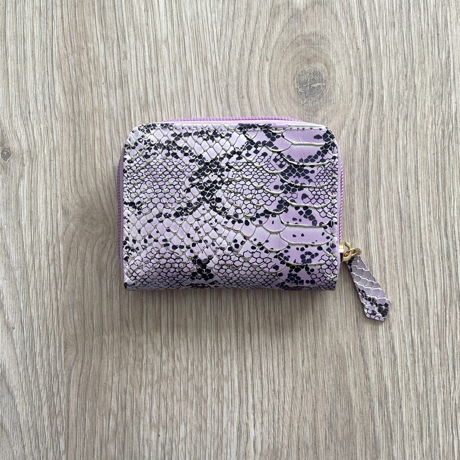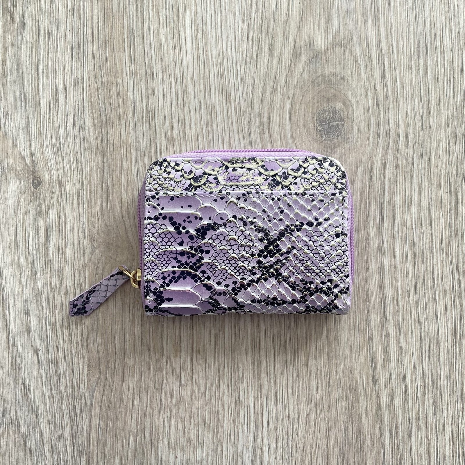Billetera lila con cremallera en cuero tipo folia. Con varios compartimientos para documentos y cremallera. Medidas: 11.5 cm largo x 9 cm alto x 2 cm fondo. Hechas en Colombia.