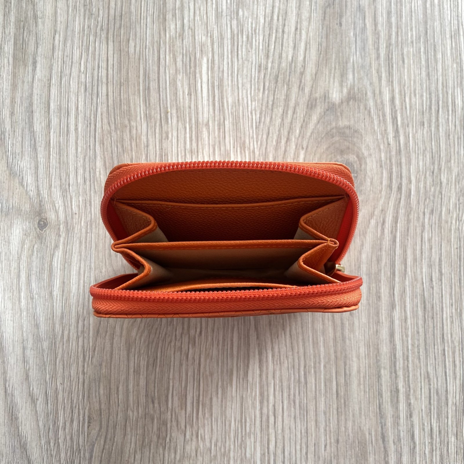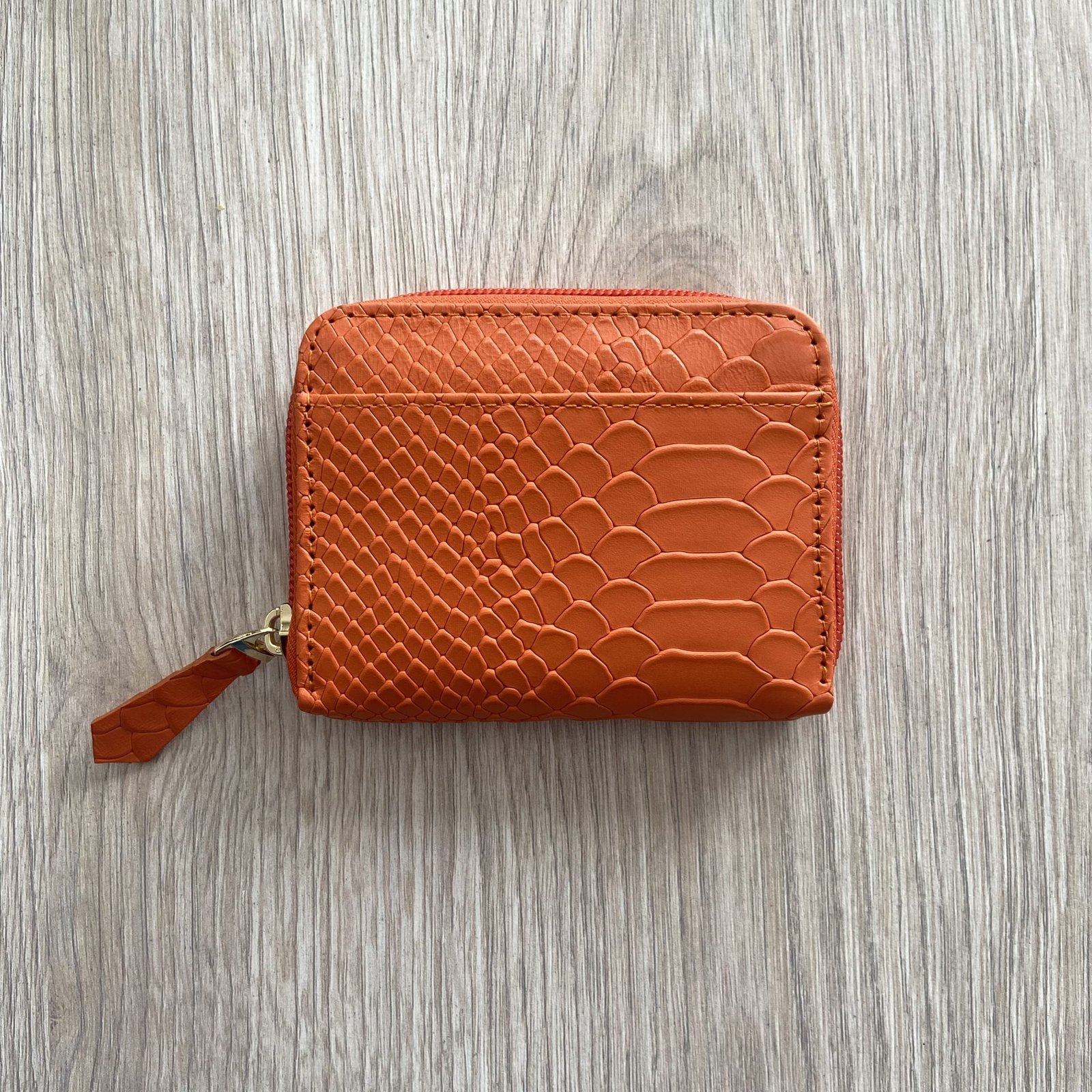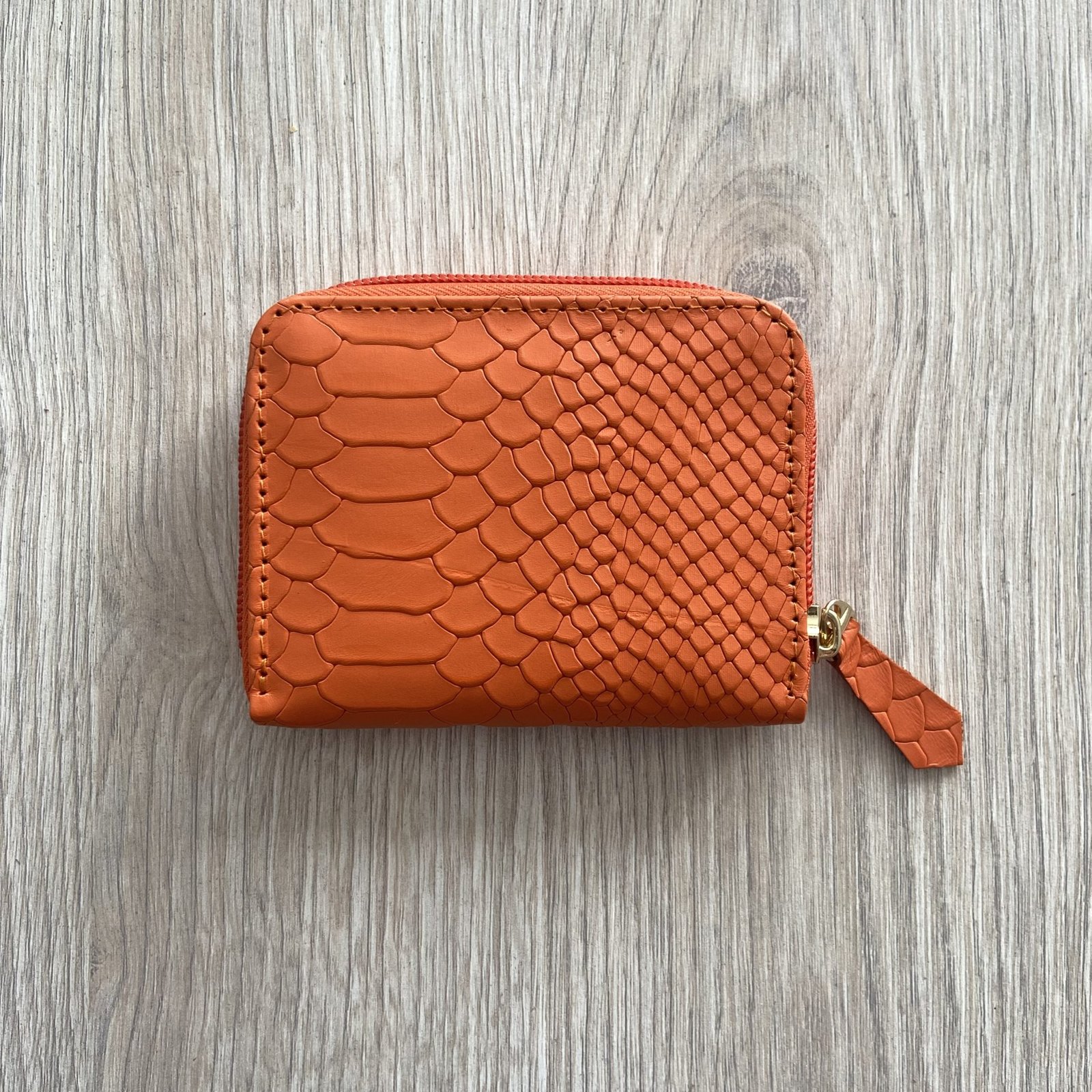 Billetera naranja con cremallera en cuero