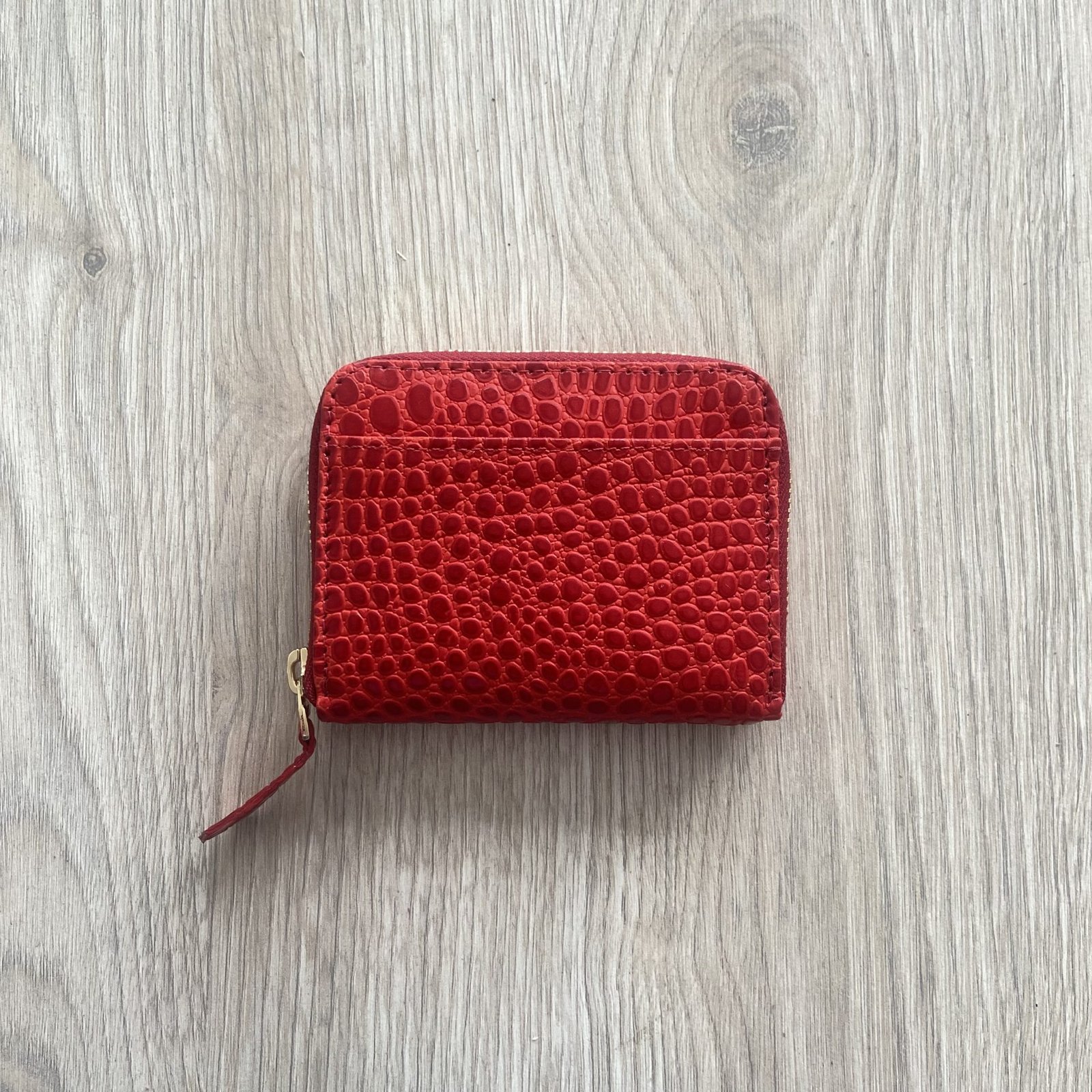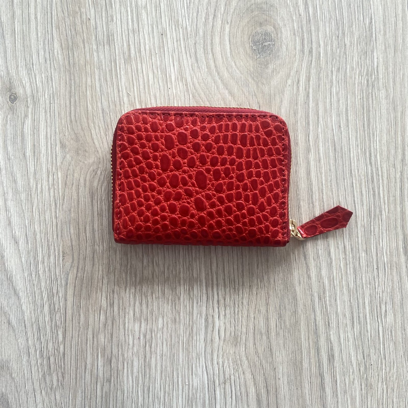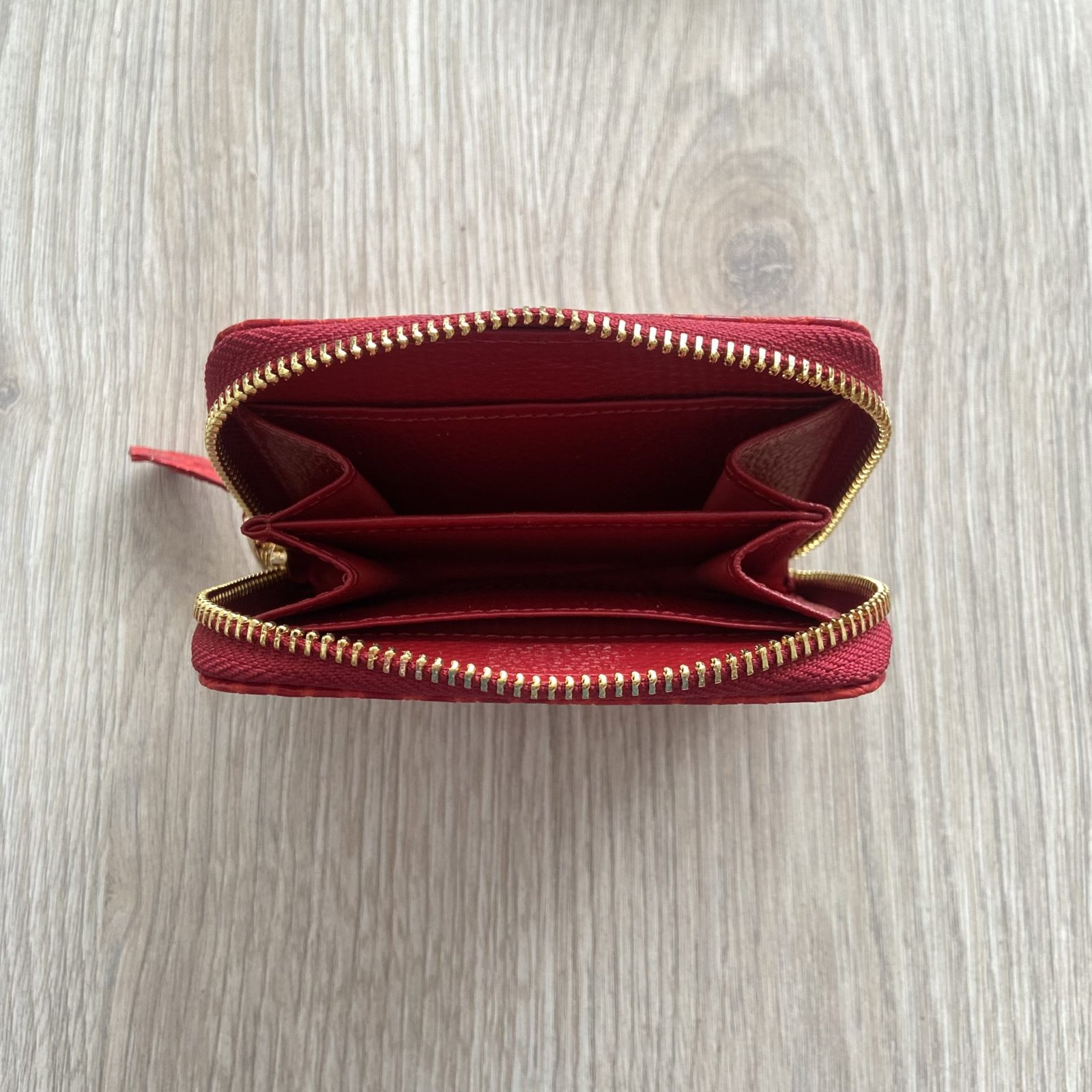 Billetera roja con cremallera en cuero tipo folia. Con varios compartimientos para documentos y cremallera. Medidas: 11.5 cm largo x 9 cm alto x 2 cm fondo. Hechas en Colombia.