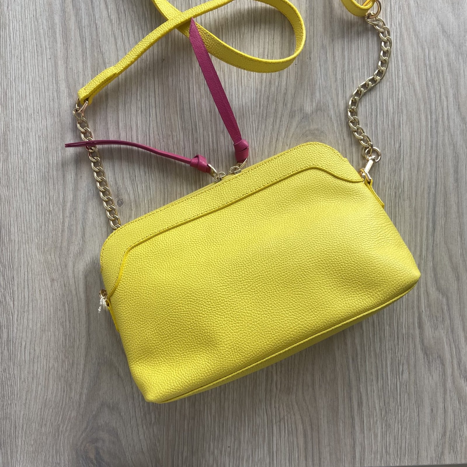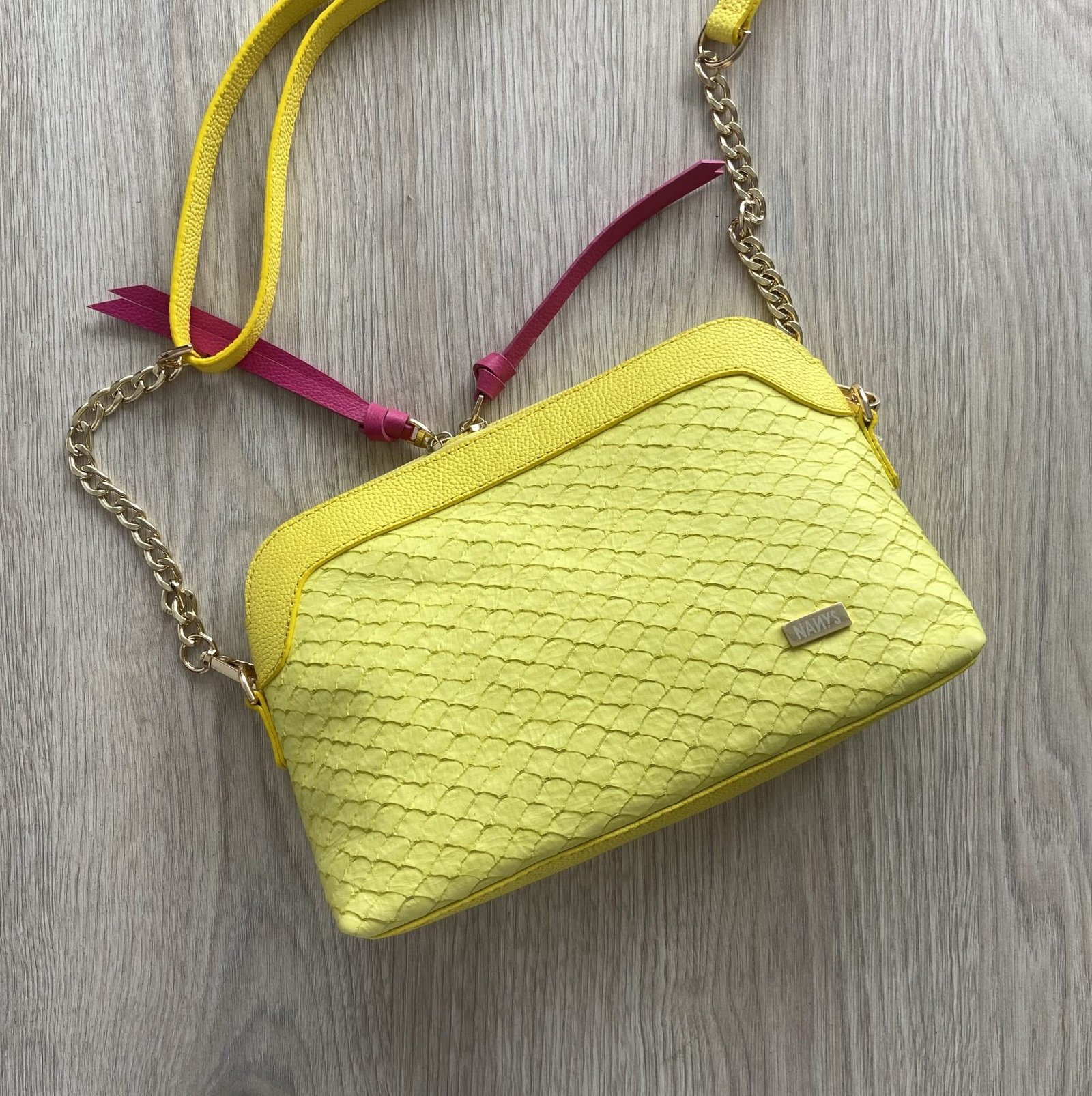 Bolso amarillo en cuero tipo folia con cadena. Compartimientos con cremallera. Tira larga graduable y removible. Medidas: 23 cm x 16 cm x 8 cm. Hecho en Colombia.