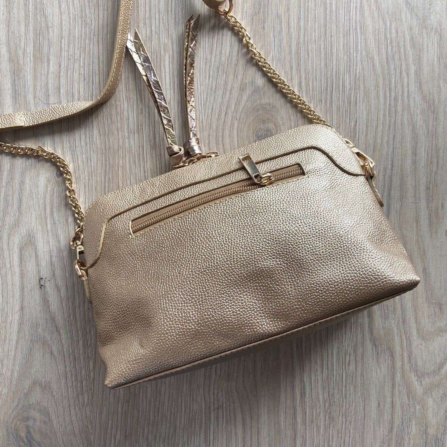 Bolso dorado con bronce en cuero tipo folia con cadena. Compartimientos con cremallera. Tira larga graduable y removible. Medidas: 23 cm x 16 cm x 8 cm. Hecho en Colombia.