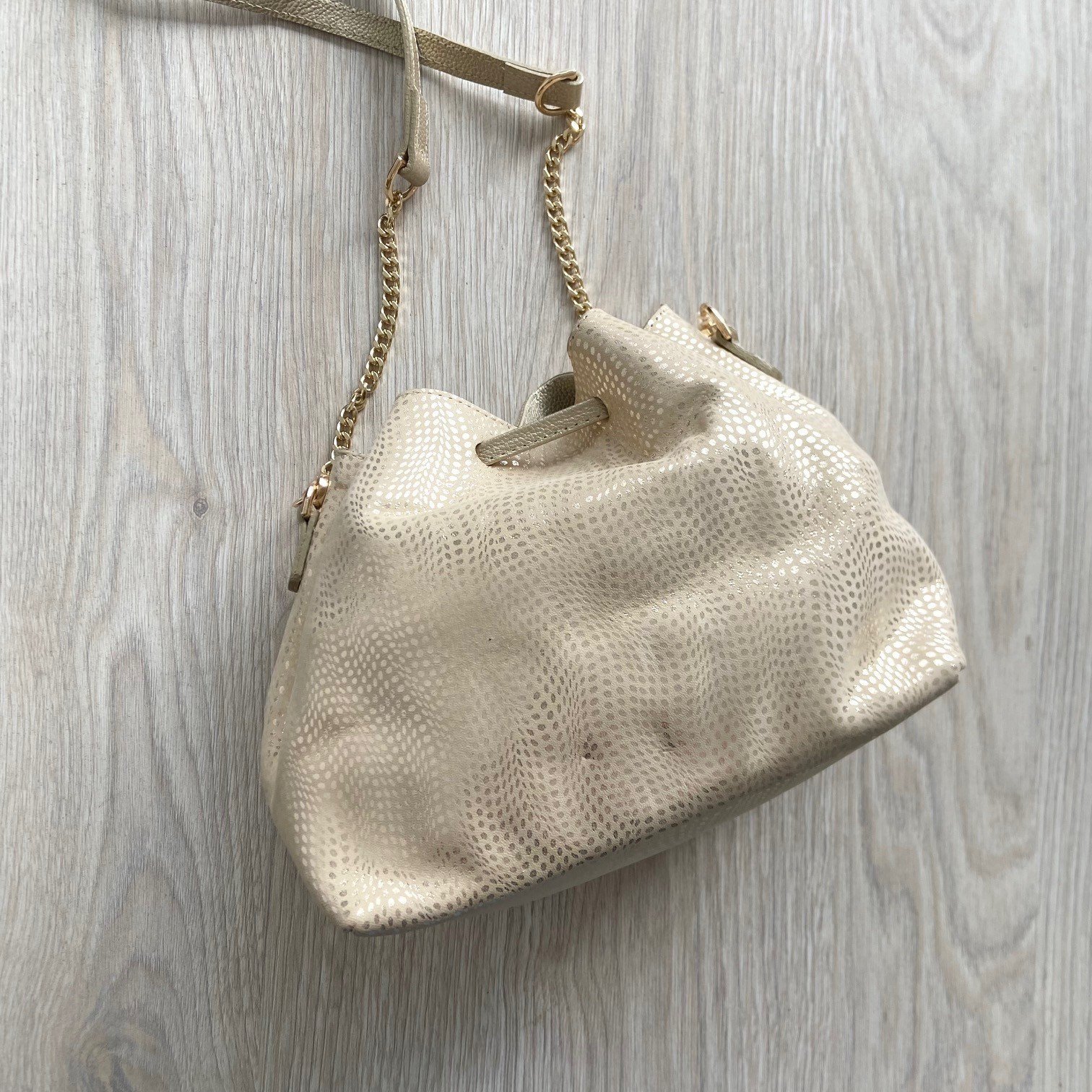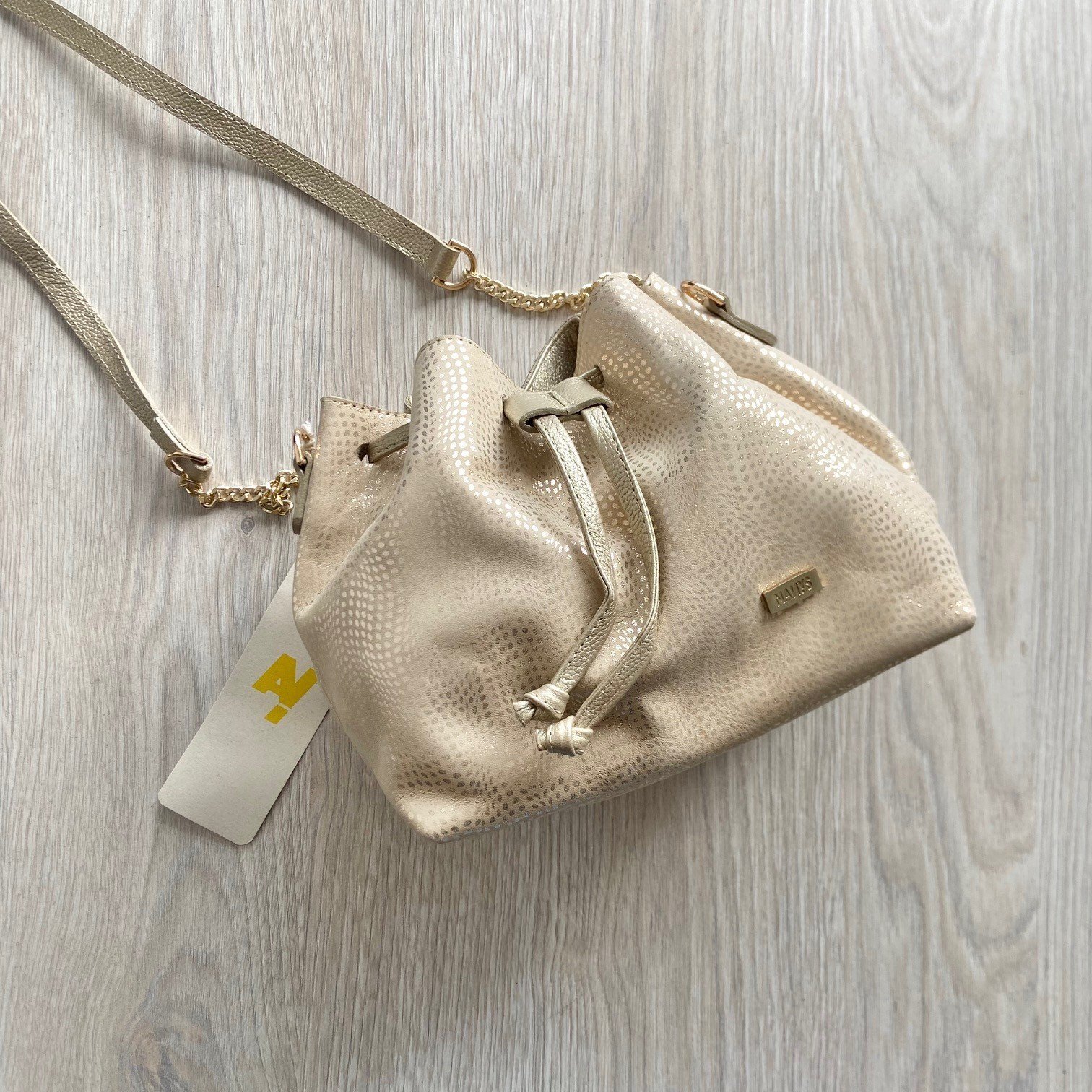 Bolso dorado en cuero tipo folia. Con tira larga removible. Tipo bolsa. Hechos en Colombia.