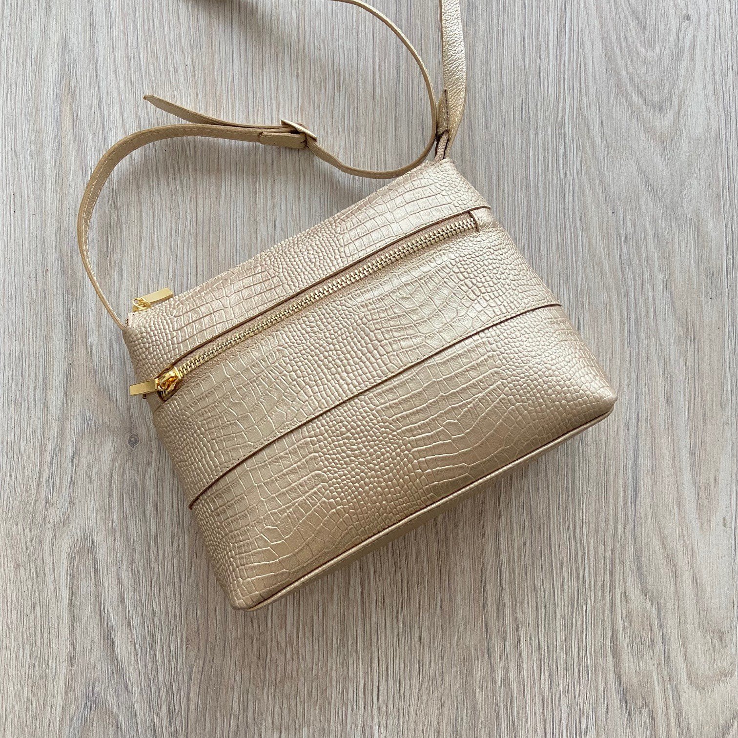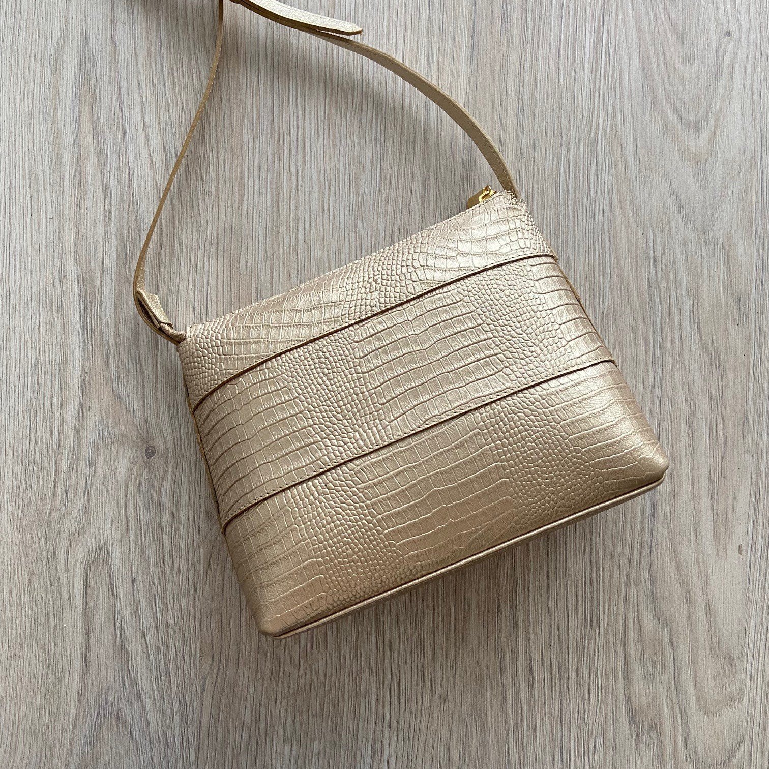 Bolso dorado en cuero tipo folia. Con un compartimiento grande y otro externo (Ambos con cremallera). Tira larga graduable. Hecho en Colombia.