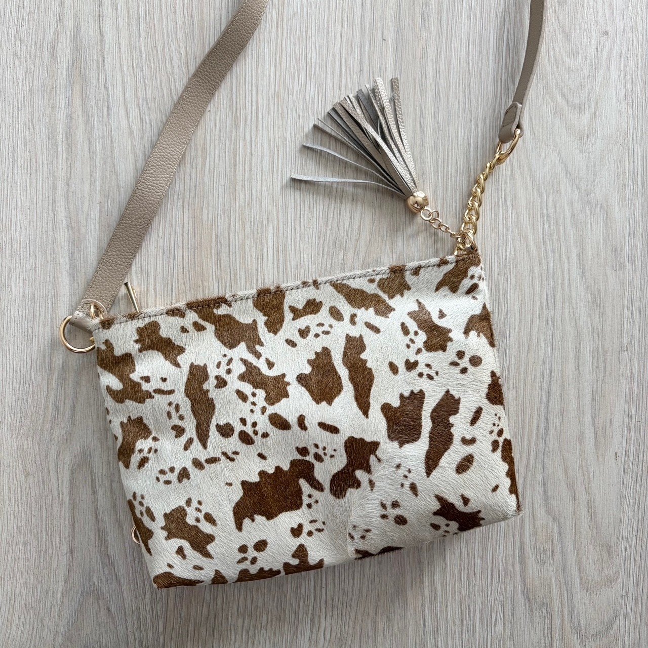 Bolso manos libres animal print con taupe y cafe en cuero peludo
