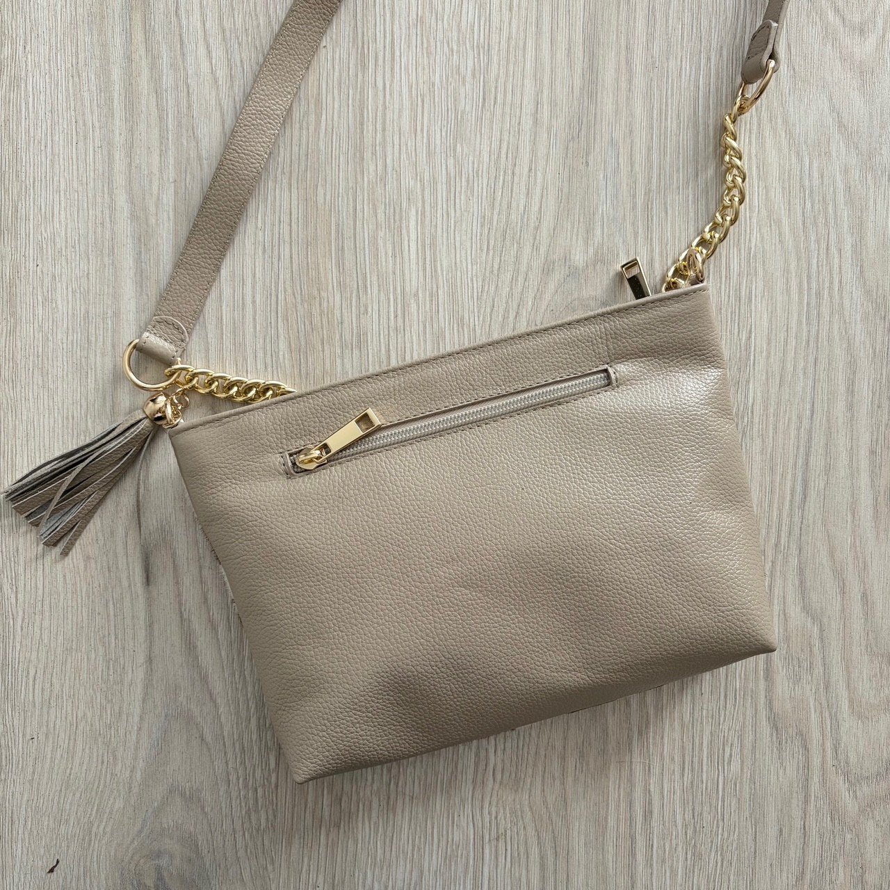 Bolso manos libres animal print con taupe y cafe en cuero peludo. Con tira larga removible. Con 1 compartimiento grande y 2 pequeños con cremallera. Forro textil. Medidas: 25 cm x 16 cm x 5.5 cm. Hecho en Colombia.