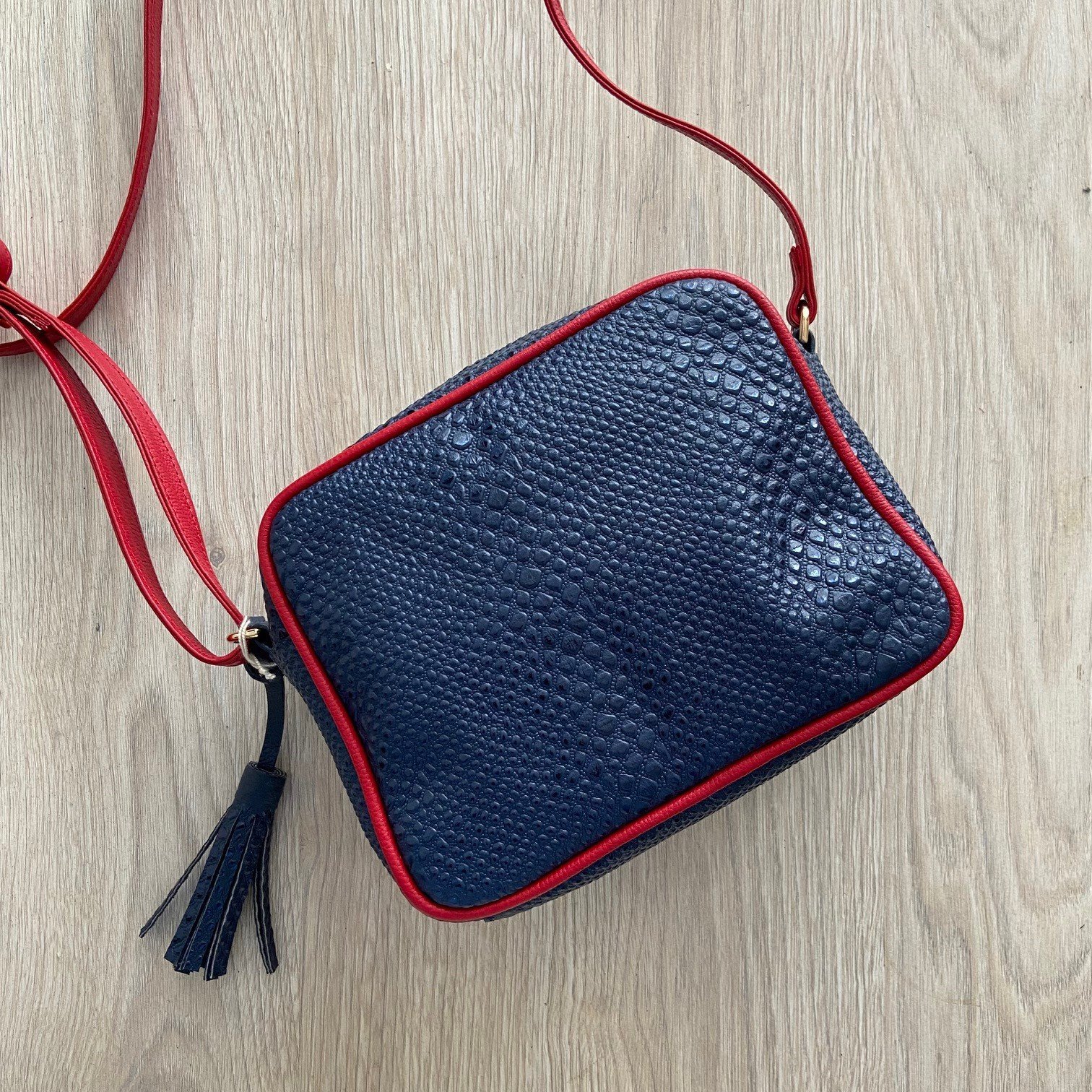 Bolso manos libres azul con rojo en cuero. Con 2 compartimientos. Con tira larga graduable. Hechos en Colombia.