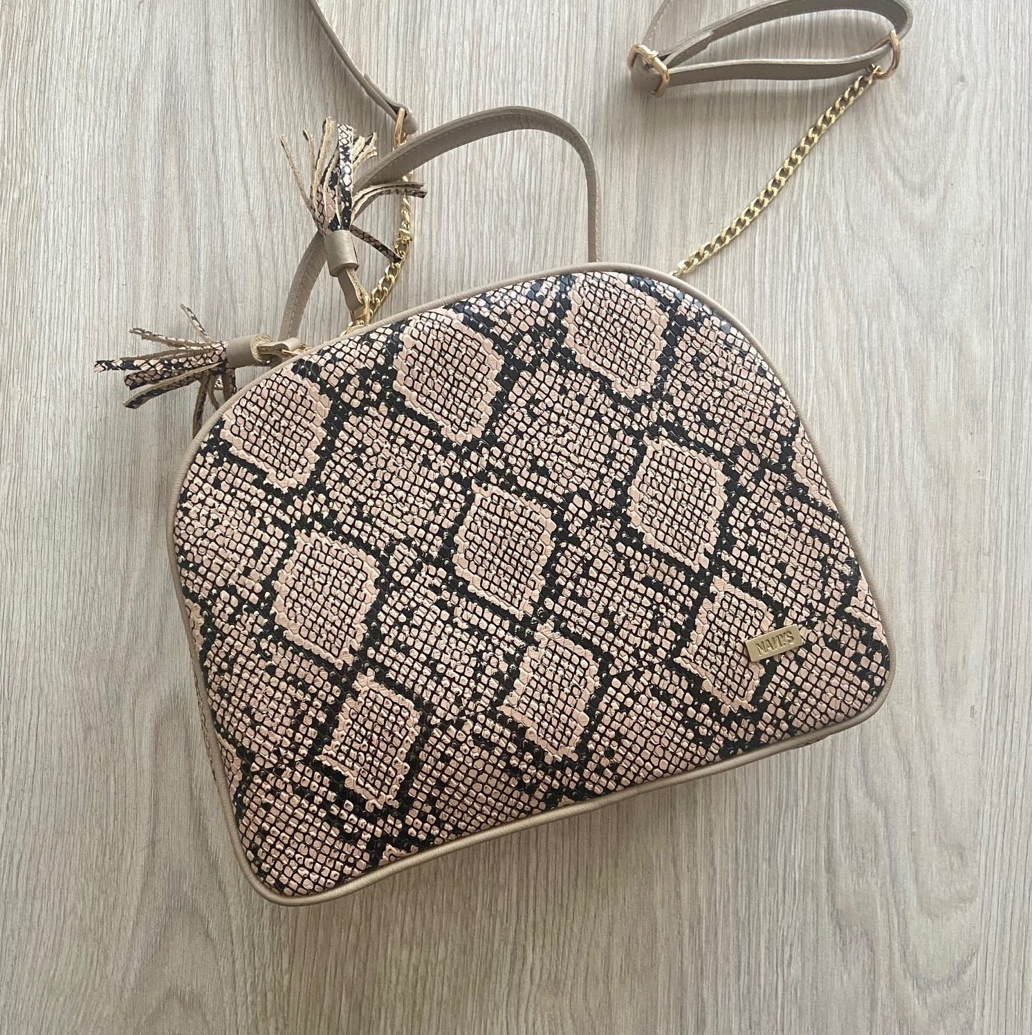 Bolso nude en cuero tipo folia. Con tira corta y larga graduable. Con 2 compartimientos internos. Cremallera. Hecho en Colombia.