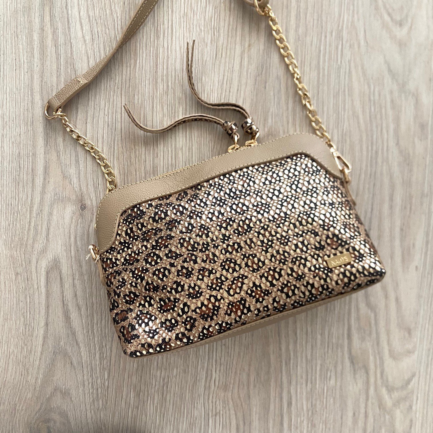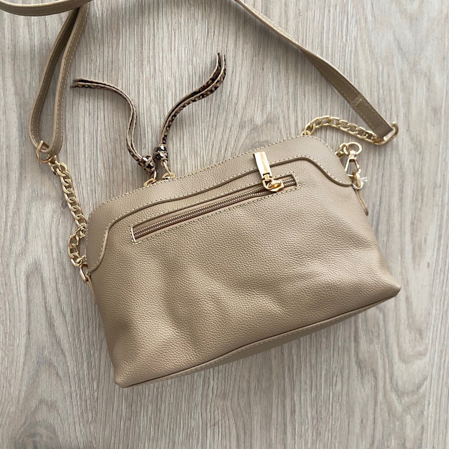 Bolso taupe con print en cuero. Compartimientos con cremallera. Tira larga graduable y removible. Medidas: 23 cm x 16 cm x 8 cm. Hecho en Colombia.