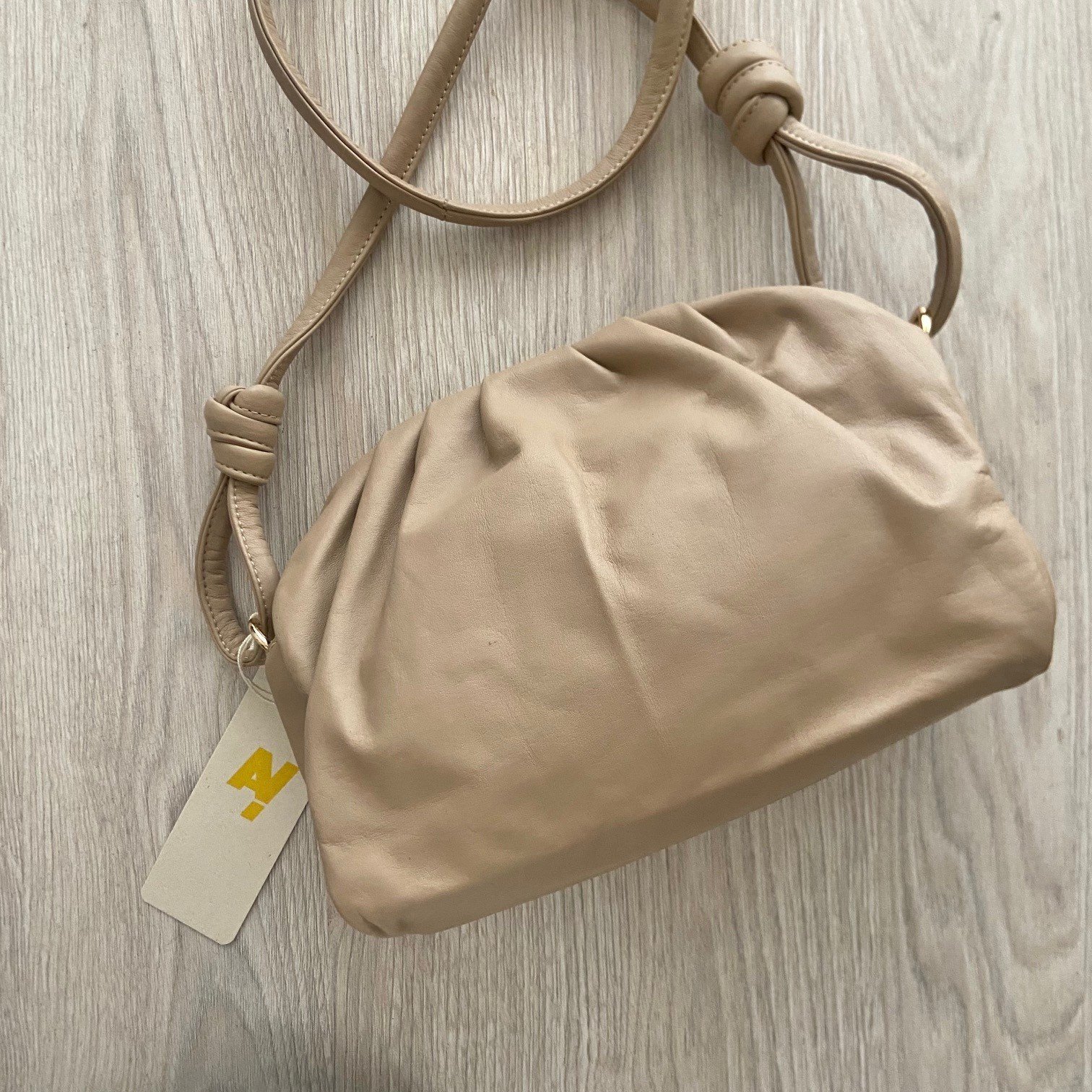 Bolso taupe en cuero manos libres. Tira larga con nudos de 120 cm, graduable. Compartimiento con cremallera. Medidas: 24 cm x 28 cm x 10 cm. Hecho en Colombia.