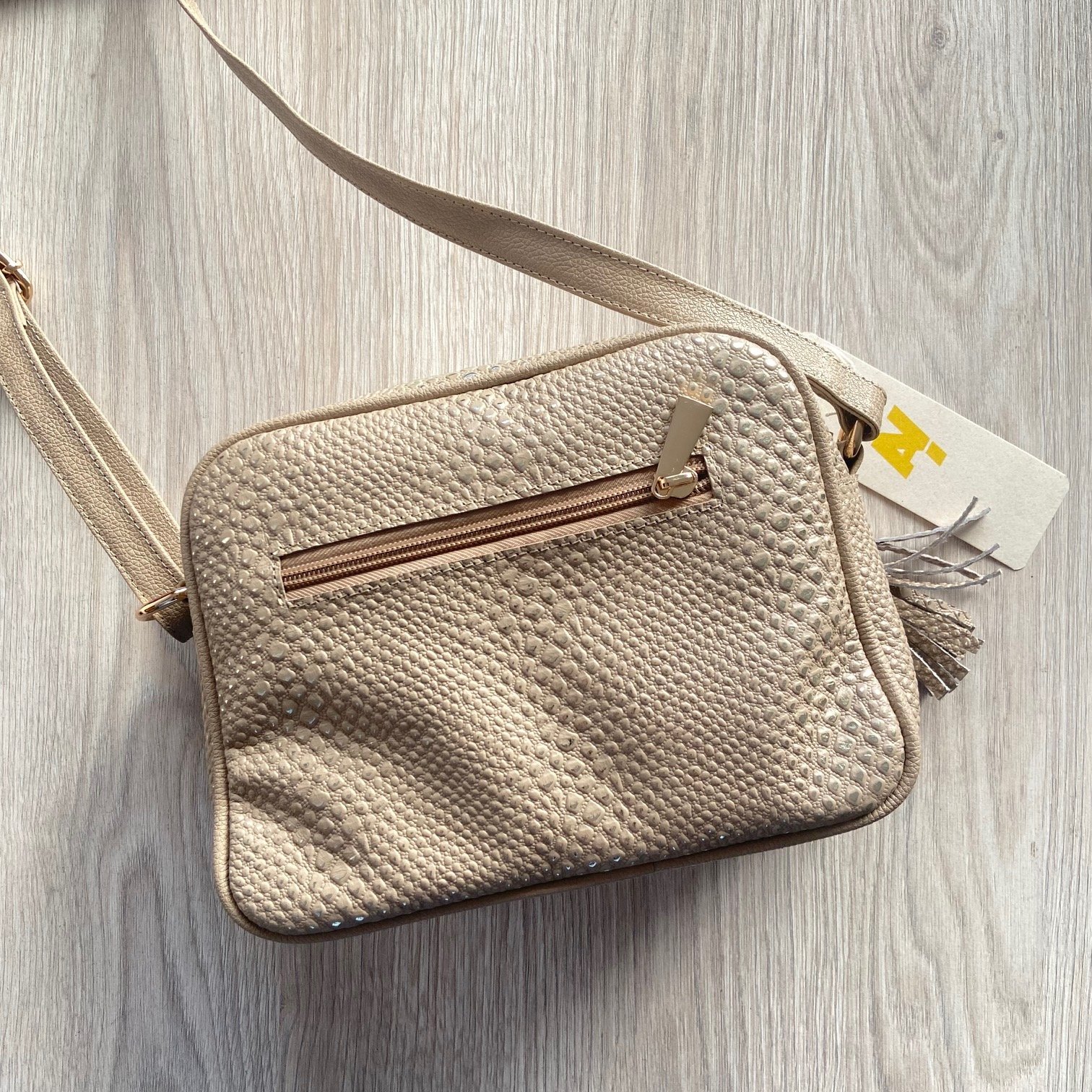 Bolso taupe manos libres con pompón en cuero. Dos compartimientos externos con cremallera. Tira larga graduable. Medidas 22 cm ancho x 17 cm alto x 10 cm fondo. Hecho en Colombia.
