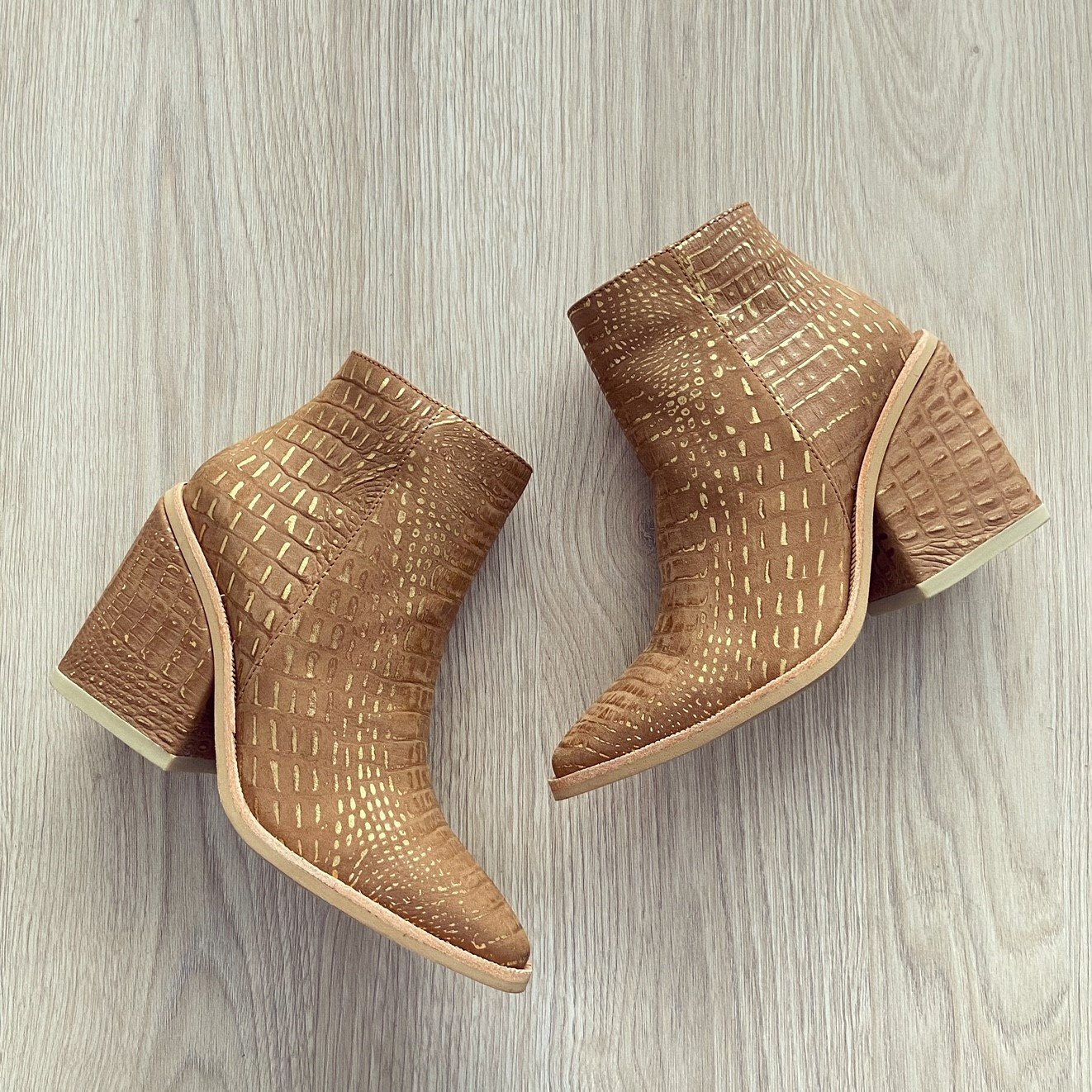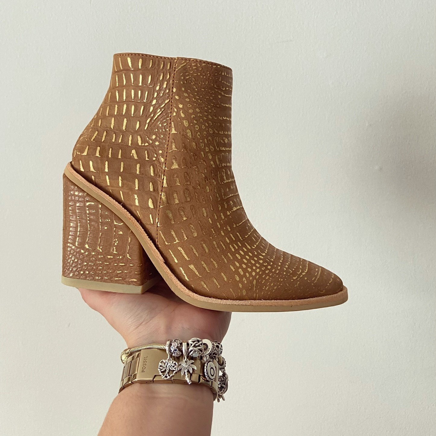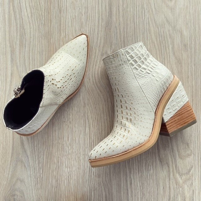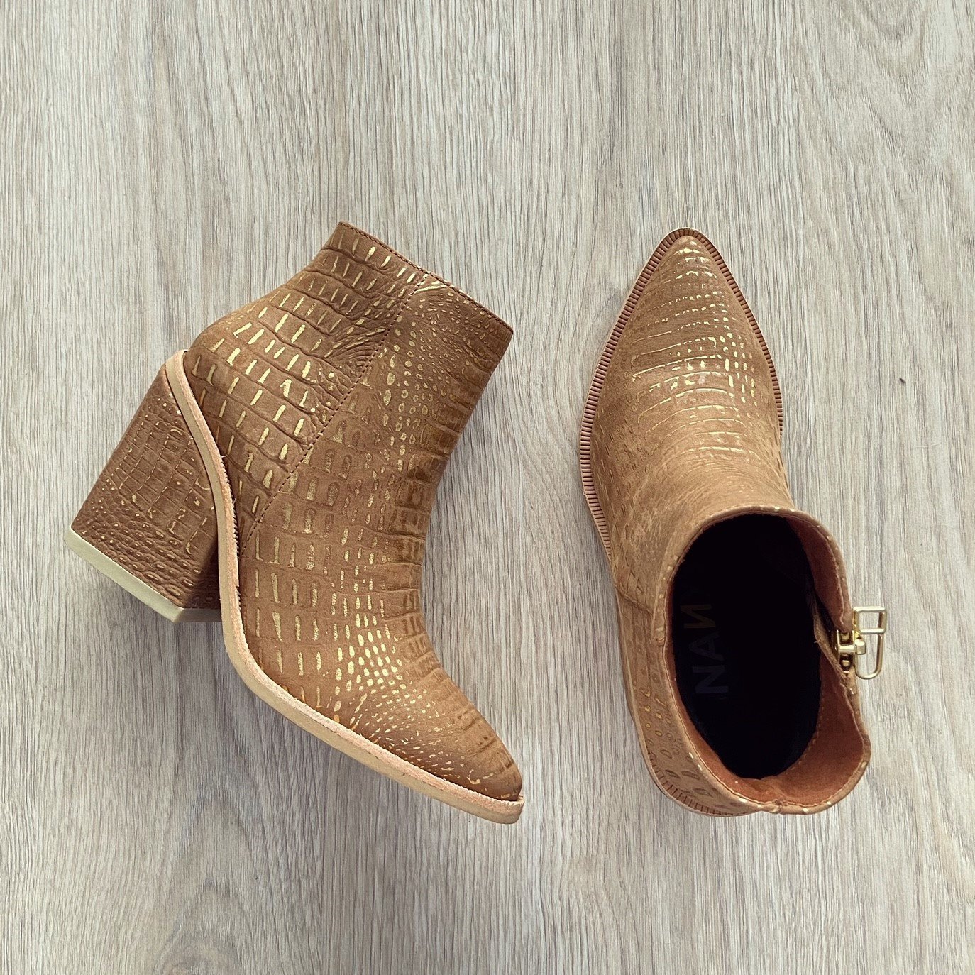 Bota talco en cuero tipo folia. Tacón 7.5 cm en vira y forrado en cuero. Hechas en Colombia.