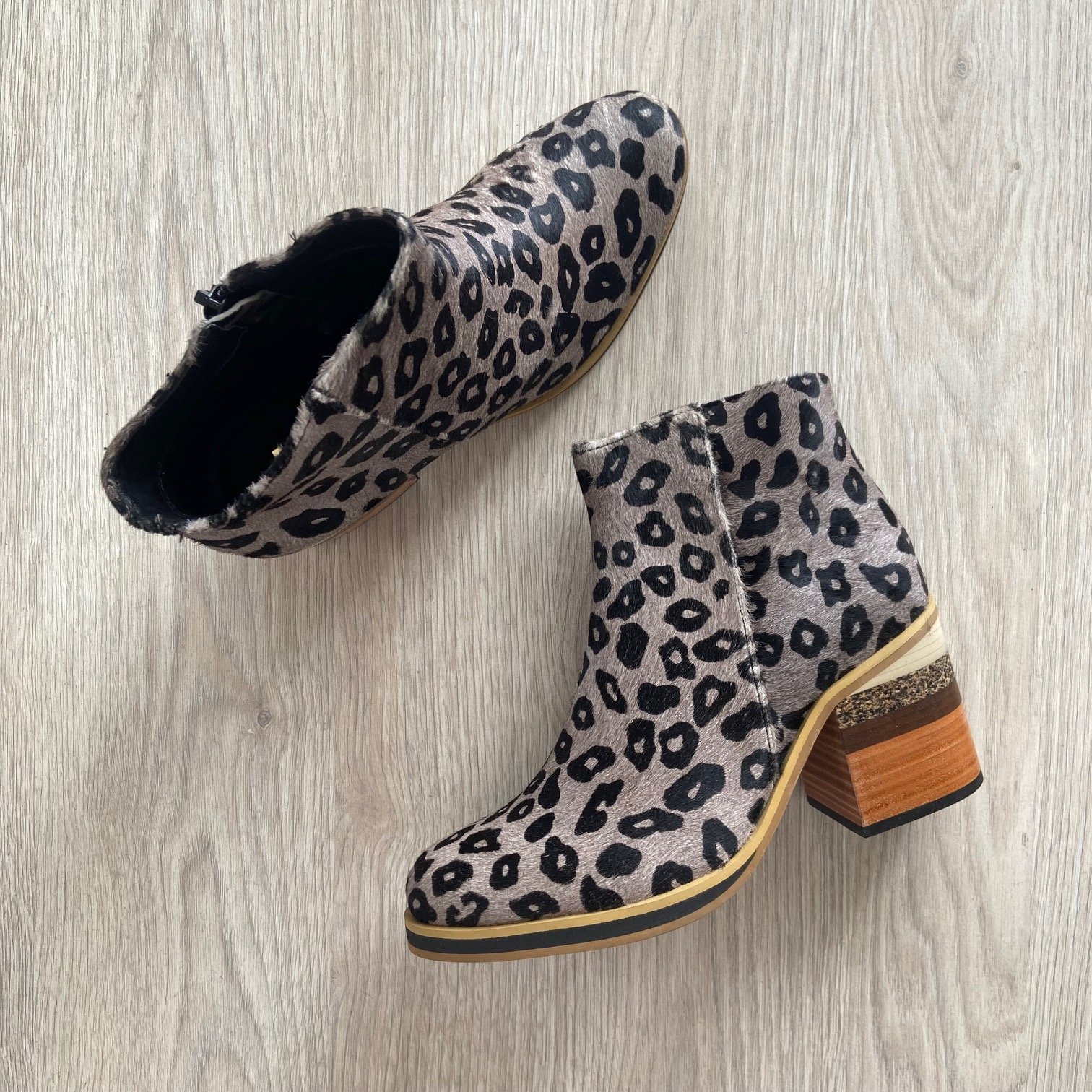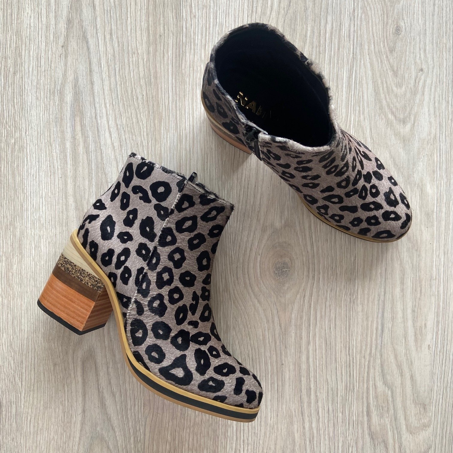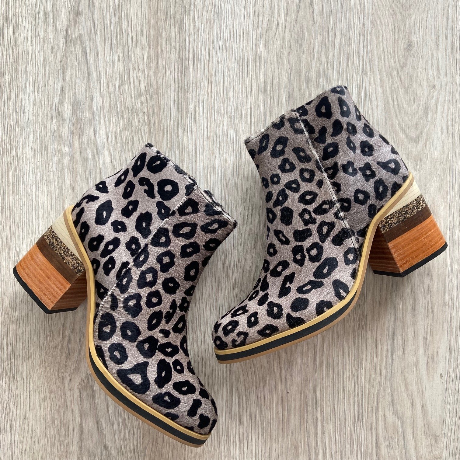 Botines animal print gris en cuero. Tacón 7.5 de colores. Con cremallera. Hechas en Colombia.