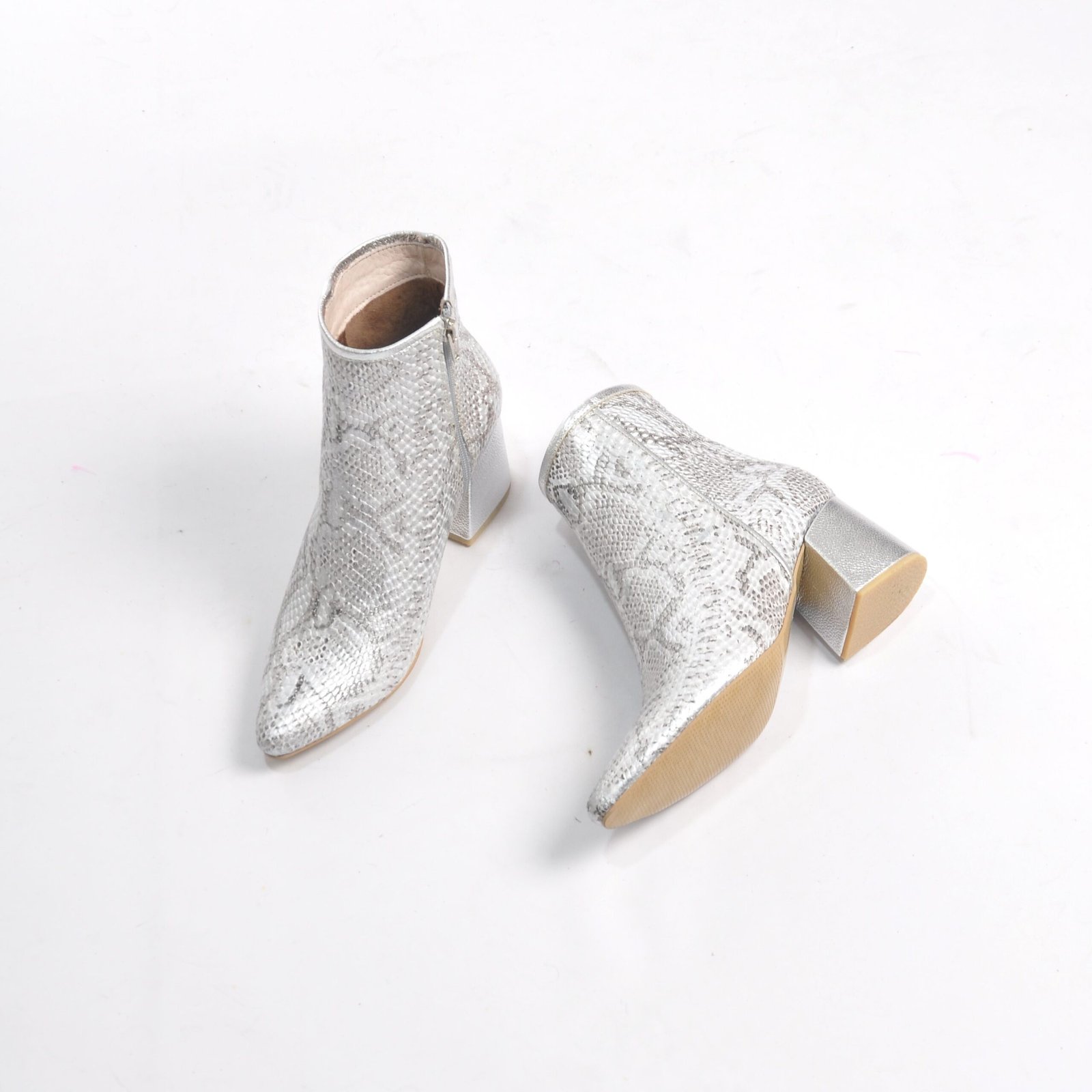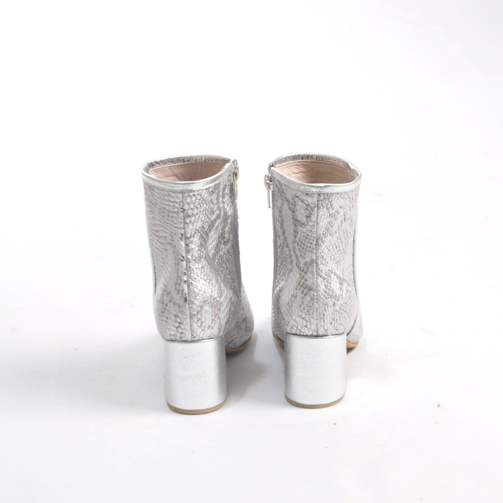 Botines clásicos plateados en cuero tipo folia. Tacón 5.5. Con cremallera. Hechos en Colombia.