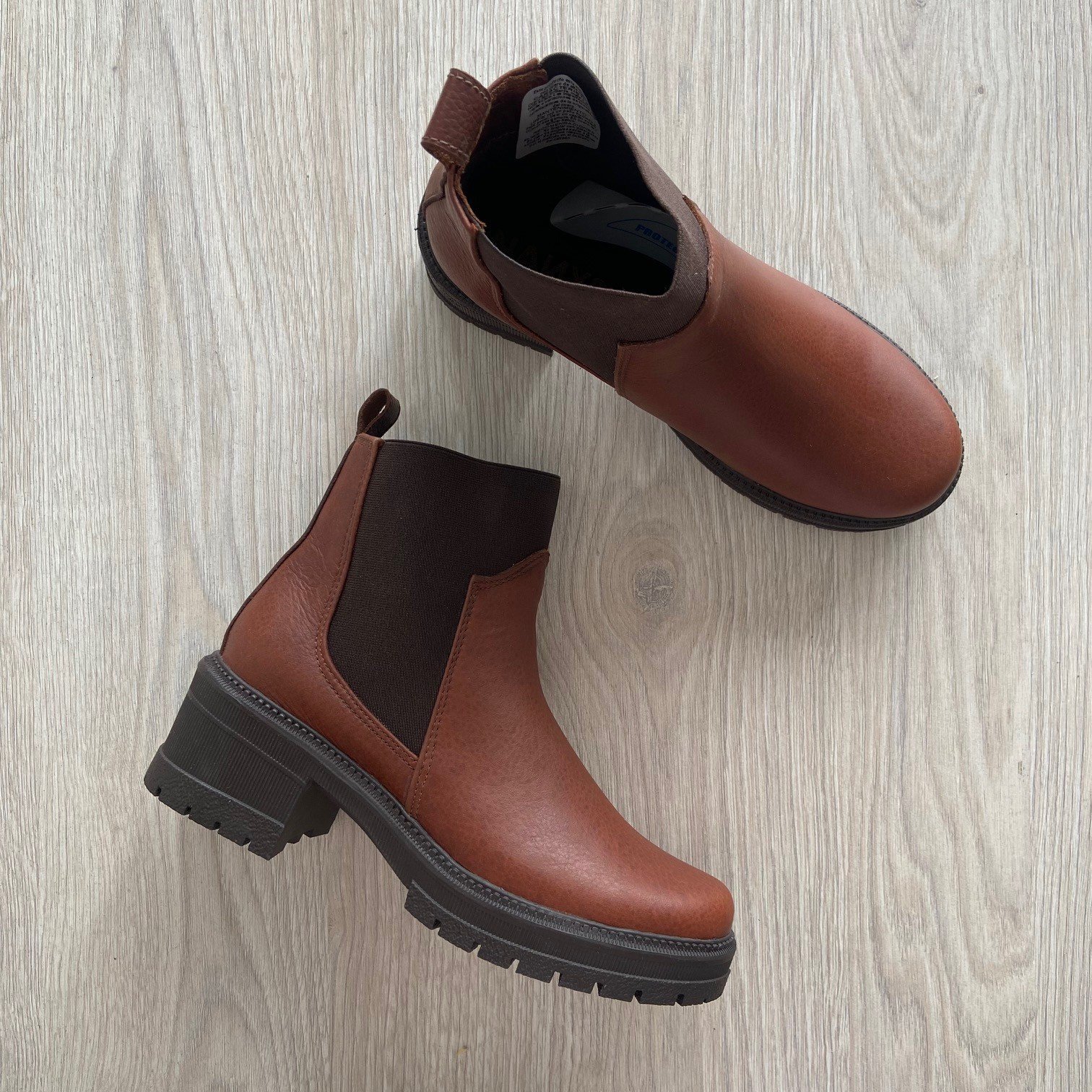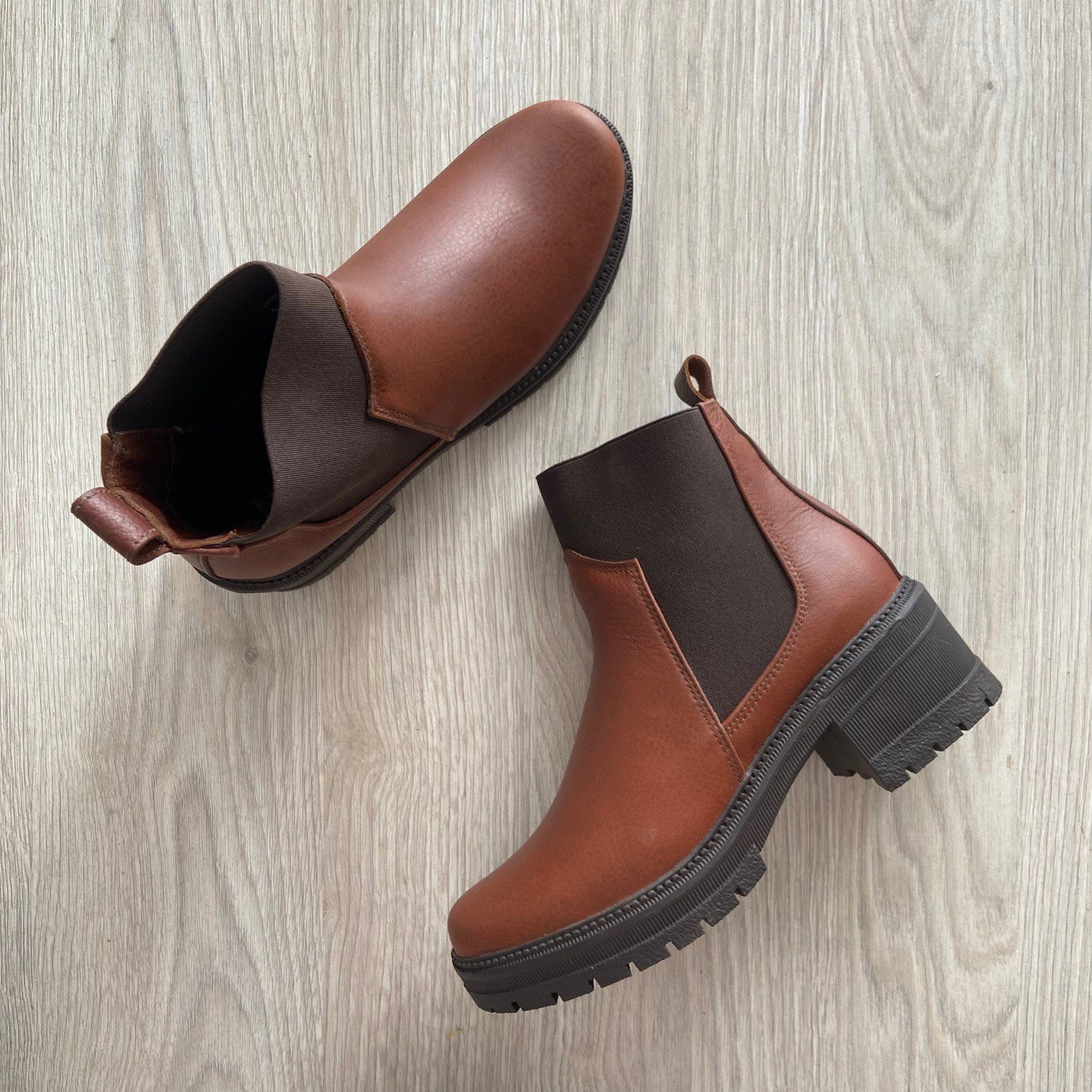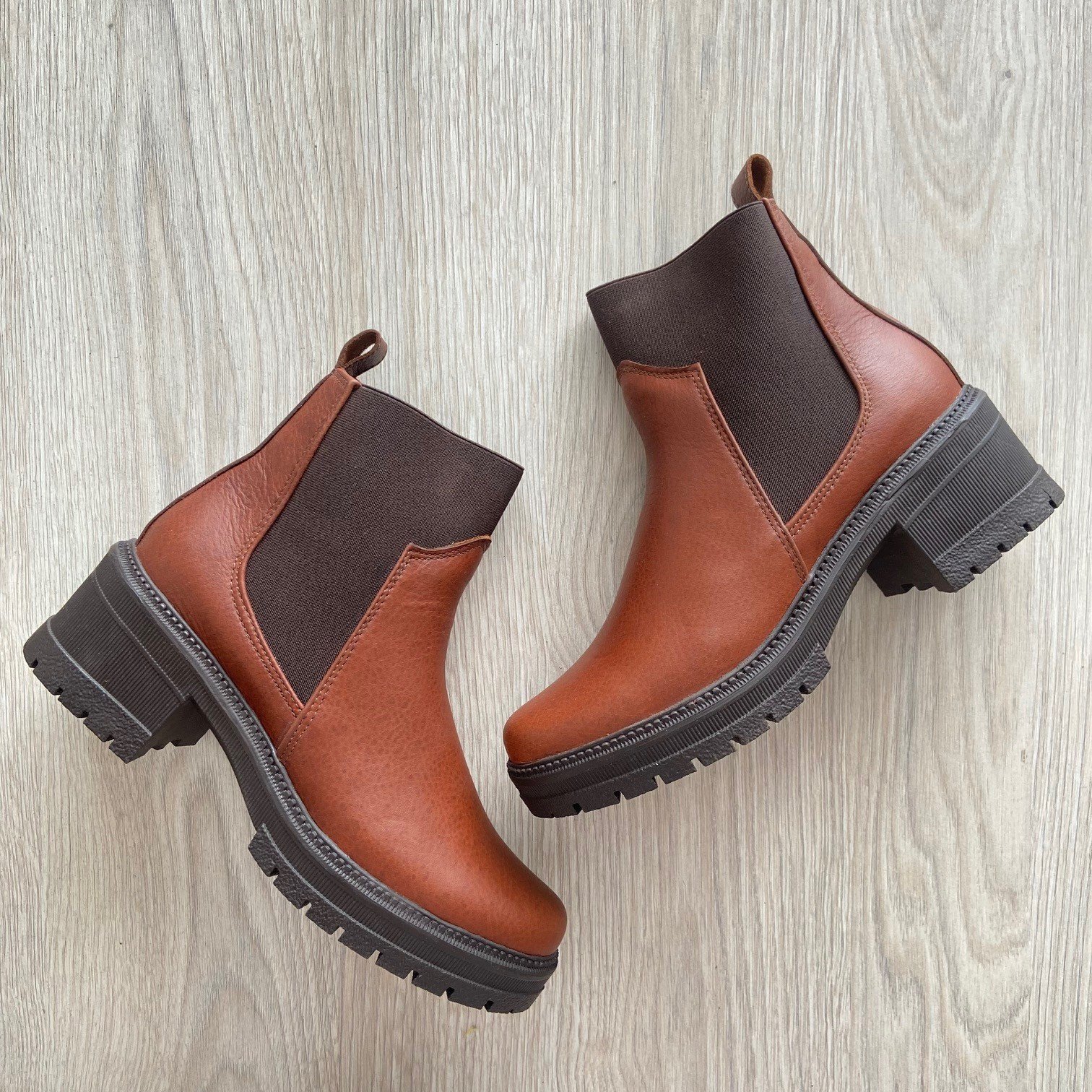Botines coñac en cuero con resorte. Suela en goma. Hecho en Colombia.