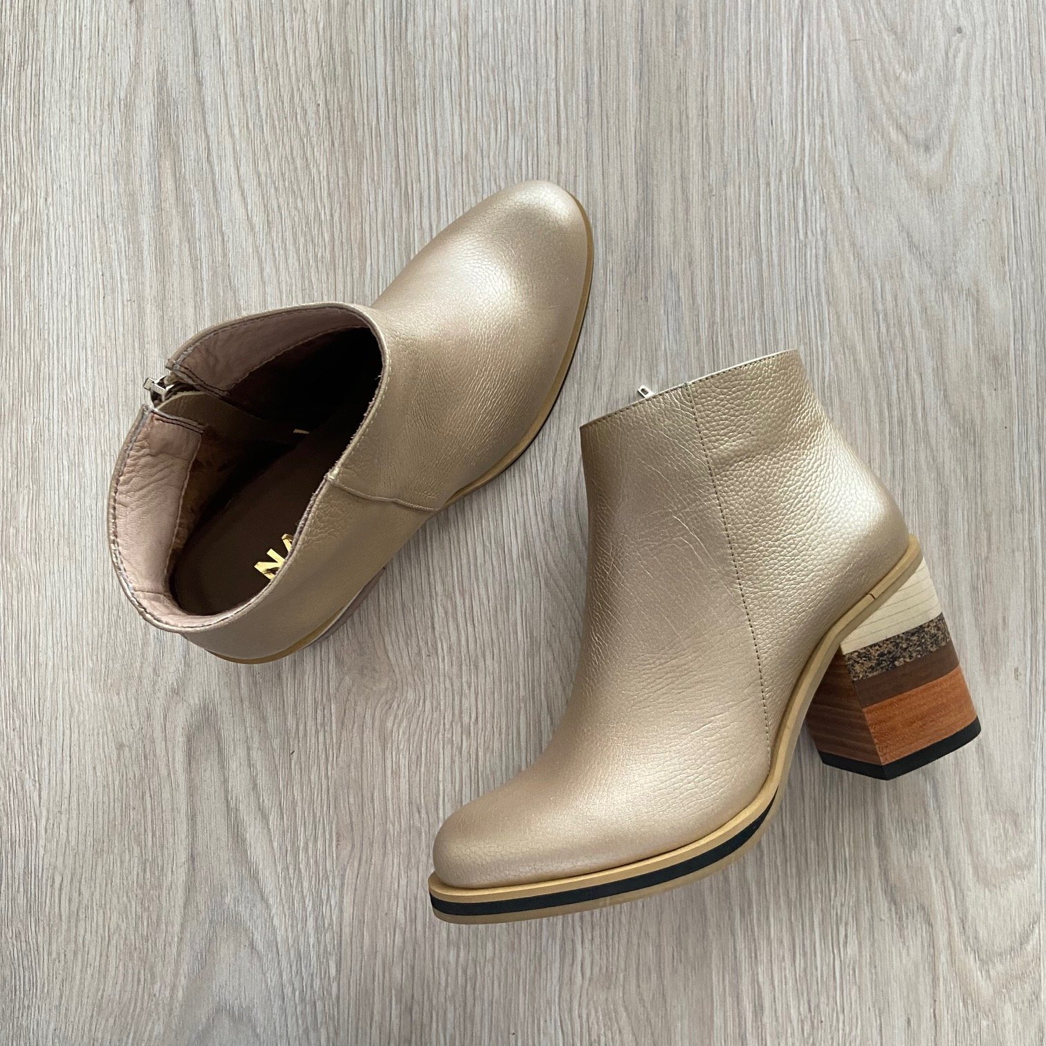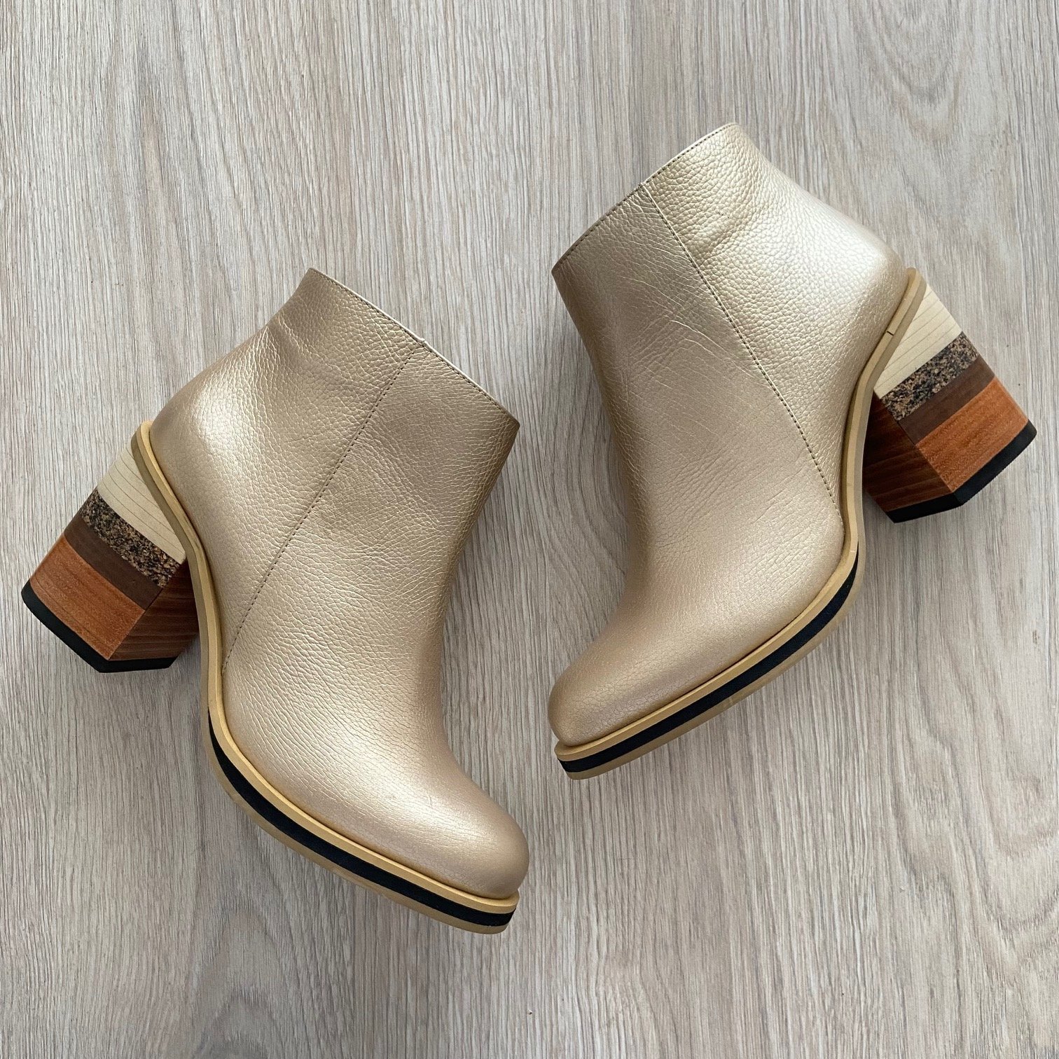 Botines dorados en cuero con tacón en madera. Forrados en cuero. Tacón 7.5 en madera. Punta redonda. Con cremallera. Hechas en Colombia.