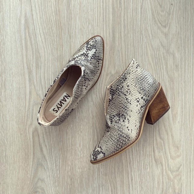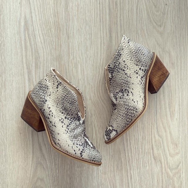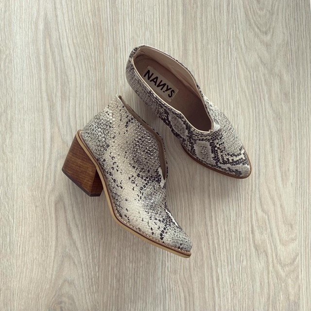 Botines en cuero folia blanca con abertura. Tacón 5.5 cm. Forradas en cuero. Hechas en Colombia.
