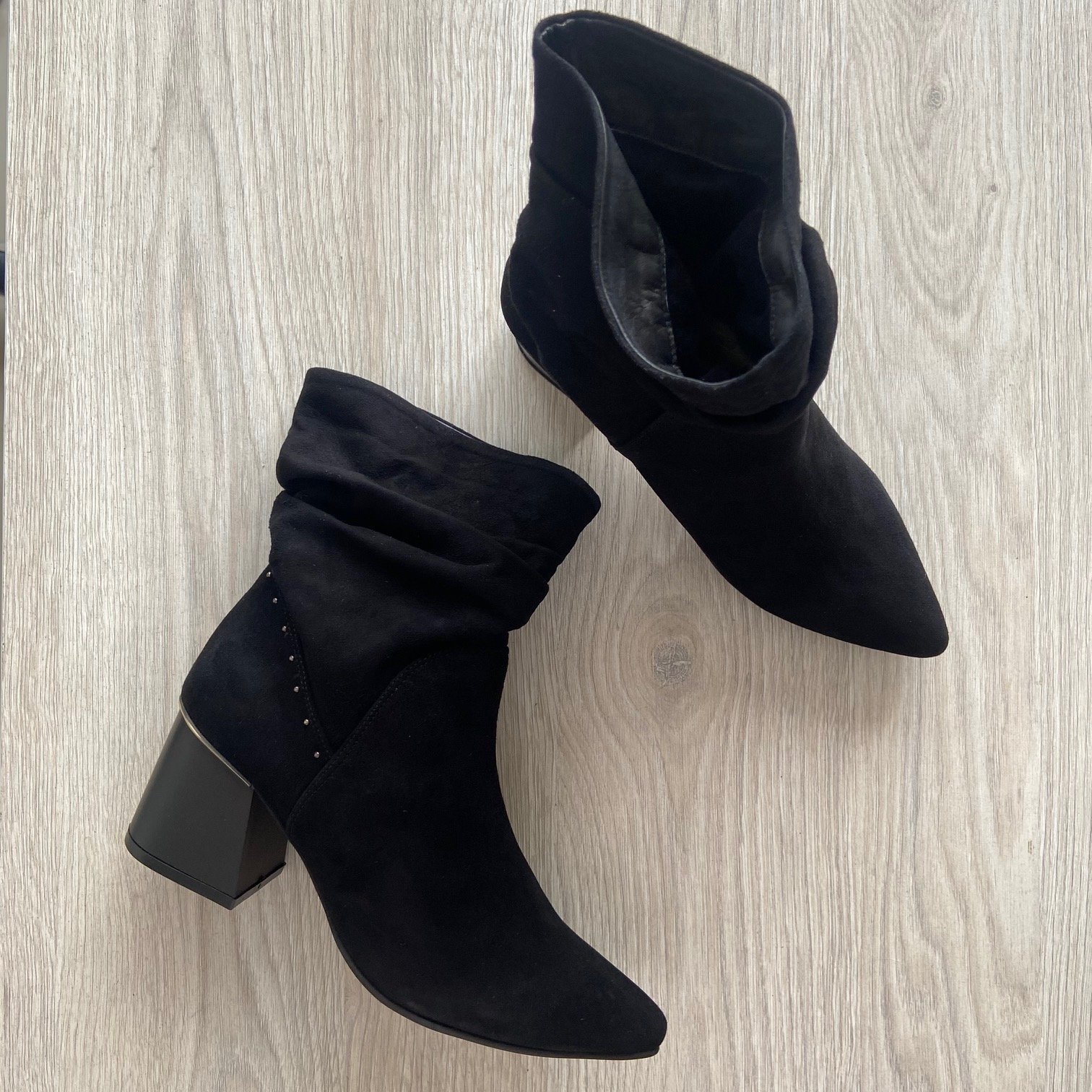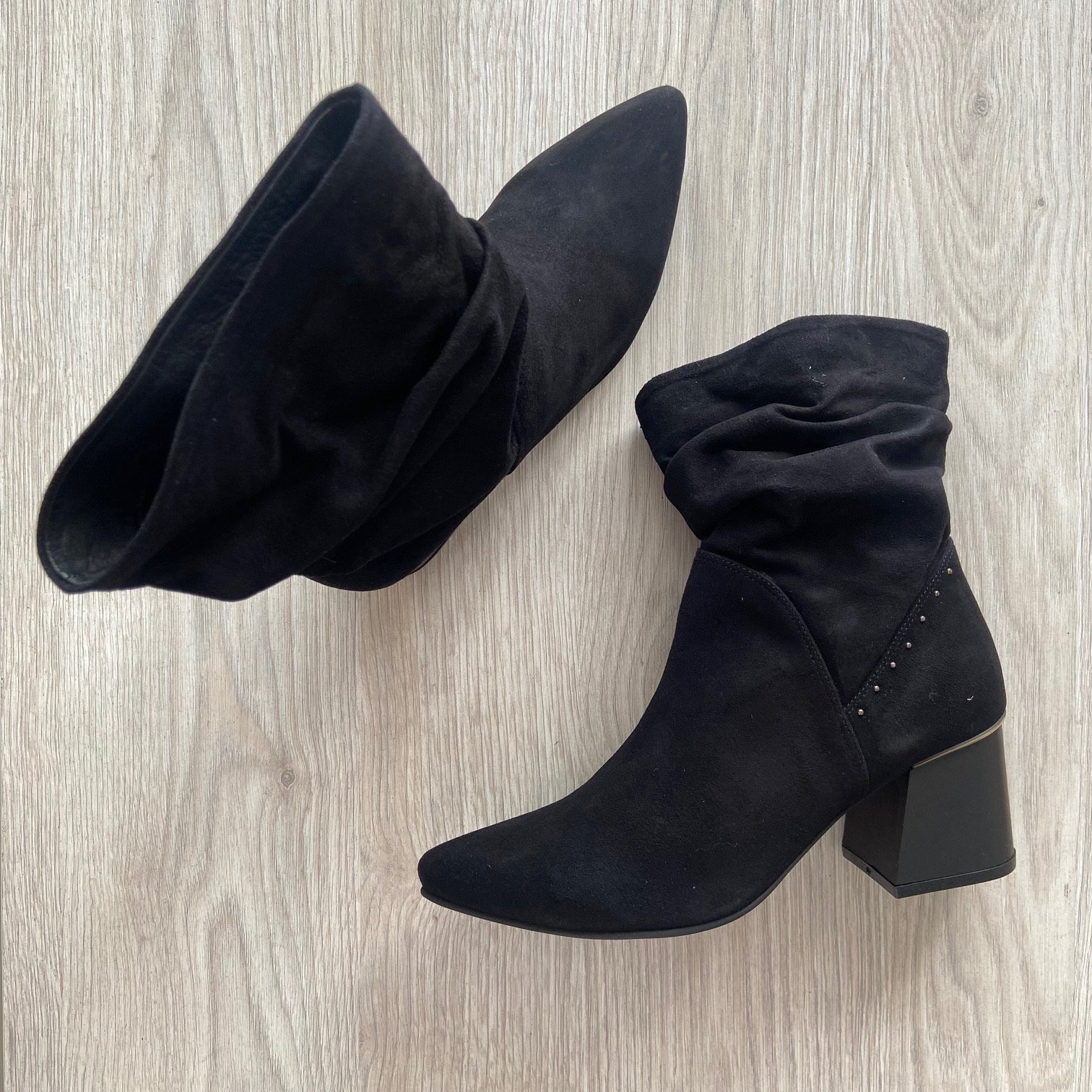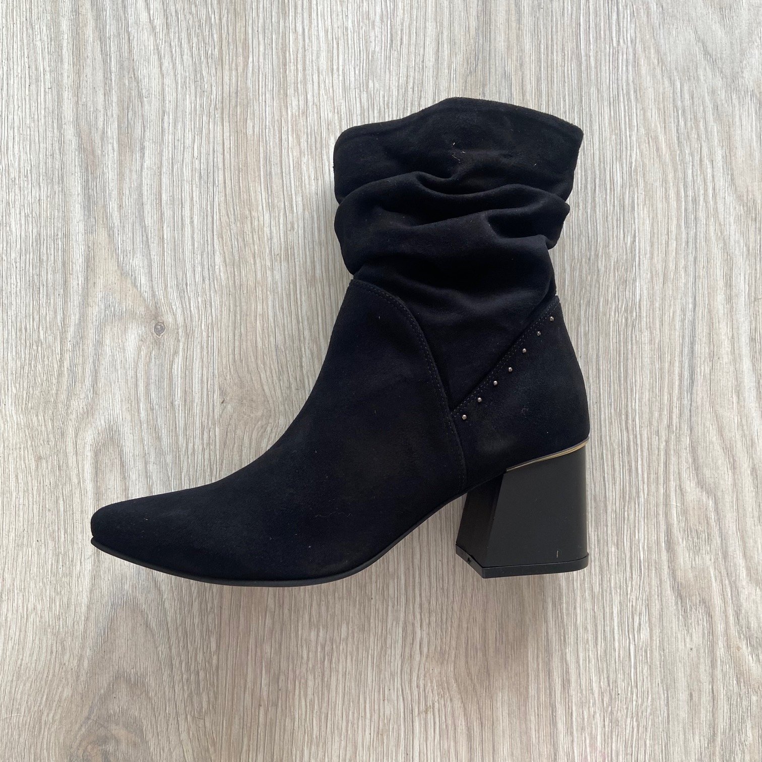 Botines negros en cuero puntudos. Con caña recogida. Apliques dorados. Hechas en Colombia.