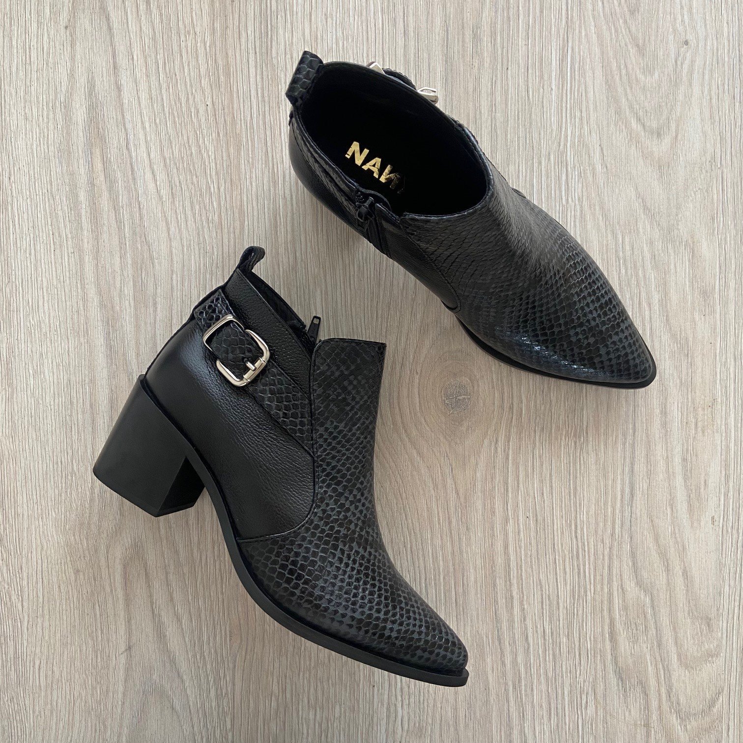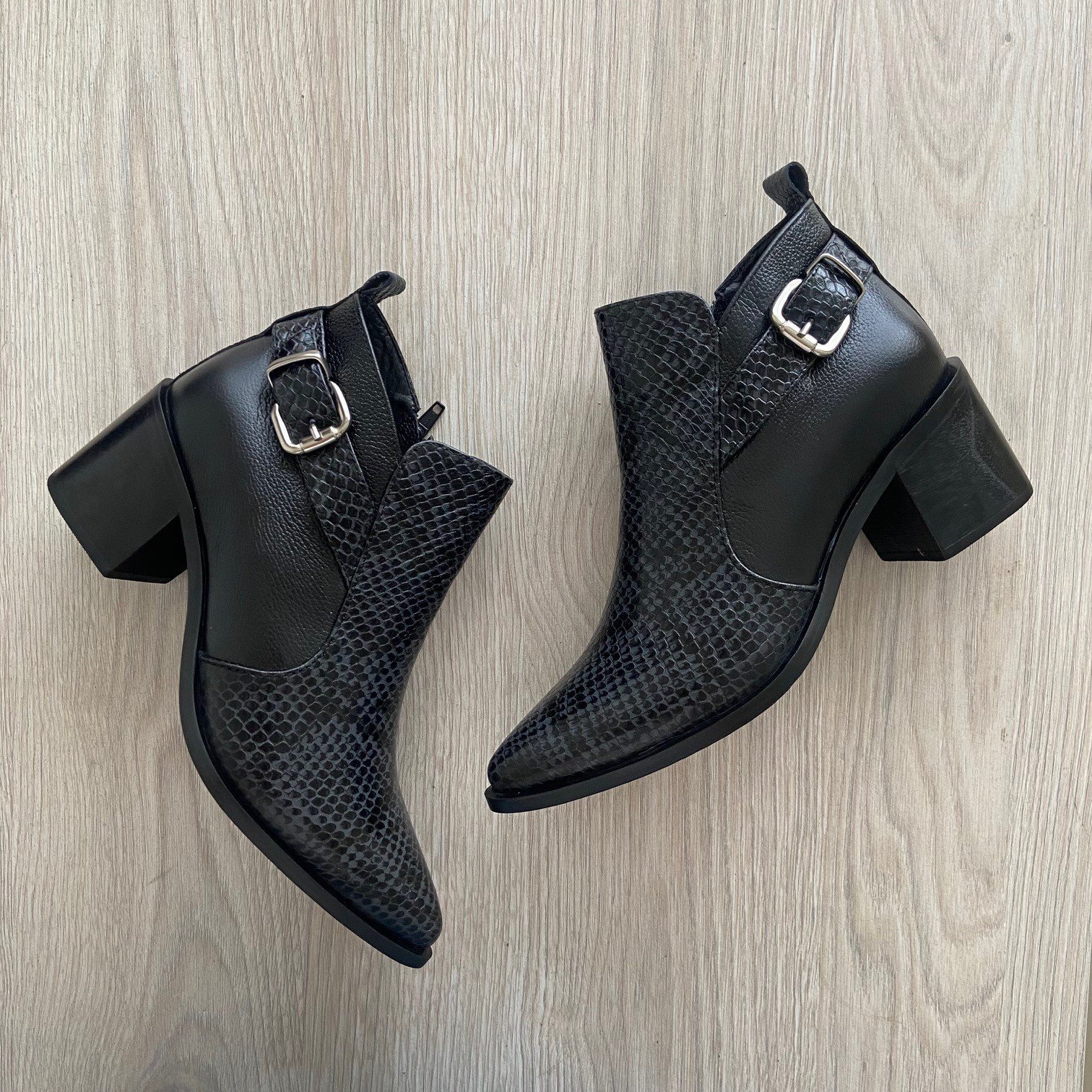 Botines negros en cuero liso y folia. Con hebilla. Con cremallera. Tacón 4.5. Hechos en Colombia