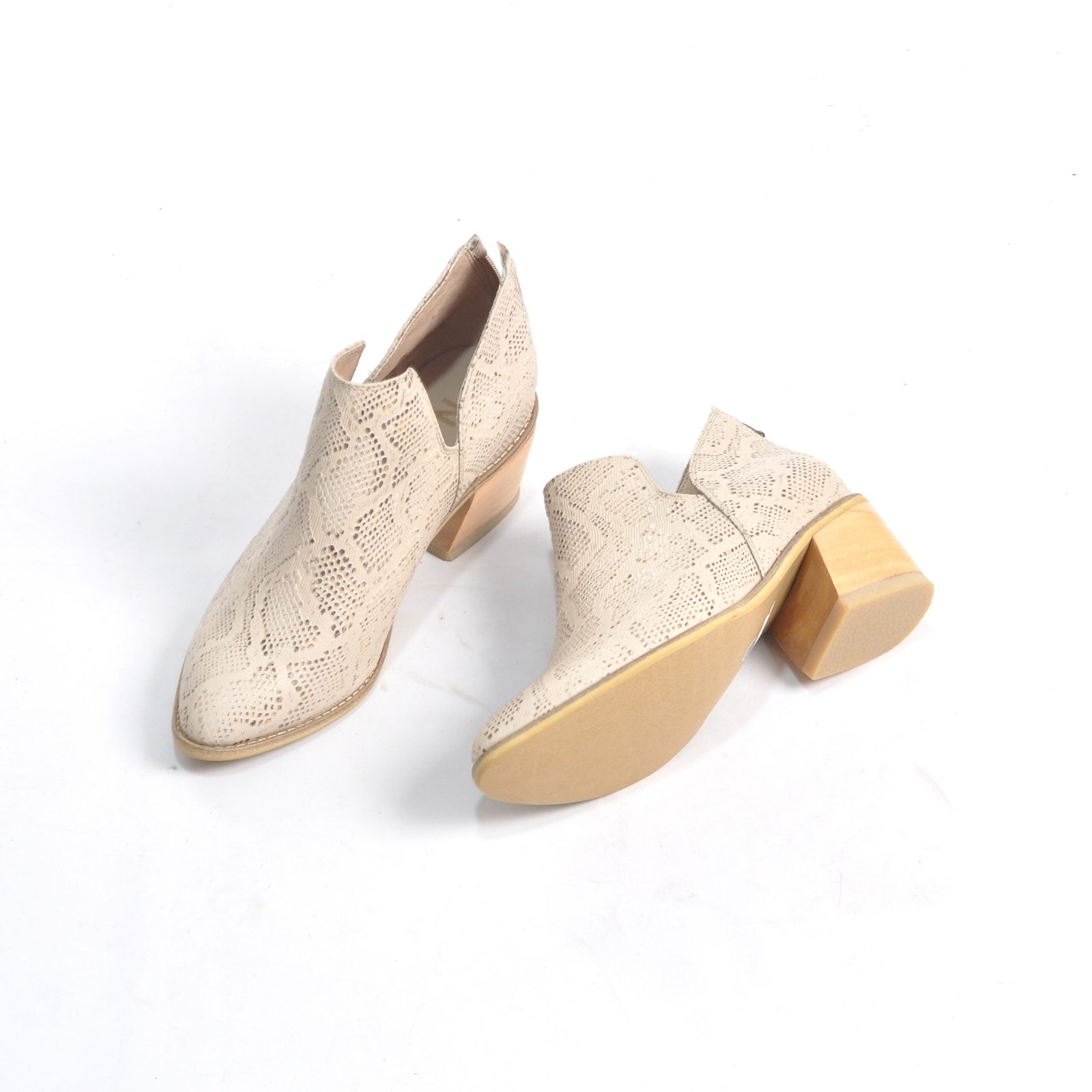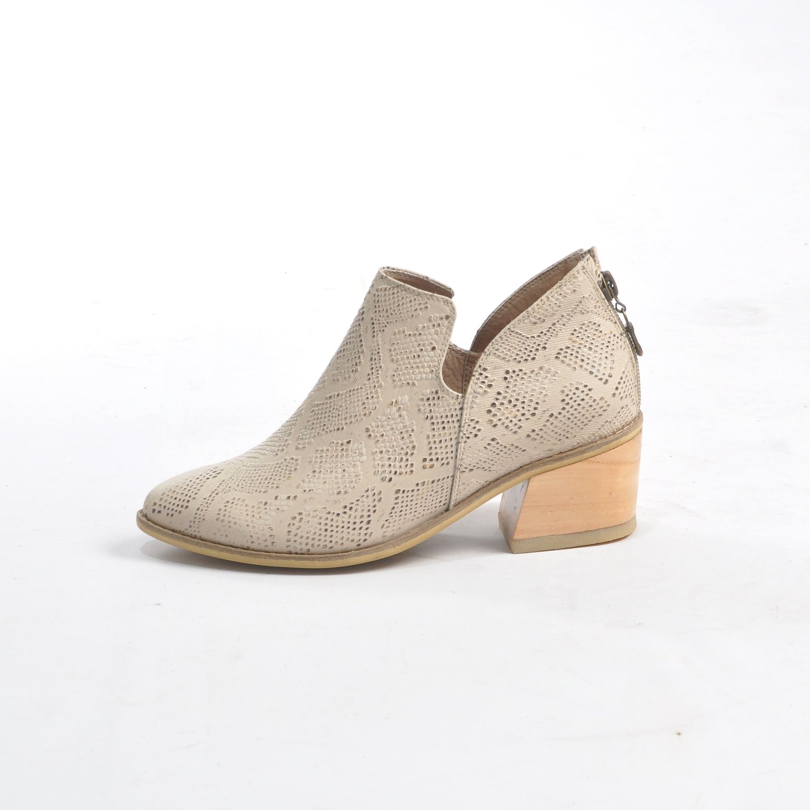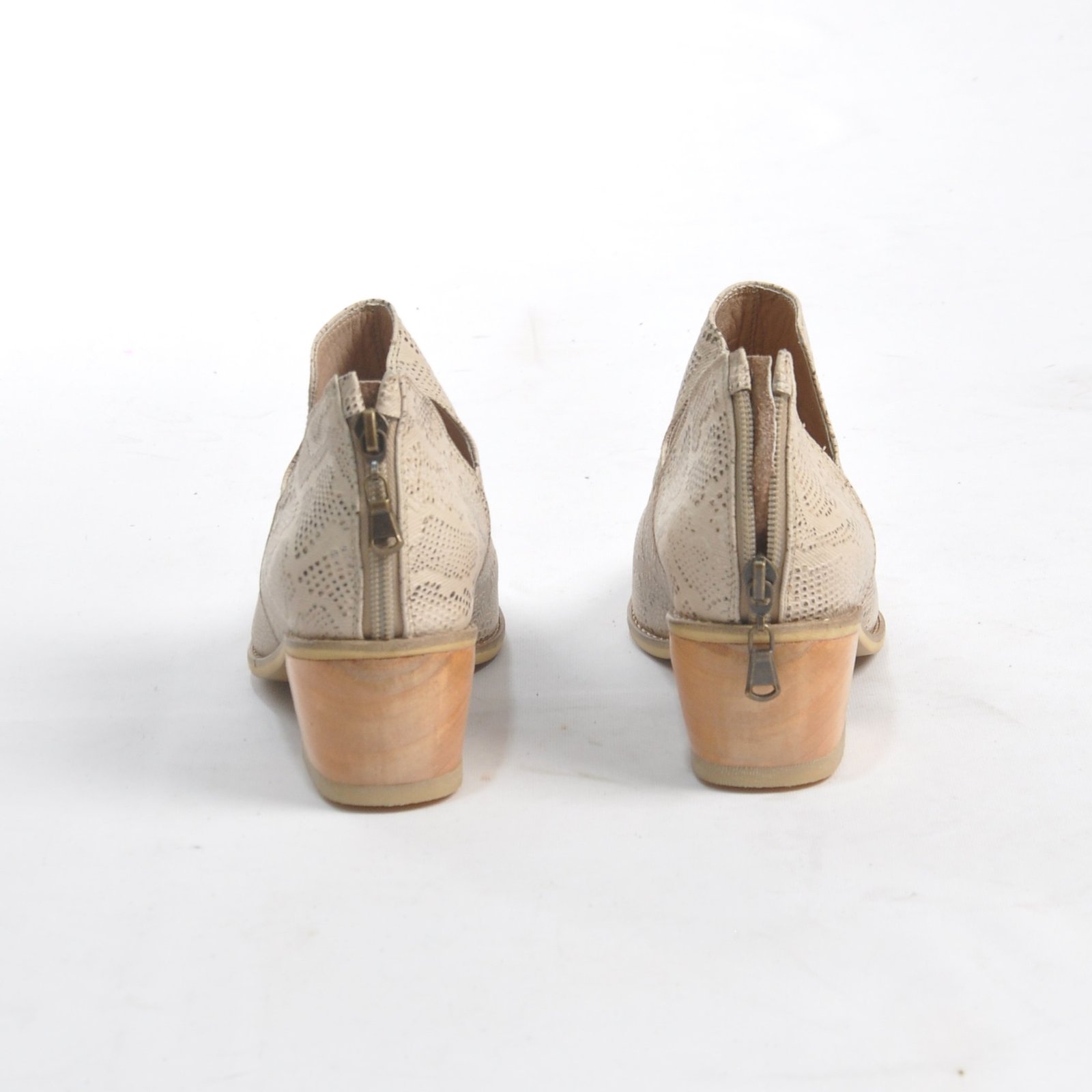 Botines talco en cuero tipo folia. Tacón 4.5 en madera. Con cremallera. Forrados en cuero. Hechos en Colombia.
