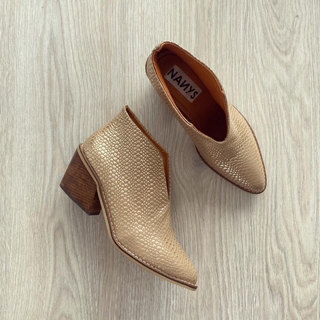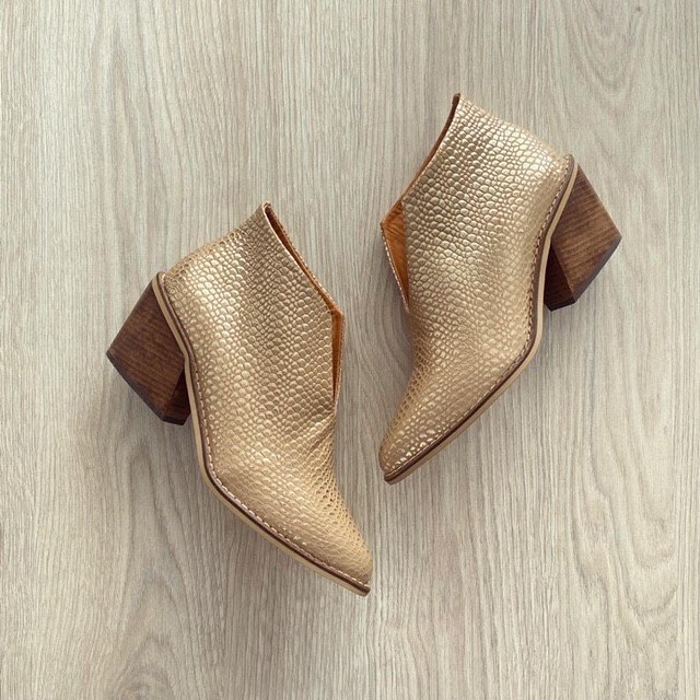 Botines taupe con dorado en cuero con abertura. Tacón 5.5 cm. Forradas en cuero. Hechas en Colombia.