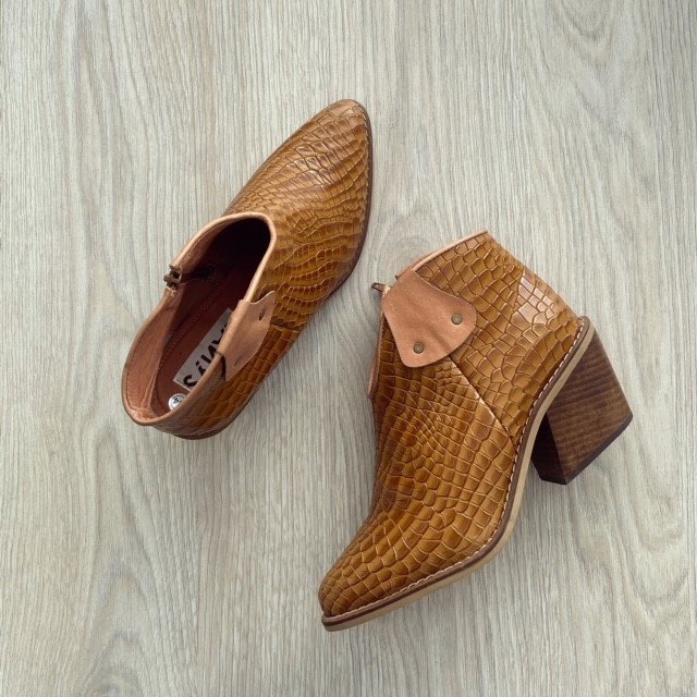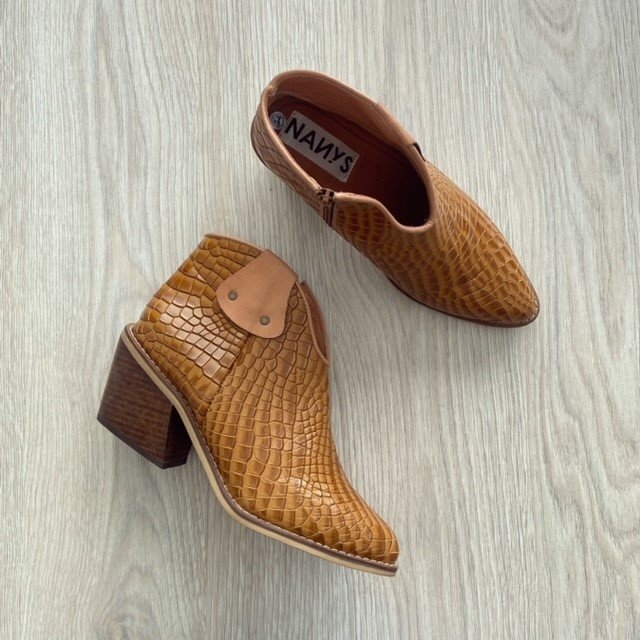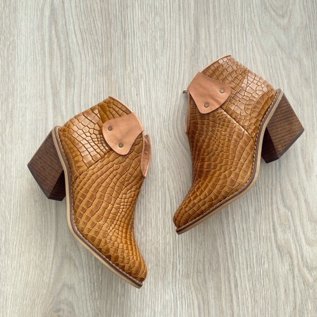 Botines texanos miel en cuero con apliques en miel liso. Tacón 4.5 cm en madera. Forrados en cuero. Hechos en Colombia.