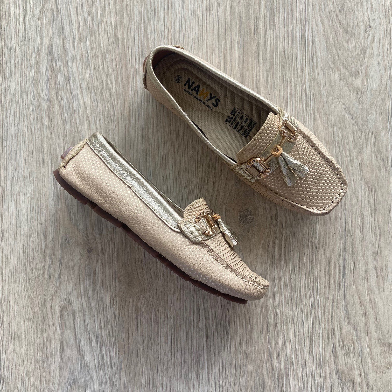 Mocasines dorados en cuero con suela bajita en goma. Forrados en cuero. Plantilla ergonomica. Hechos en Colombia.