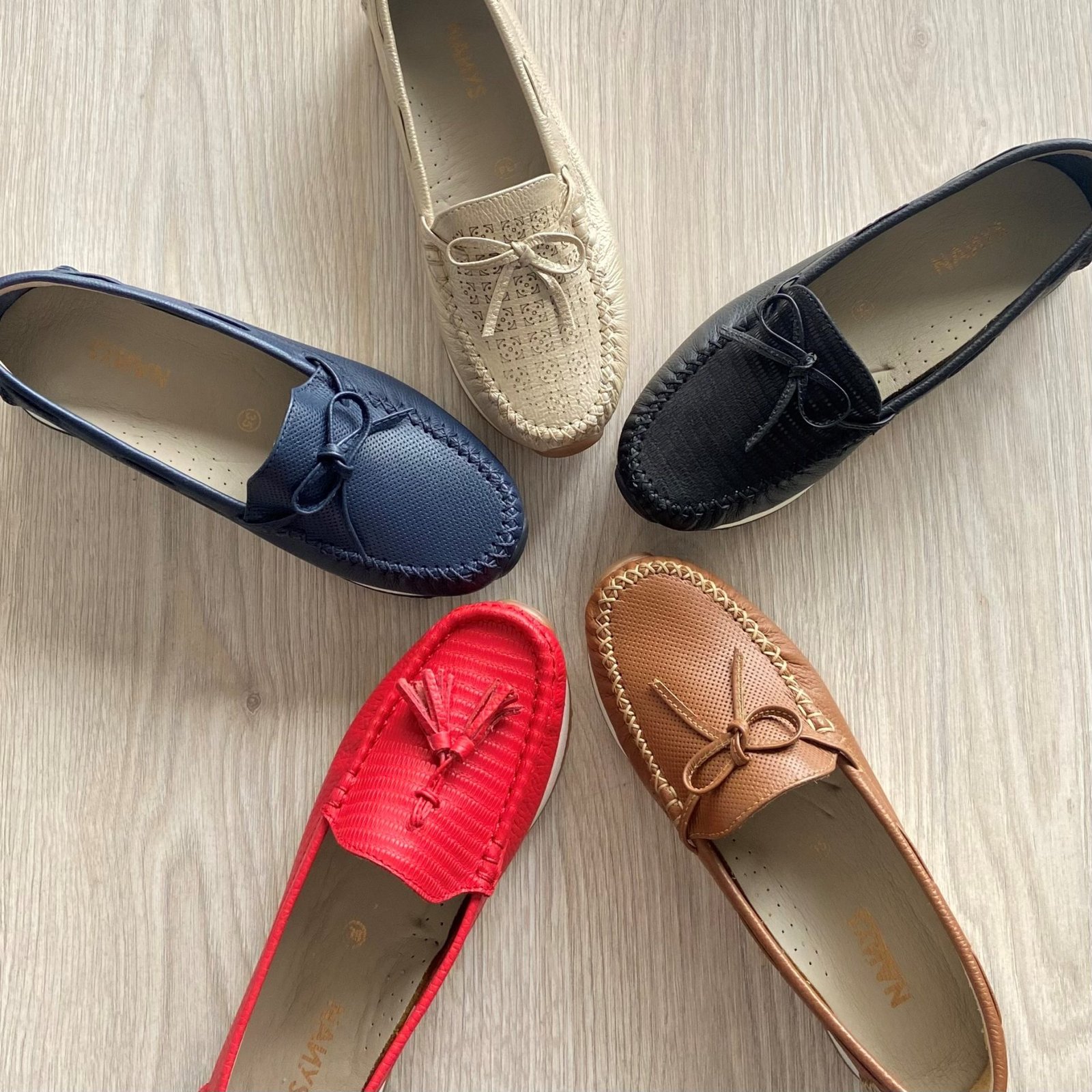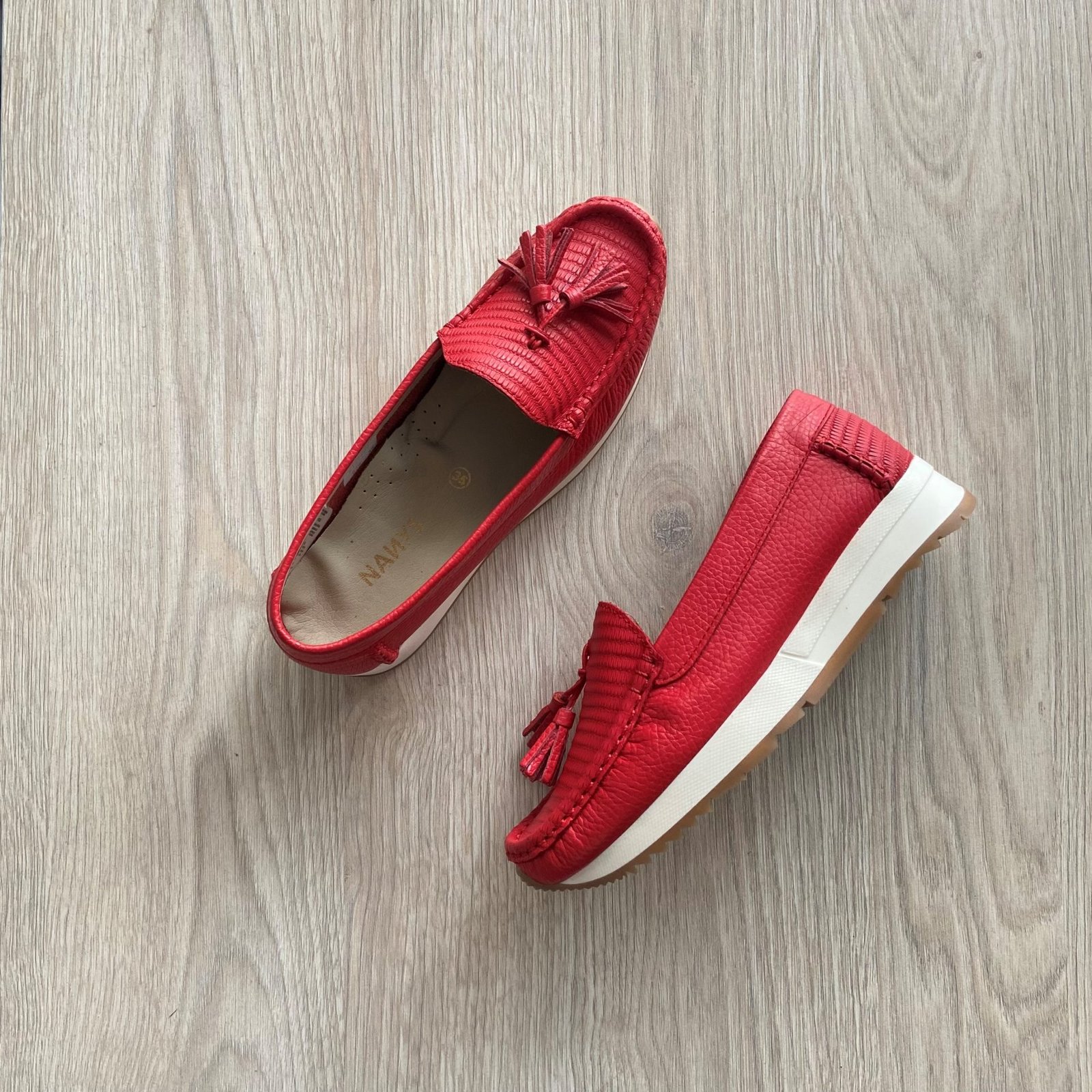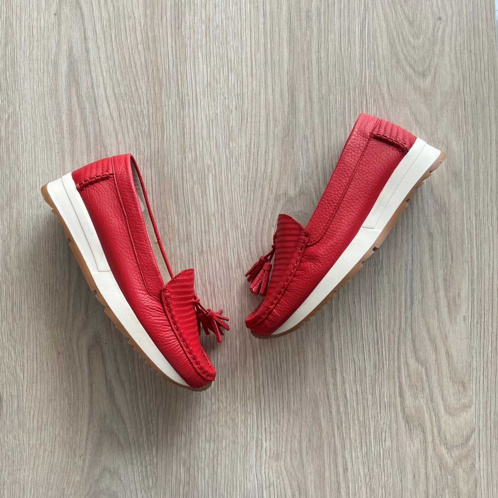 Mocasines rojo en cuero con chilindrines. Forrados en cuero. Hechos en Colombia.