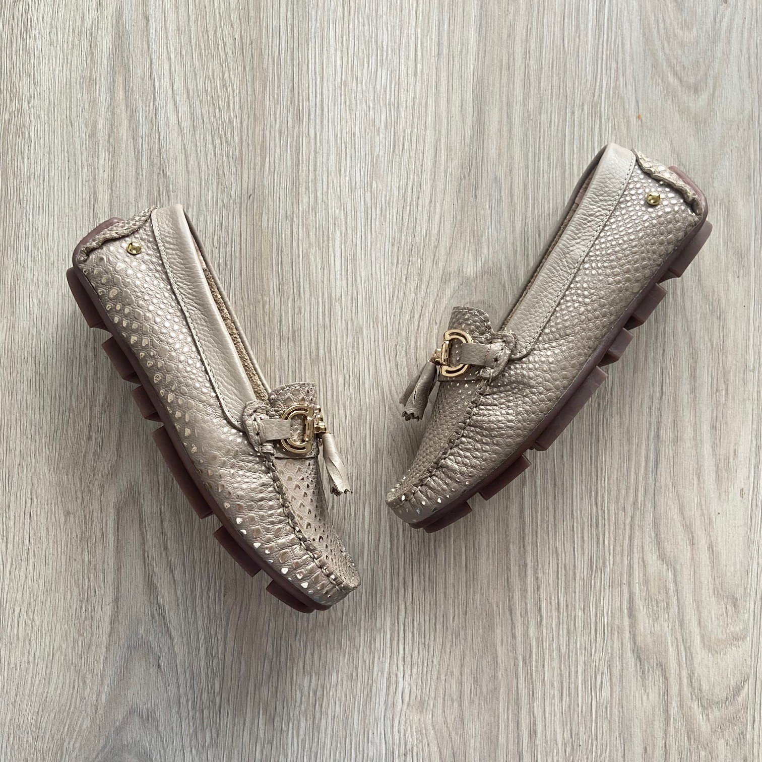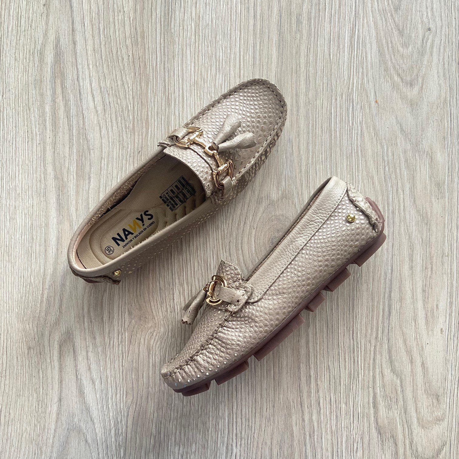 Mocasines taupe en cuero con suela bajita con herraje dorado. Forrados en cuero. Hechos en Colombia.