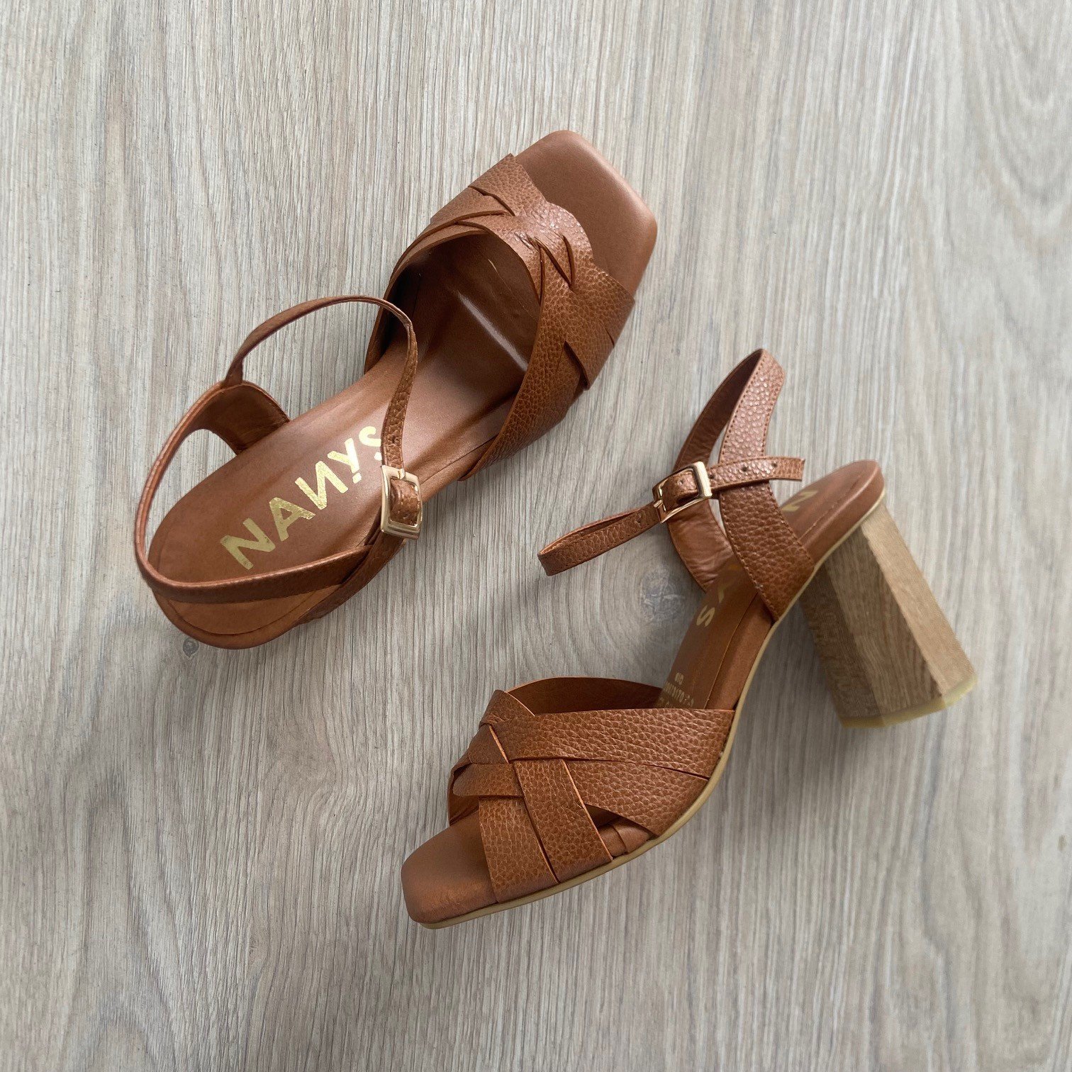 Sandalia alta miel en cuero. Tacón 6.5 en madera. Forradas en cuero. Hechas en Colombia.