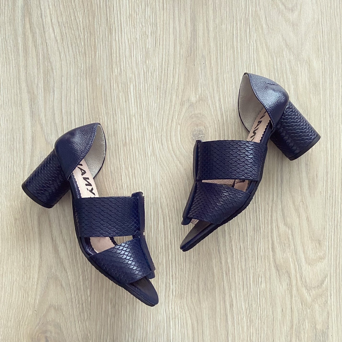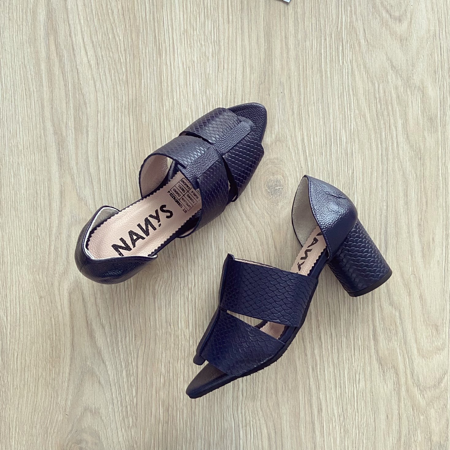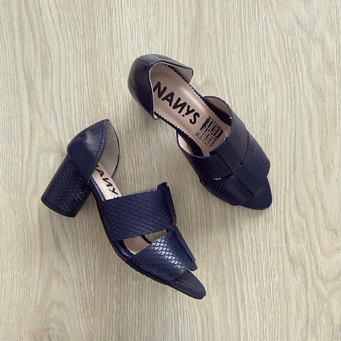 Sandalia azul en cuero con talonera. Tacón 5.5 cm. Forrados en cuero. Hechas en Colombia.