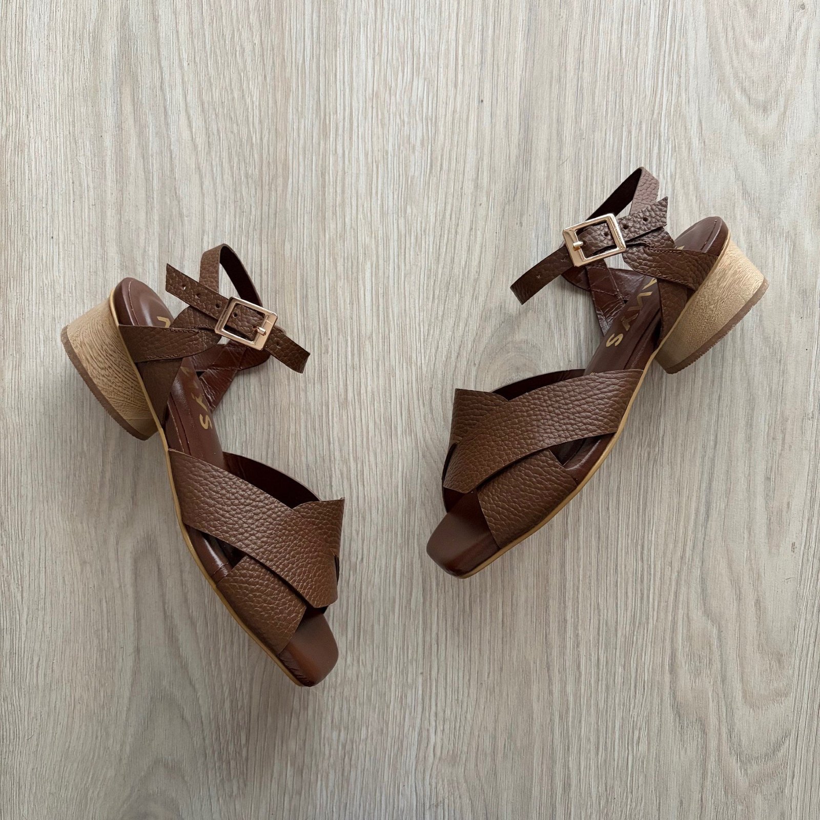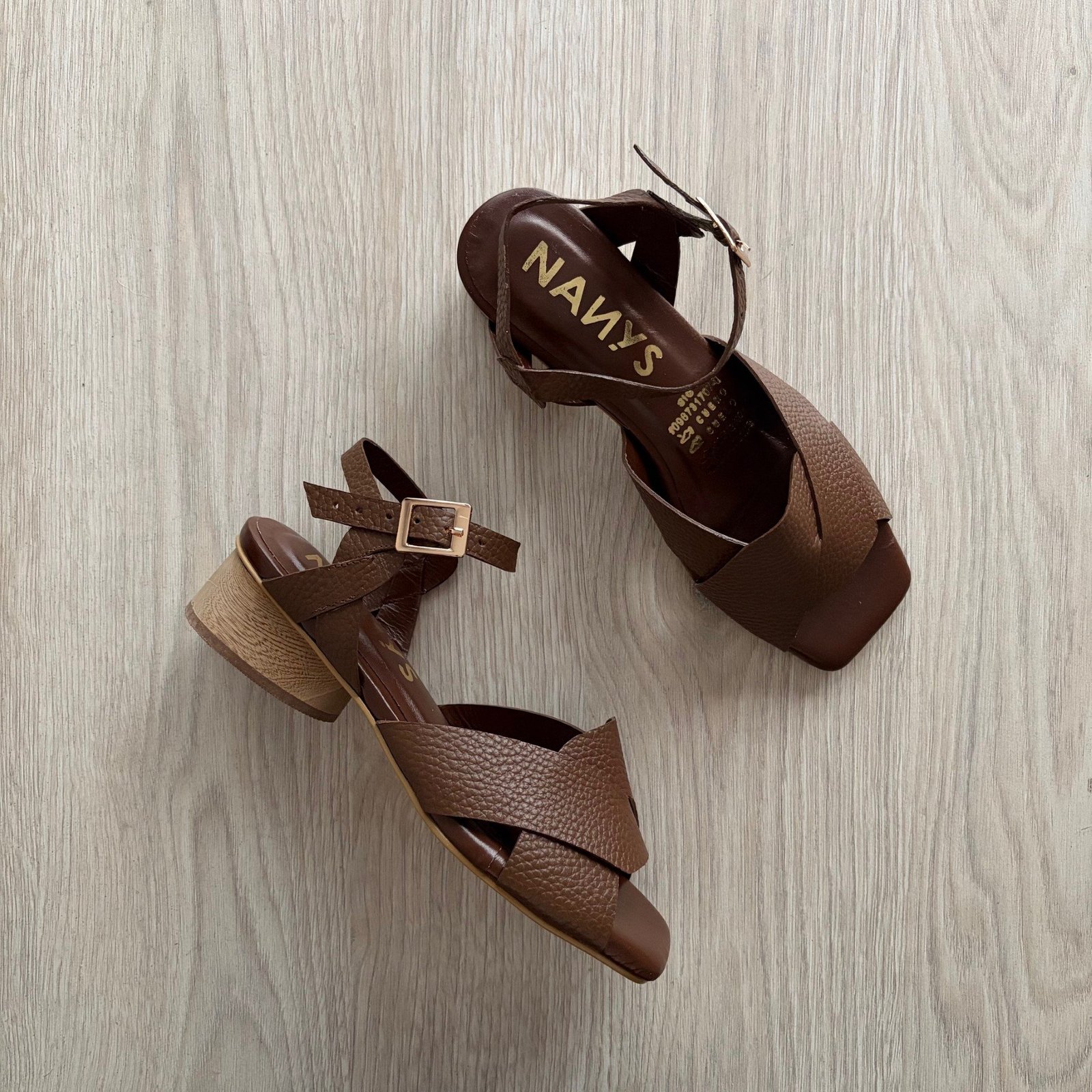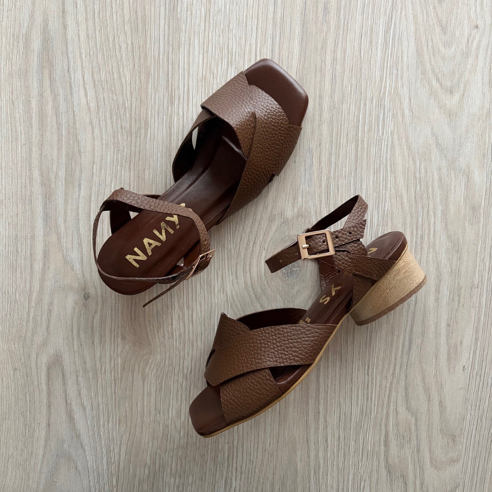 Sandalia cafe en cuero. Tacón 3.5. Forradas en cuero. Hechas en Colombia.
