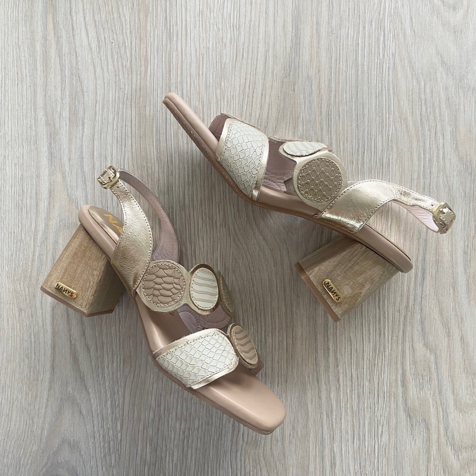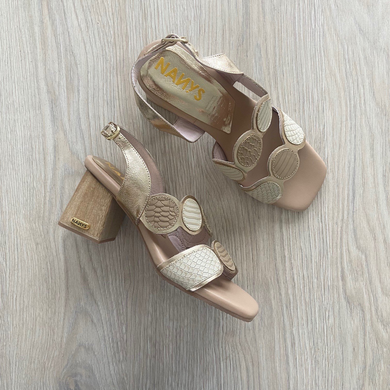Sandalia dorada con taupe con talco en cuero. Tacón 5.5 en madera. Suela en goma antideslizante. Hechos en Colombia.