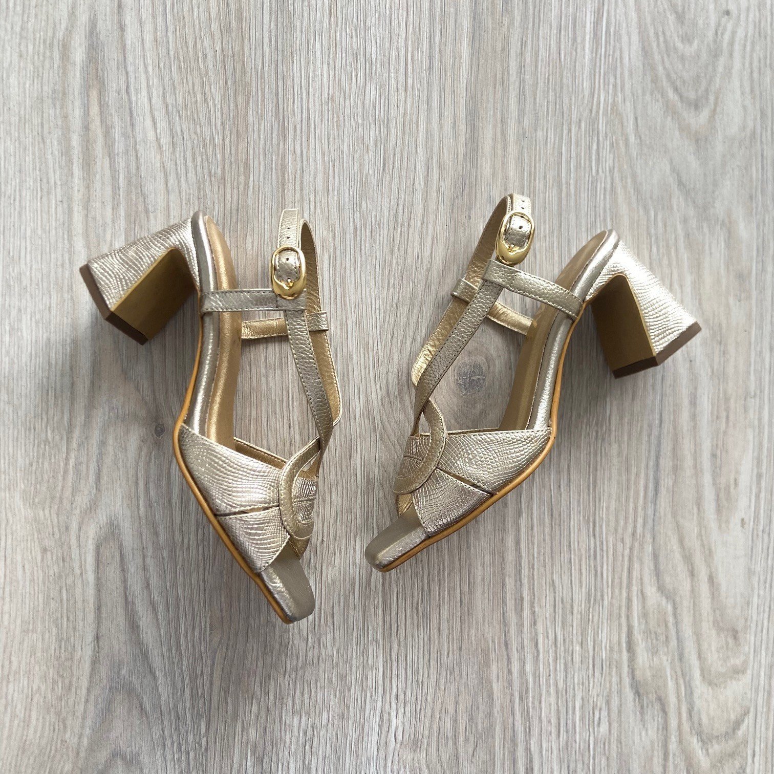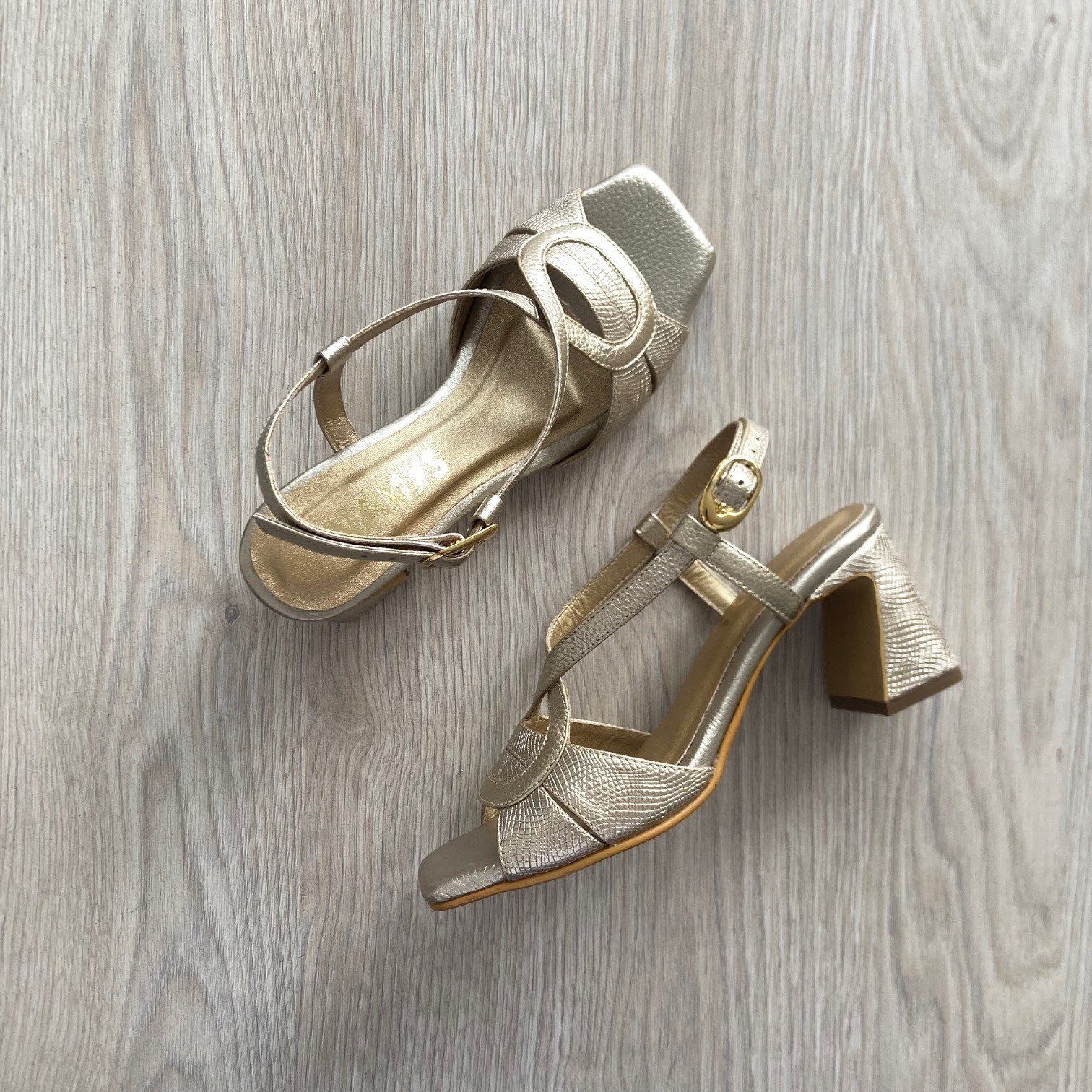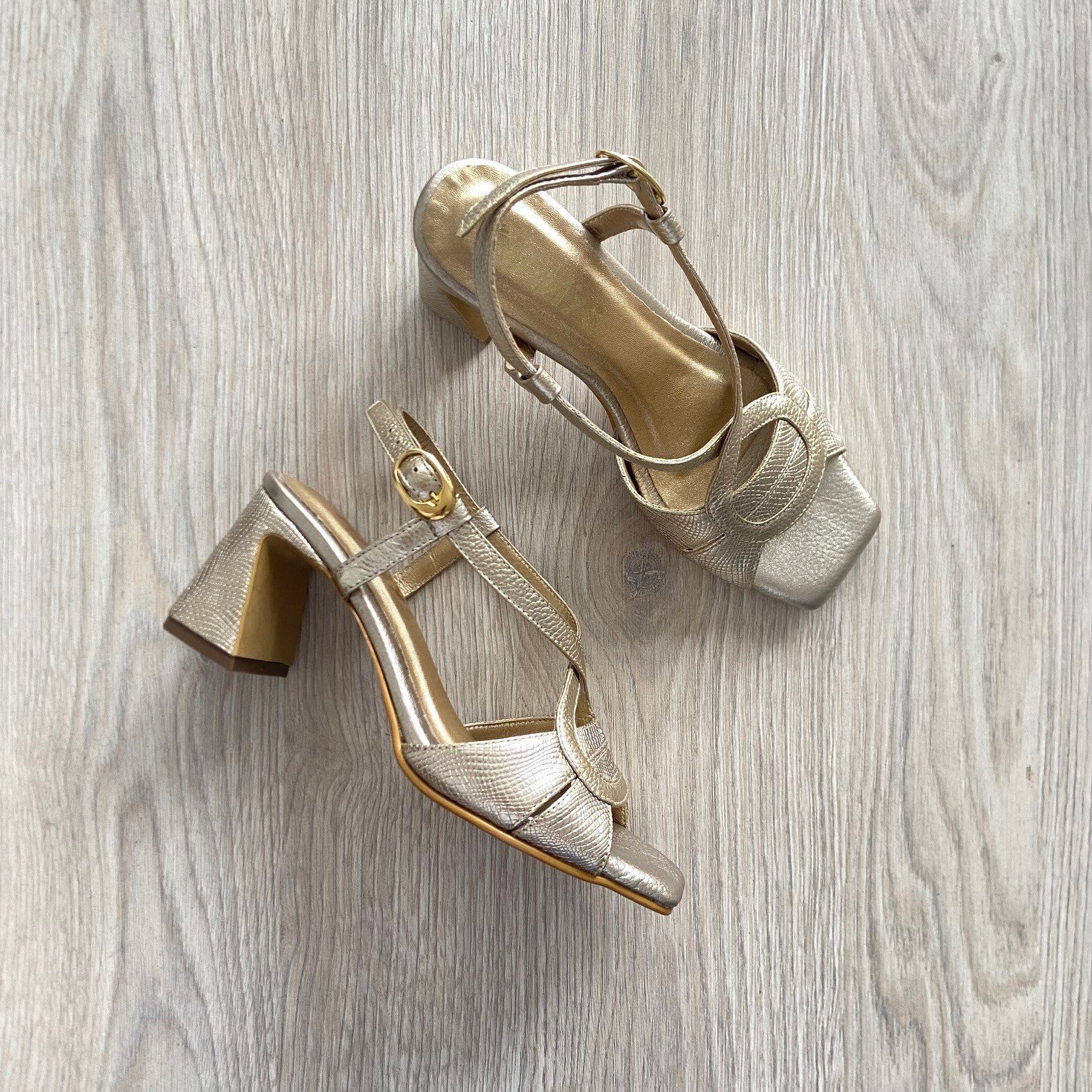 Sandalia dorada cruzada en cuero. Tacón 5.5. Forradas en cuero. Hechas en Colombia.