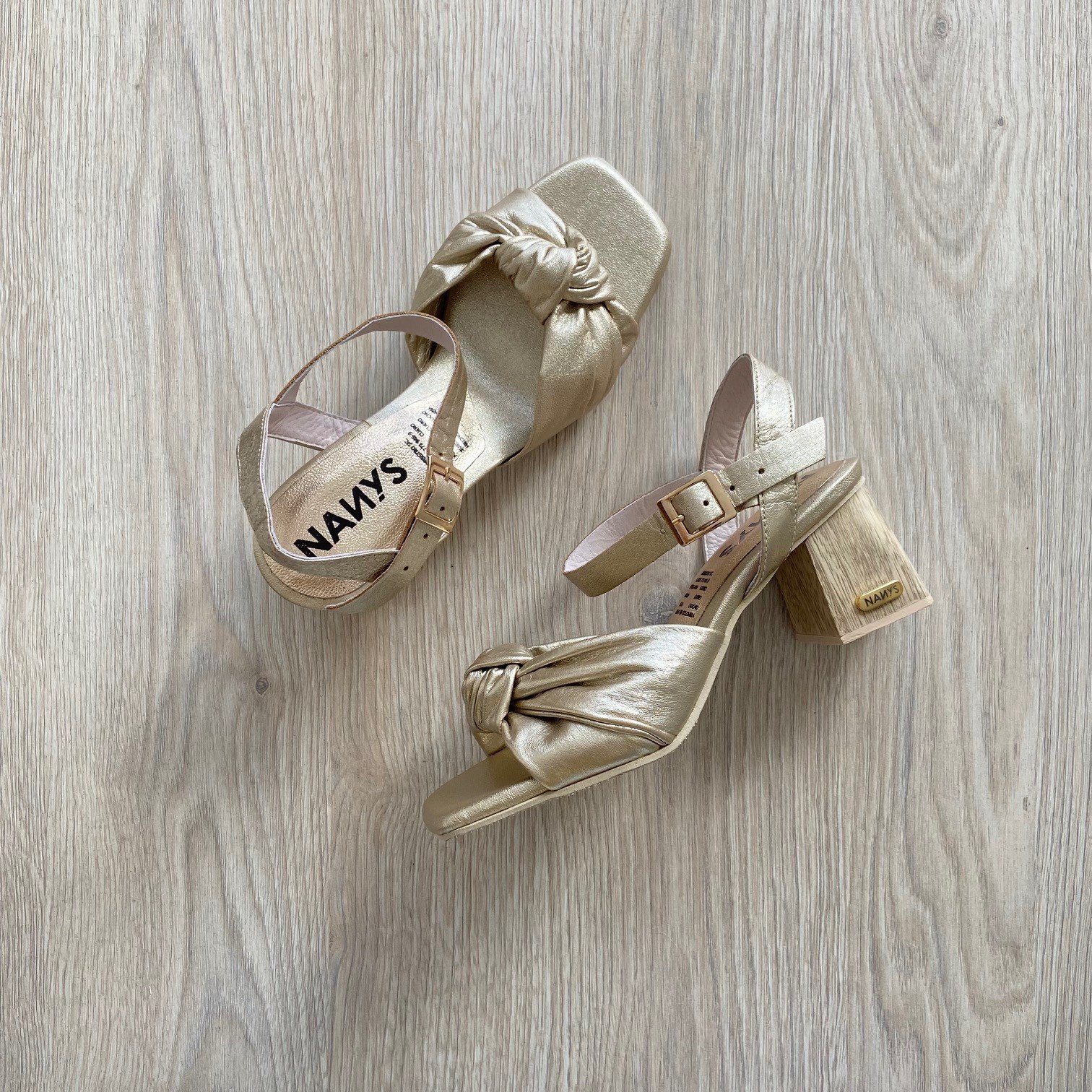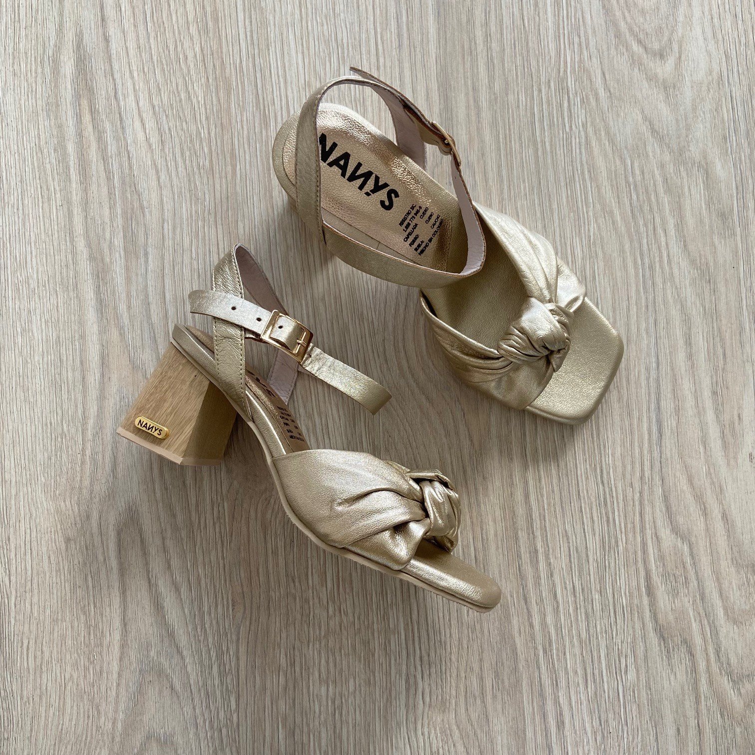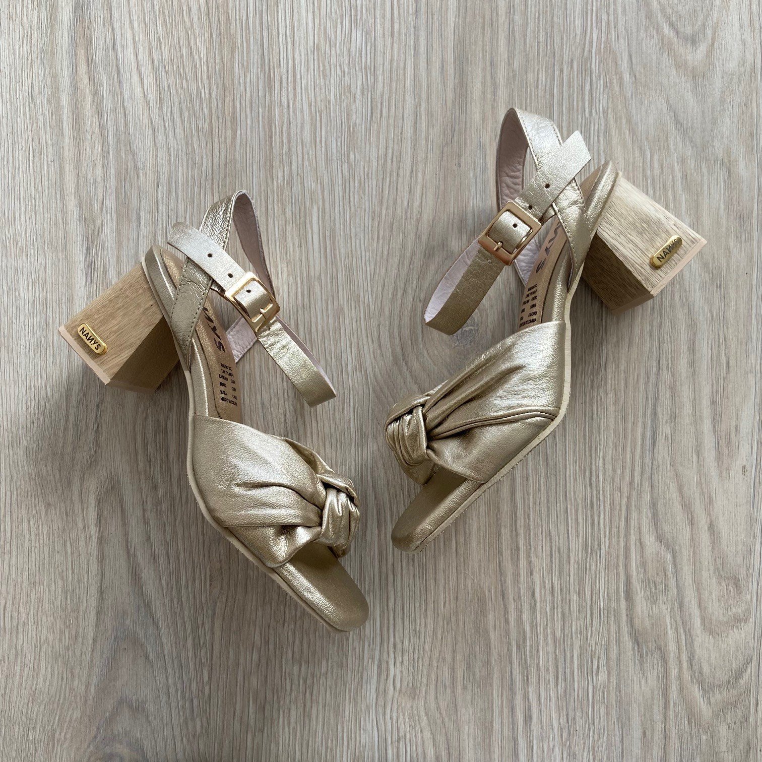 Sandalia dorada en cuero. Con suela en goma antideslizante. Tacón en madera 5.5 cm. Forradas en cuero. Hechos en Colombia.