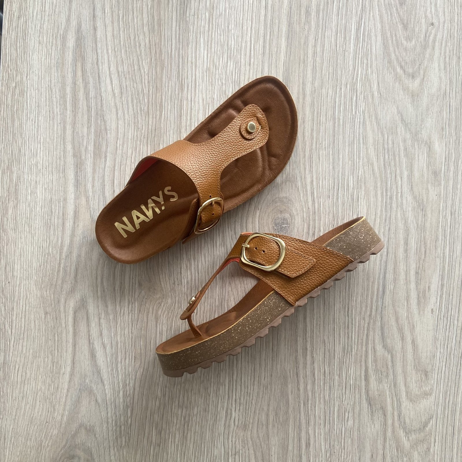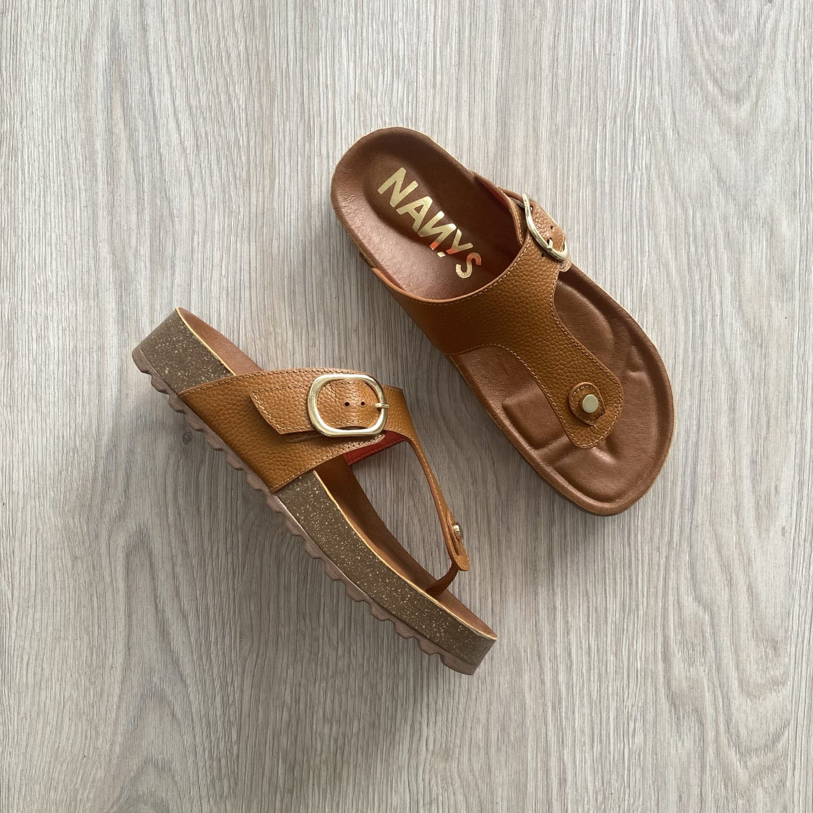 Sandalia miel en cuero. Capellada forrada en salmón y plantilla en cuero tipo badana. Hechas en Colombia.