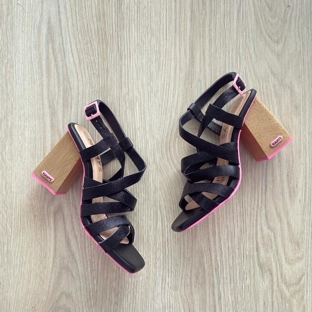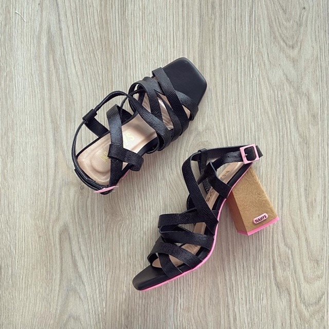 Sandalia negras de tiras en cuero con rosado
