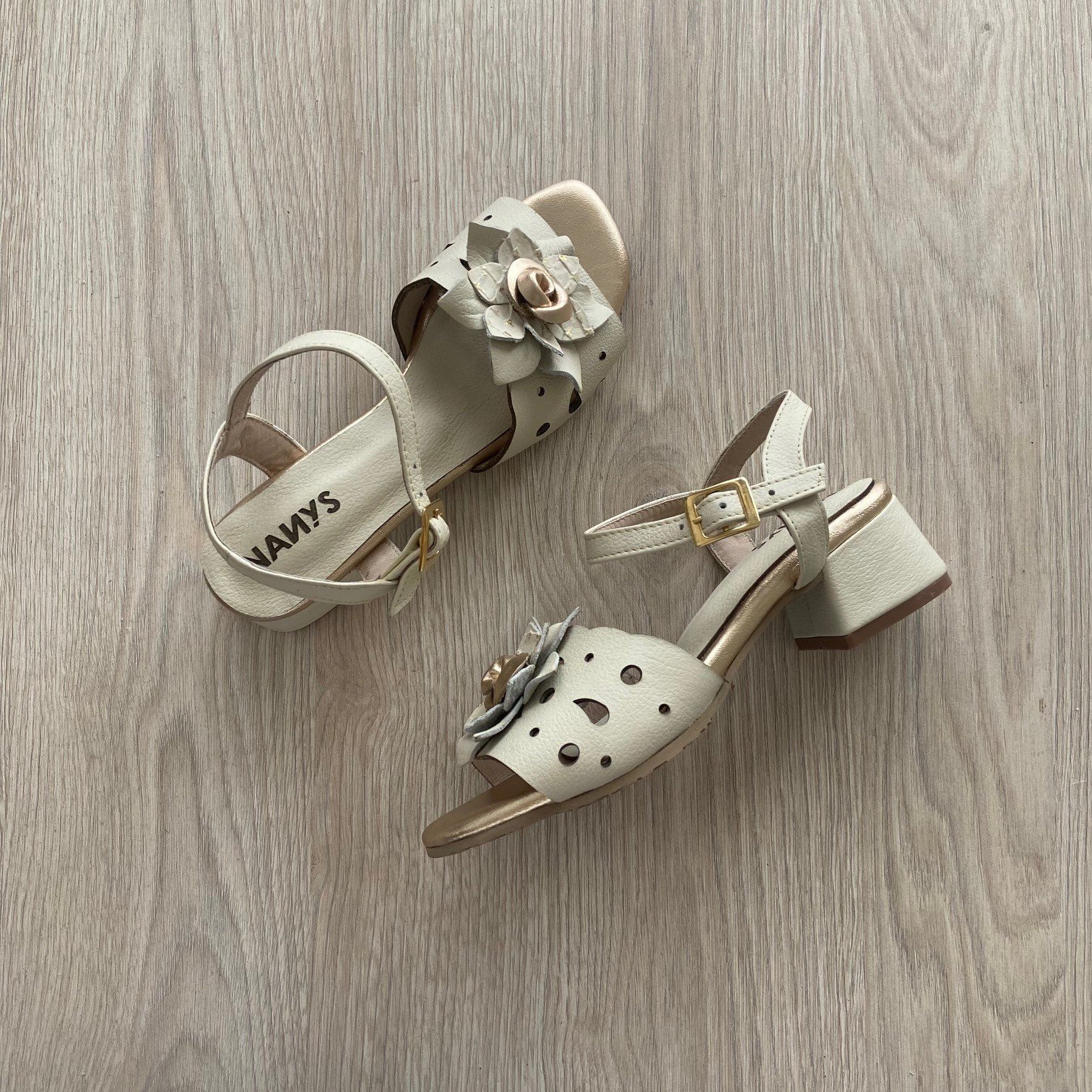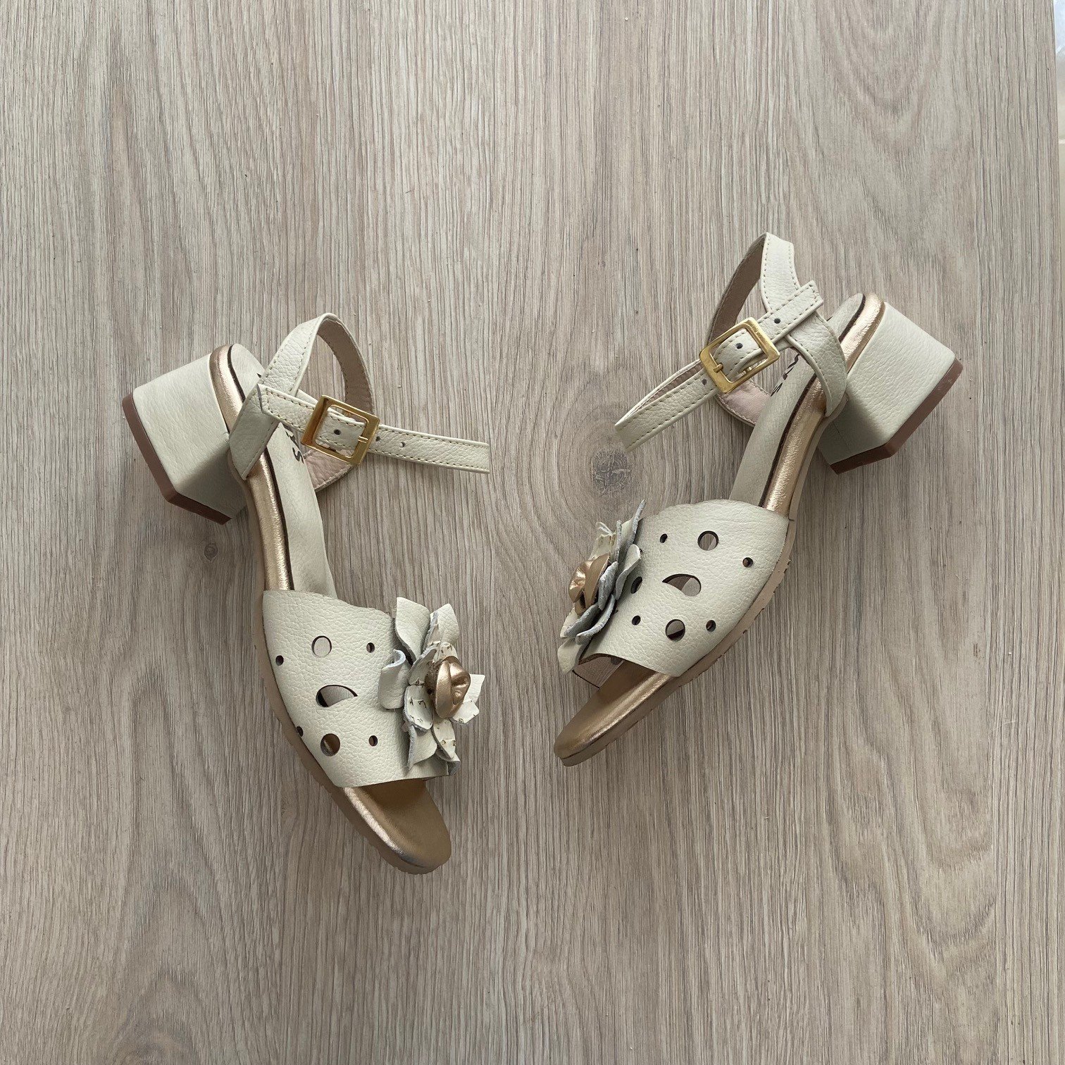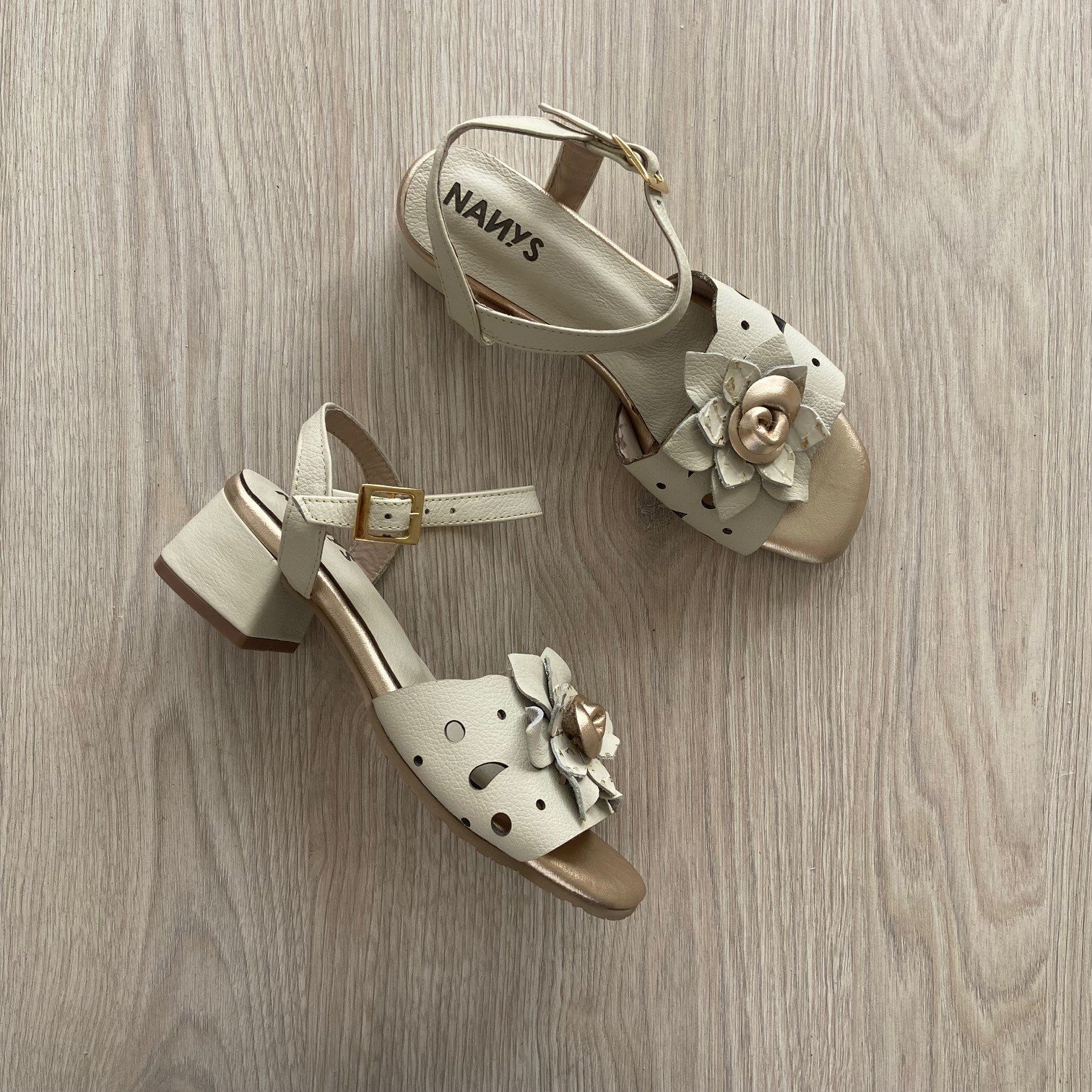 Sandalia talco con dorado en cuero con flor. Tacón 3.5. Suela en goma. Forradas en cuero. Hechas en Colombia.