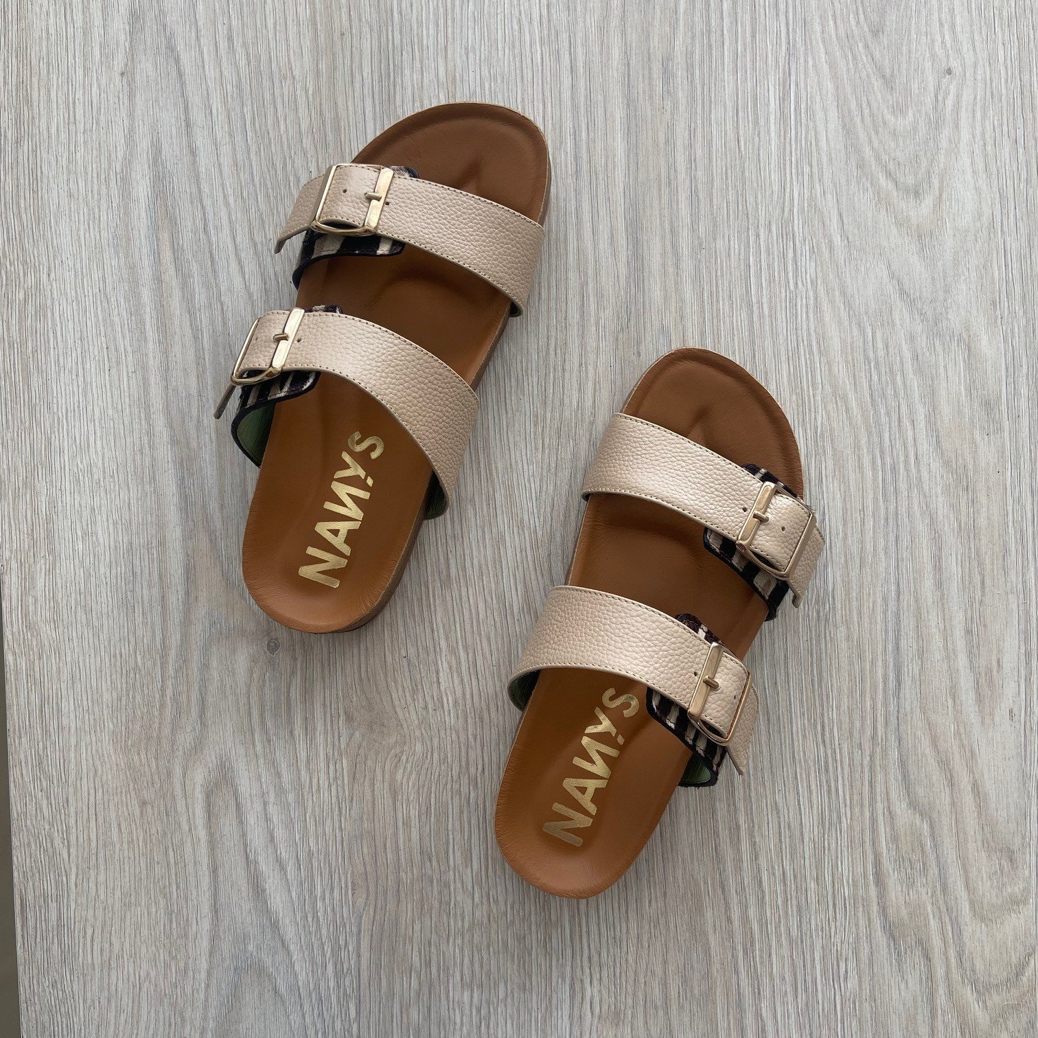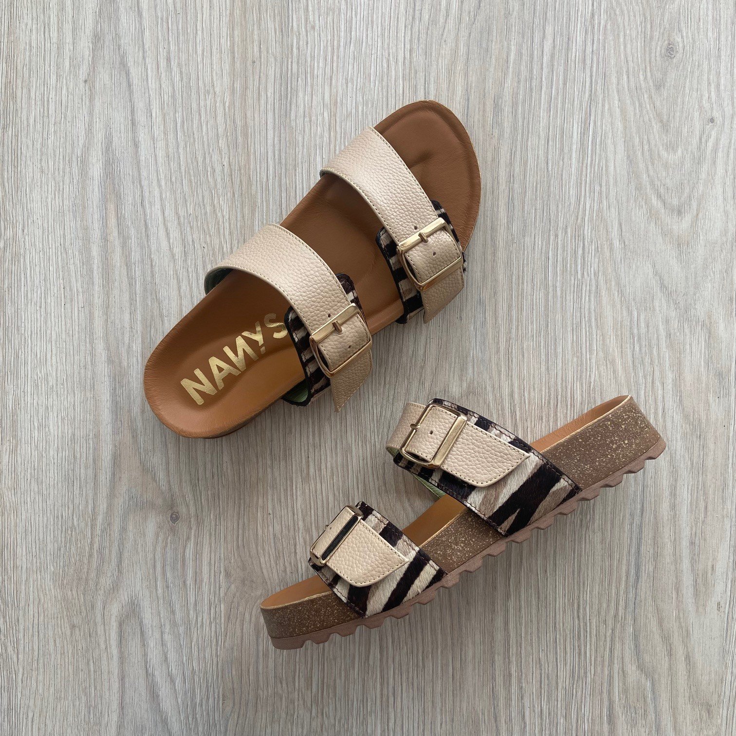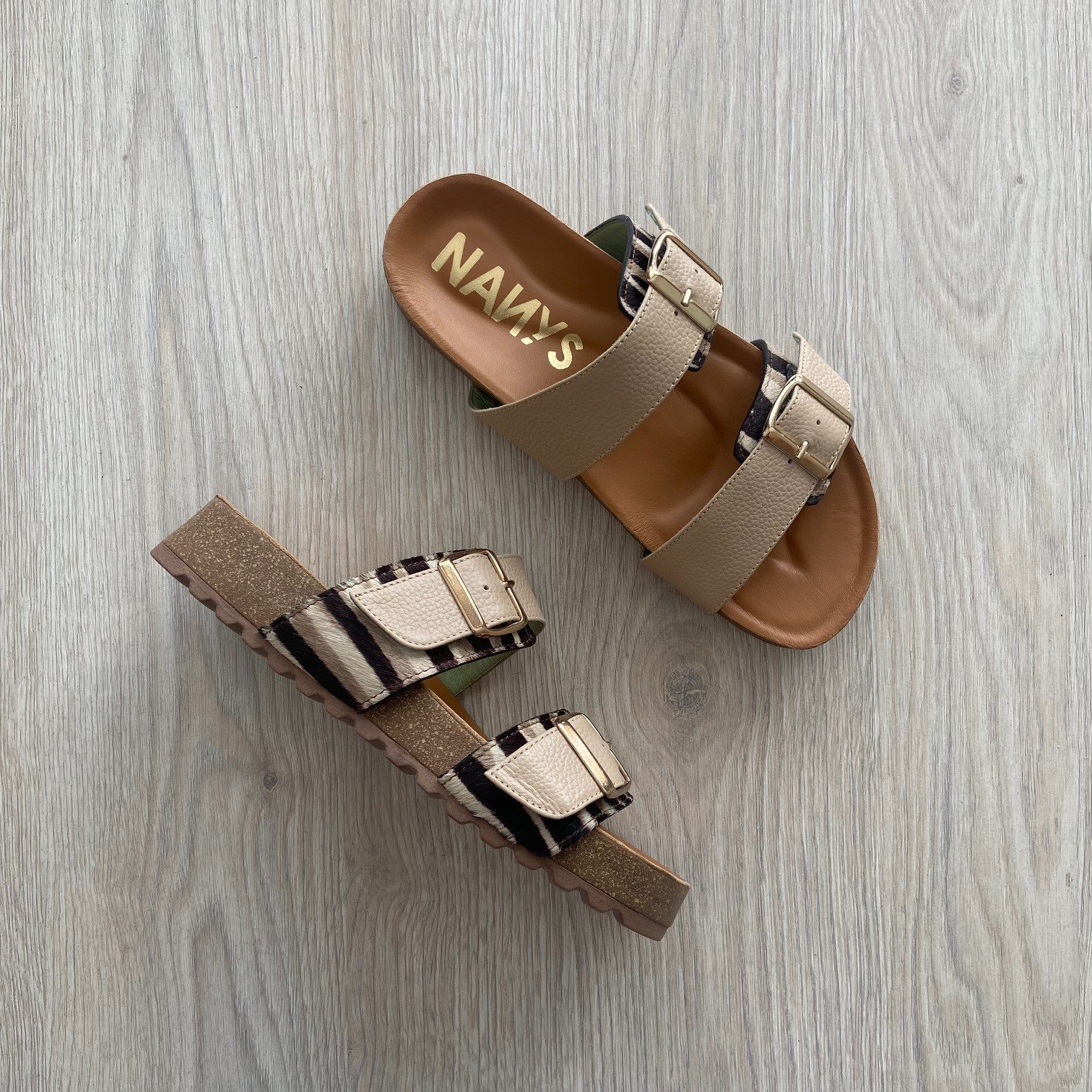 Sandalia taupe con animal print en cuero con dos hebillas que permiten graduar. Capellada forrada en salmón y plantilla en cuero tipo badana. Hechas en Colombia.