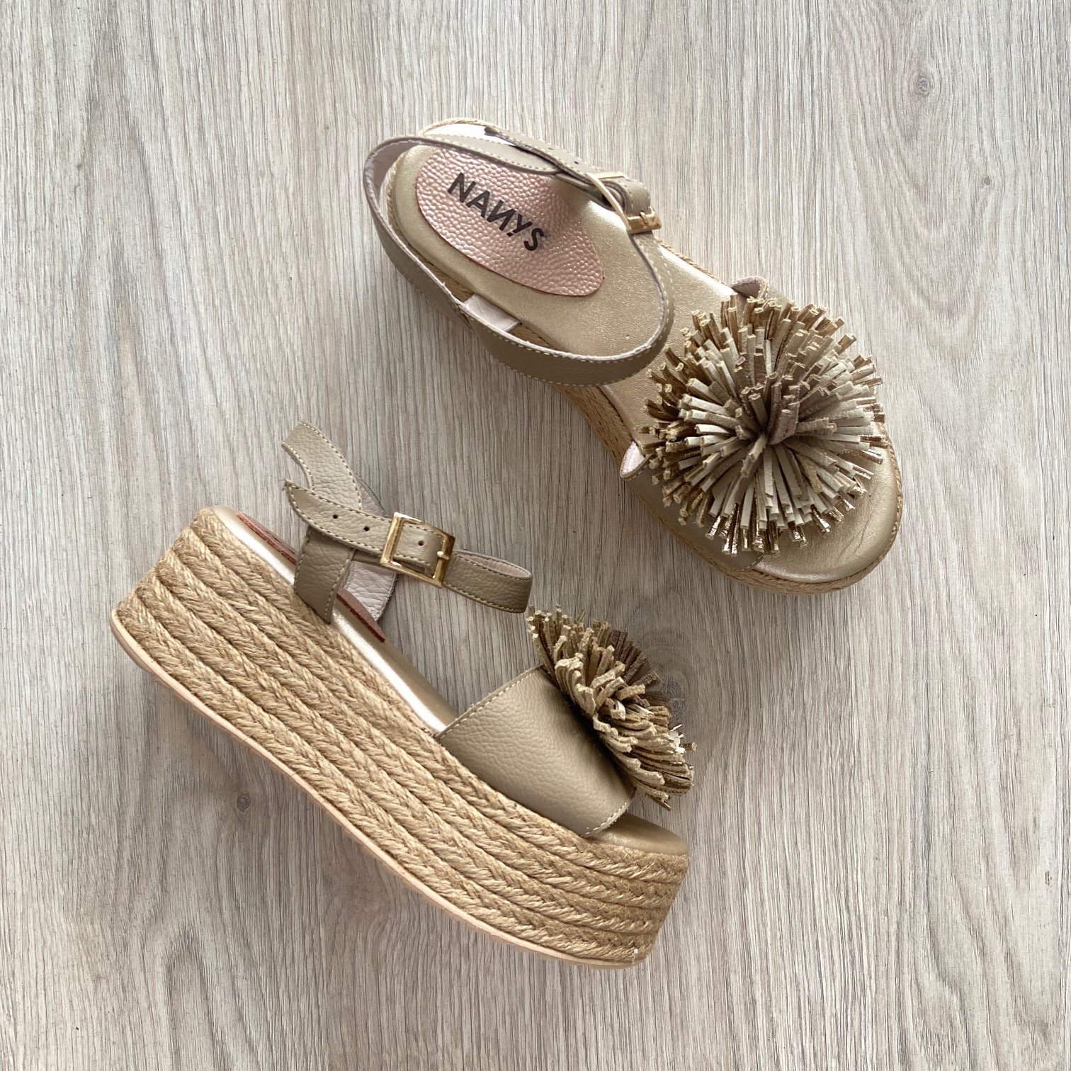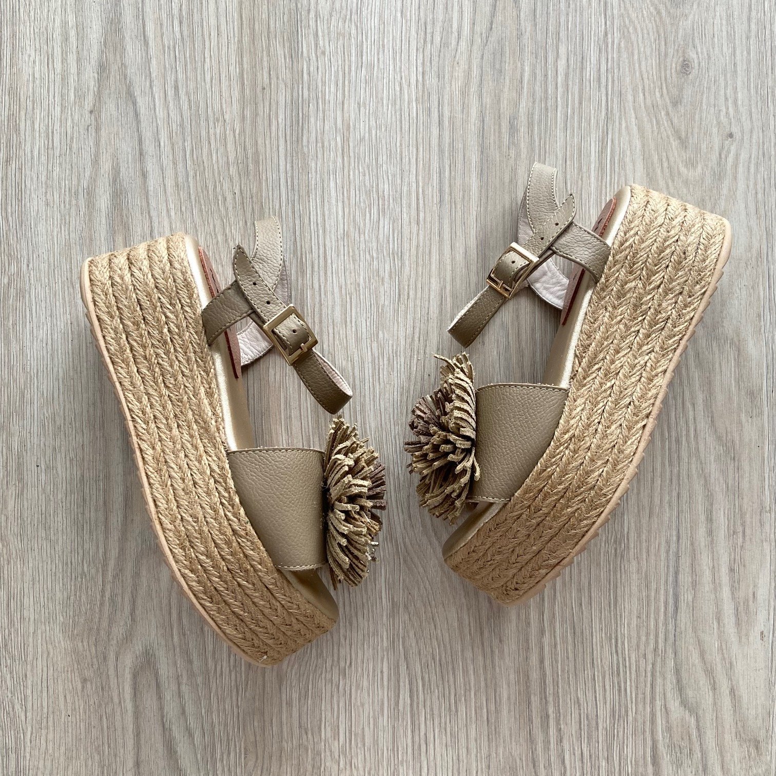 Sandalia taupe en cuero con pompon dorado, talco y taupe. Con plataforma en yute. 5.5. Forradas en cuero. Hechas en Colombia.