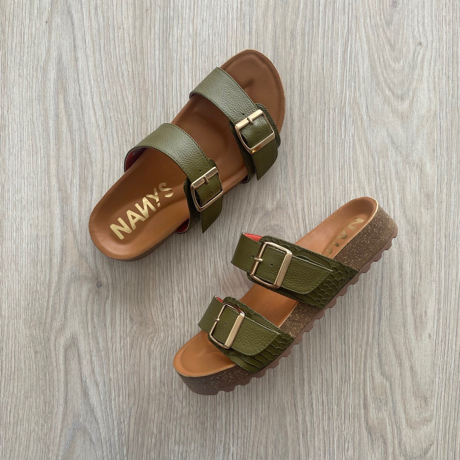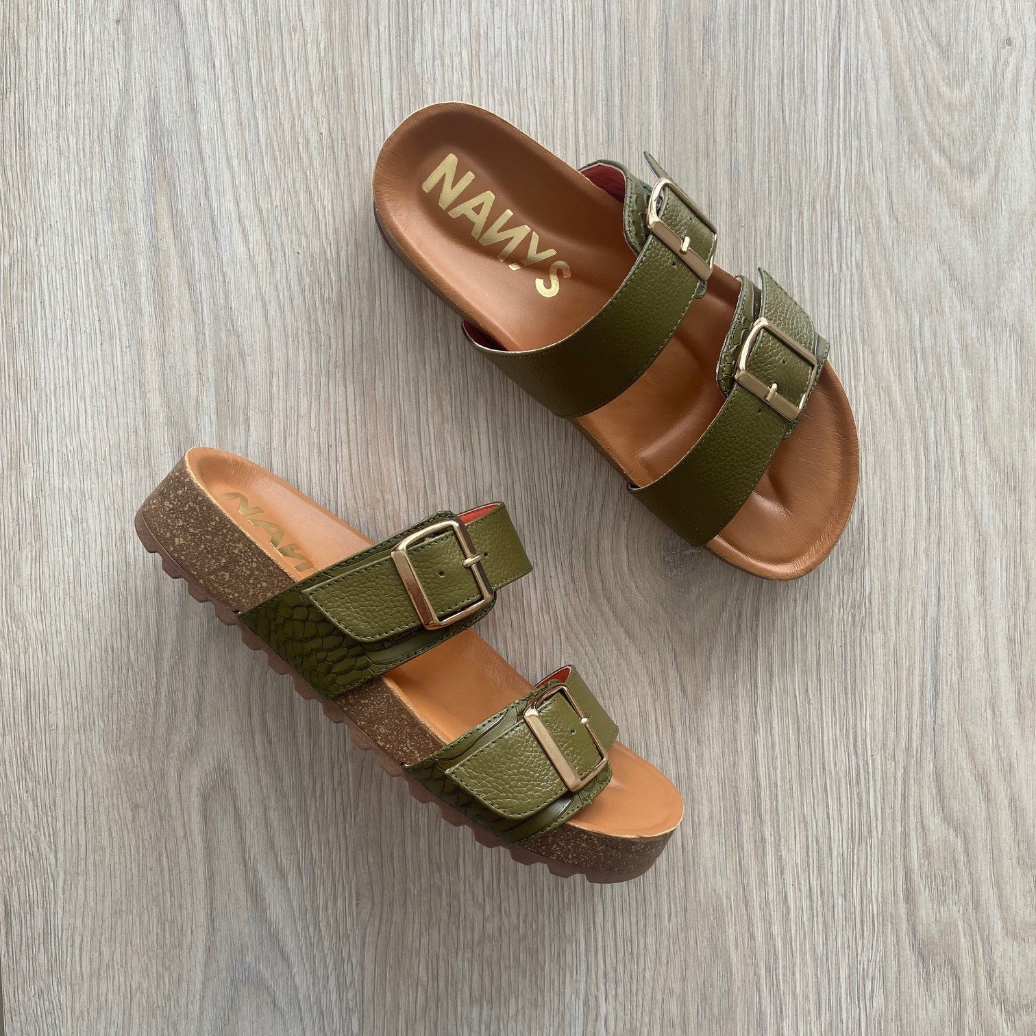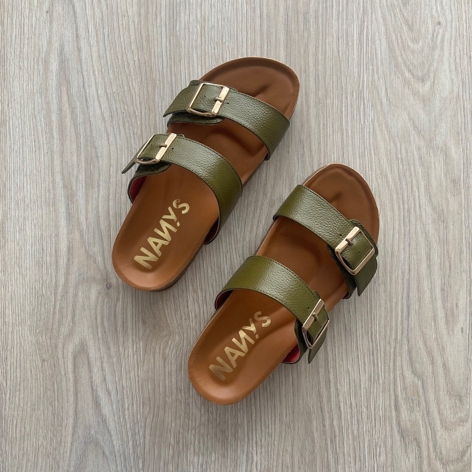 Sandalia verde en cuero con dos hebillas que permiten graduar. Capellada forrada en salmón y plantilla en cuero tipo badana. Hechas en Colombia.