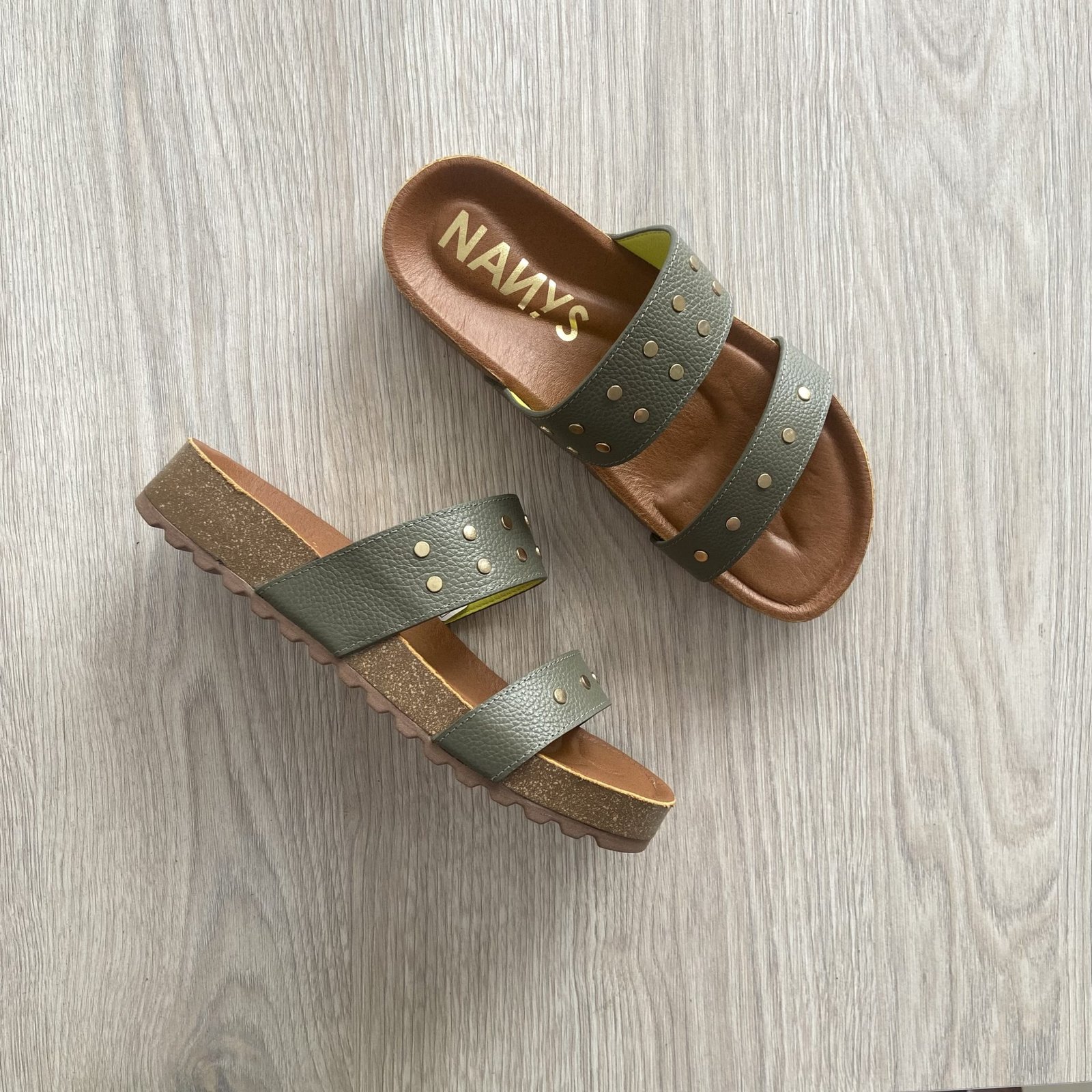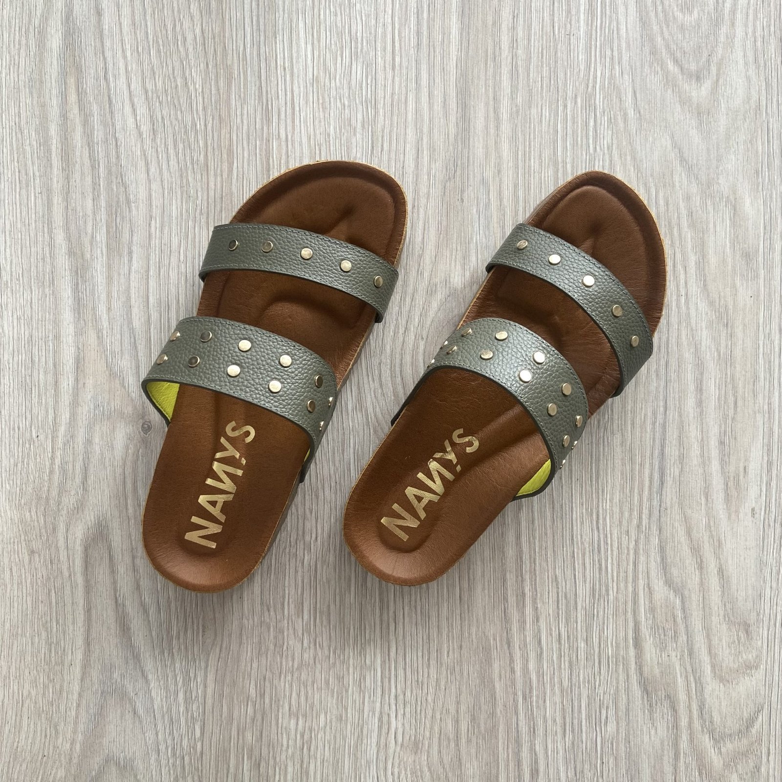 Sandalia verde pino en cuero de dos tiras anchas con taches. Capellada forrada en verde lima y plantilla en cuero tipo badana. Hechas en Colombia.