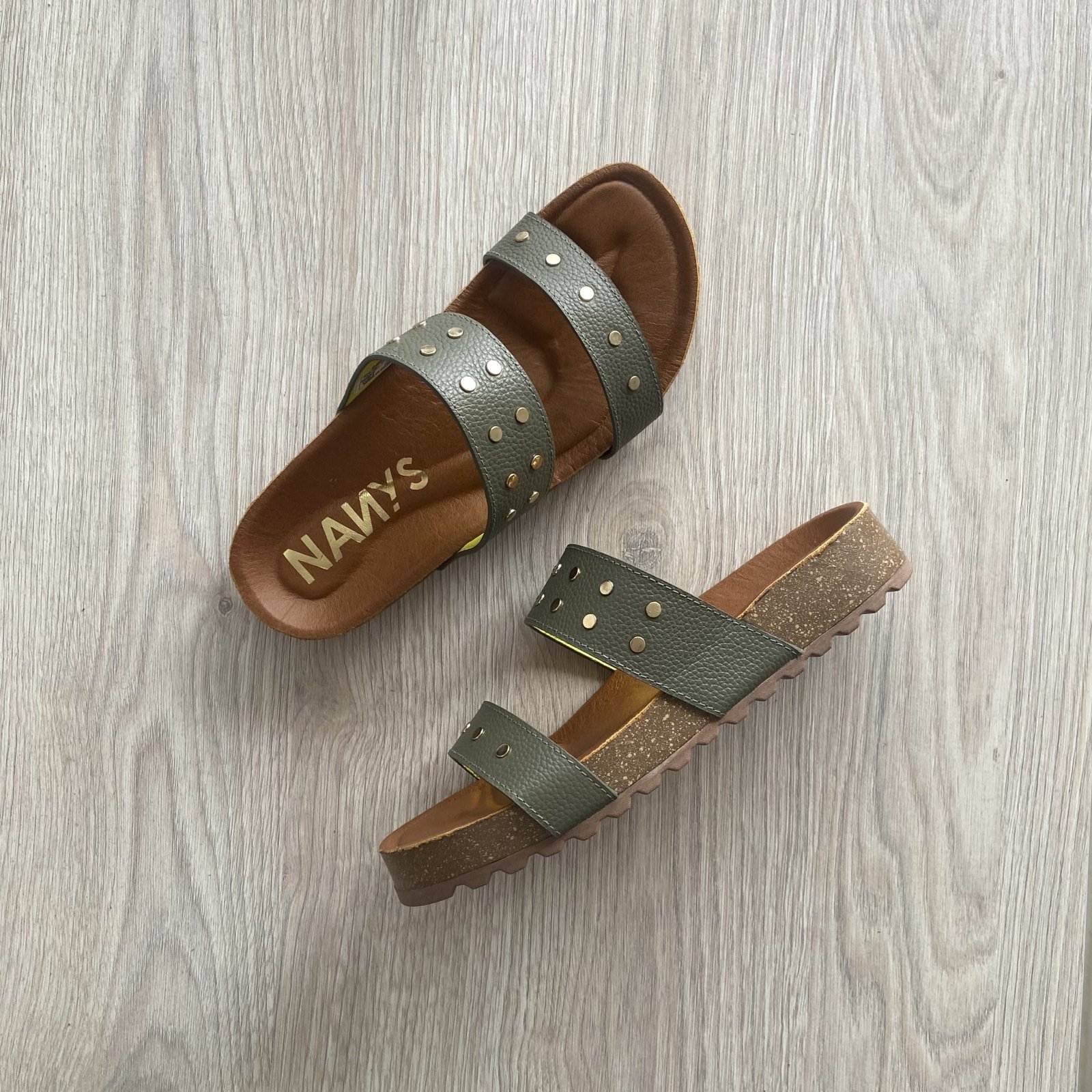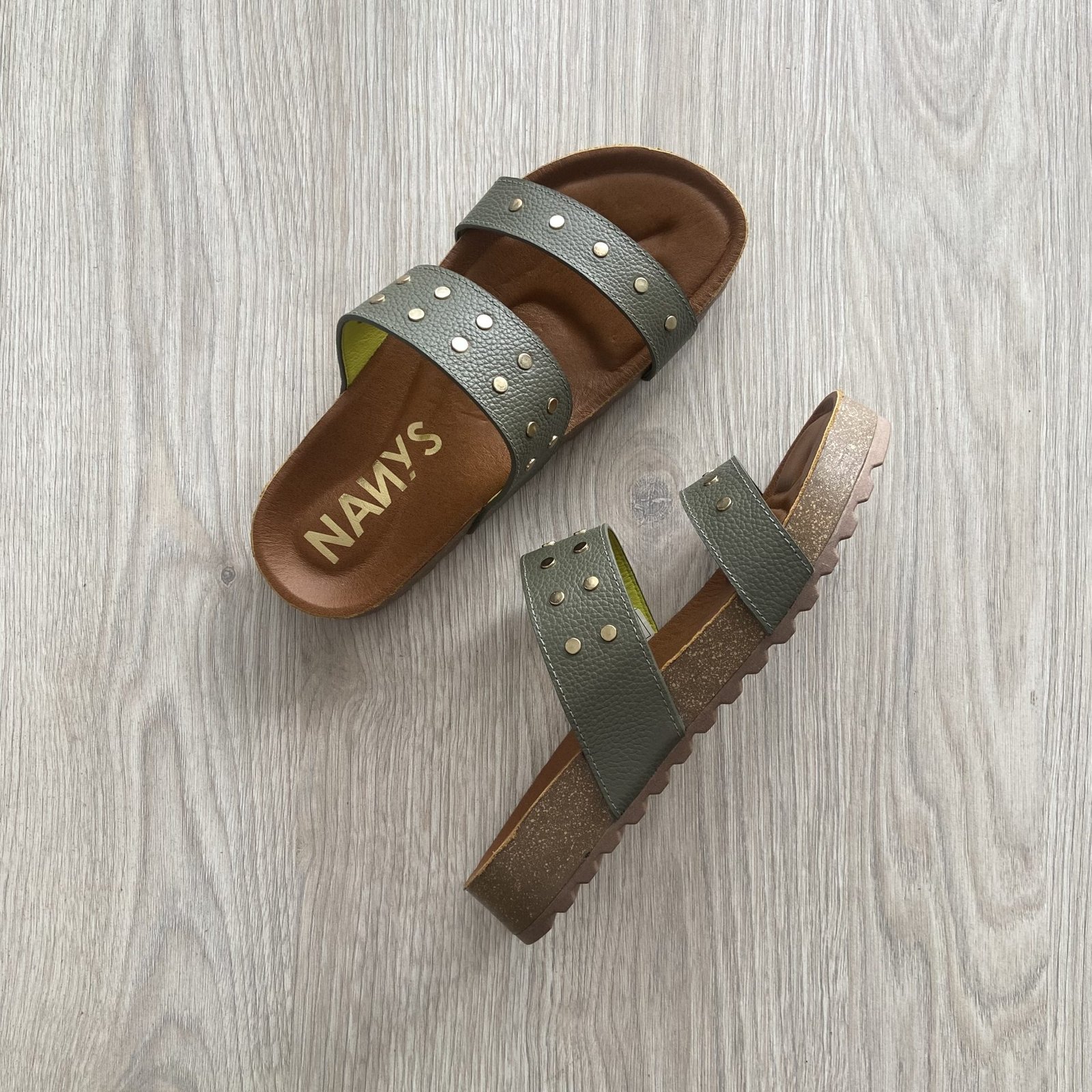 Sandalia verde pino en cuero con taches